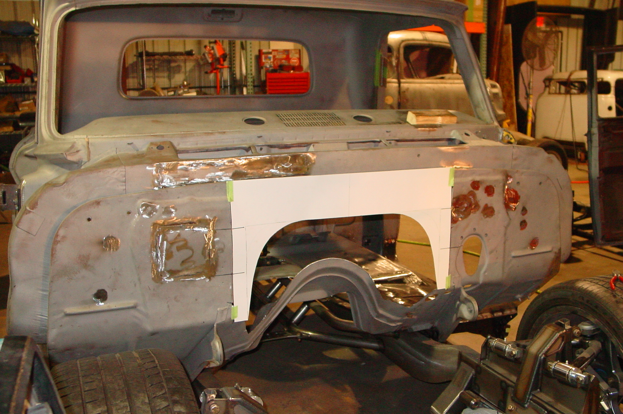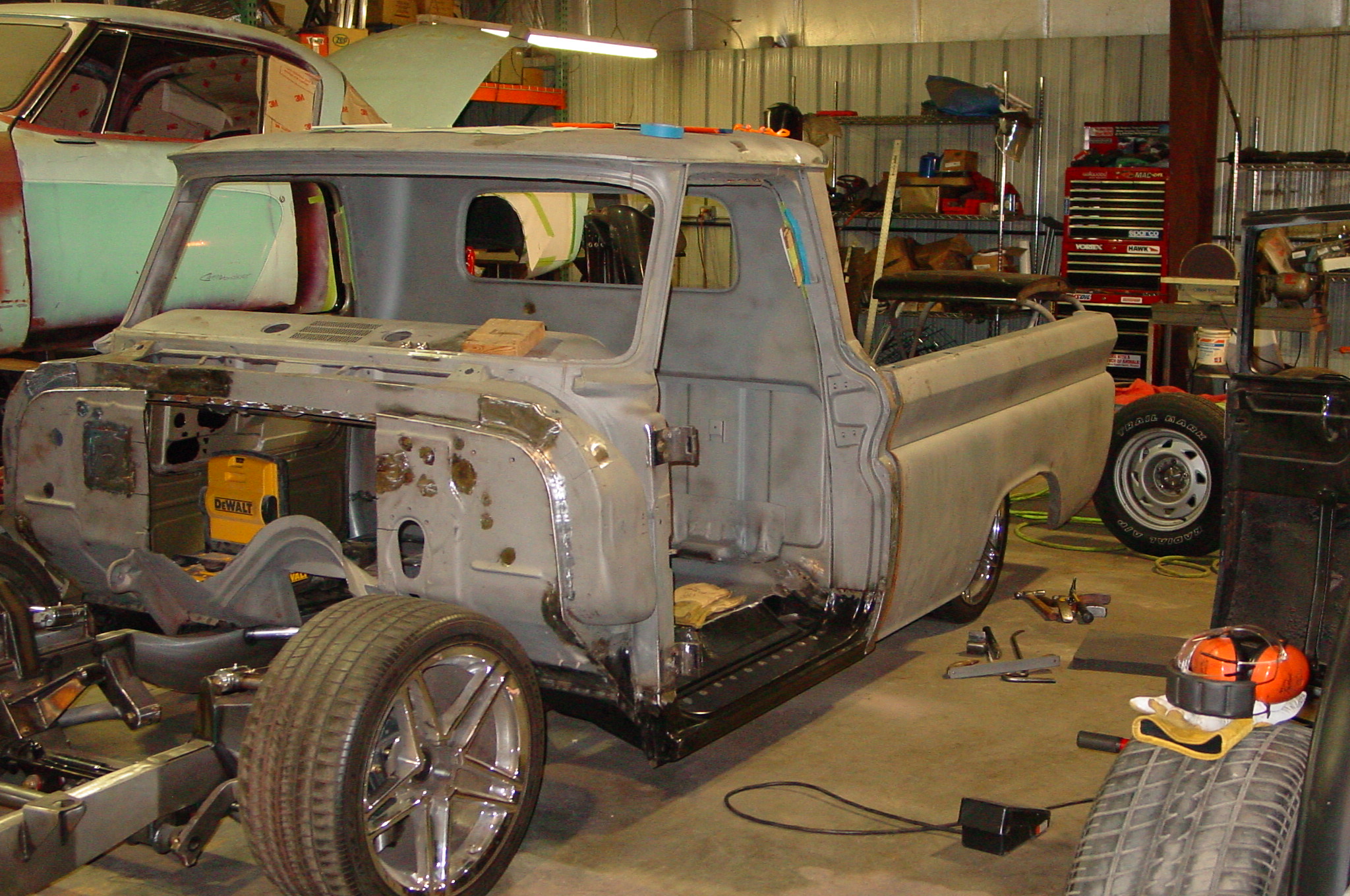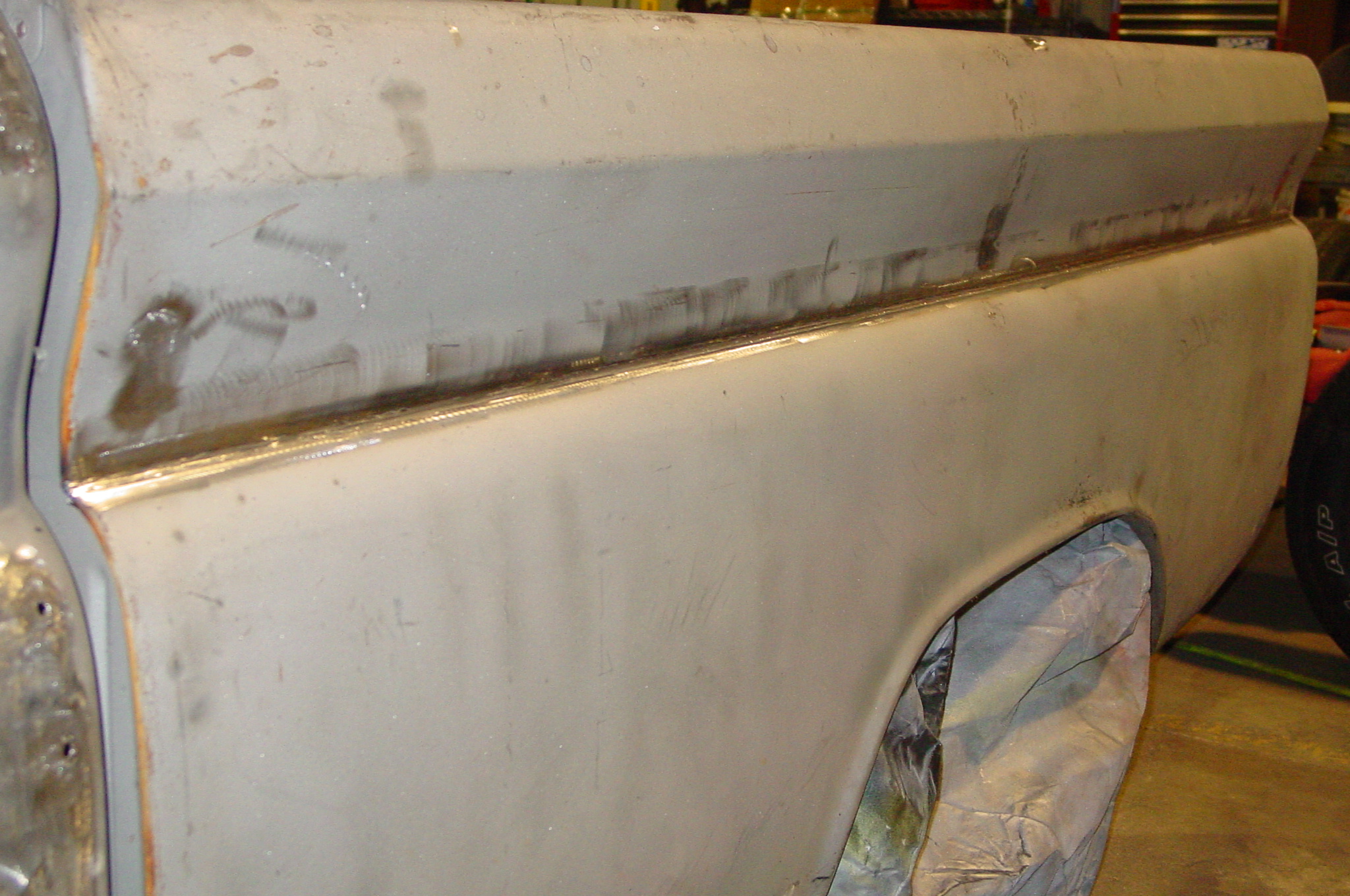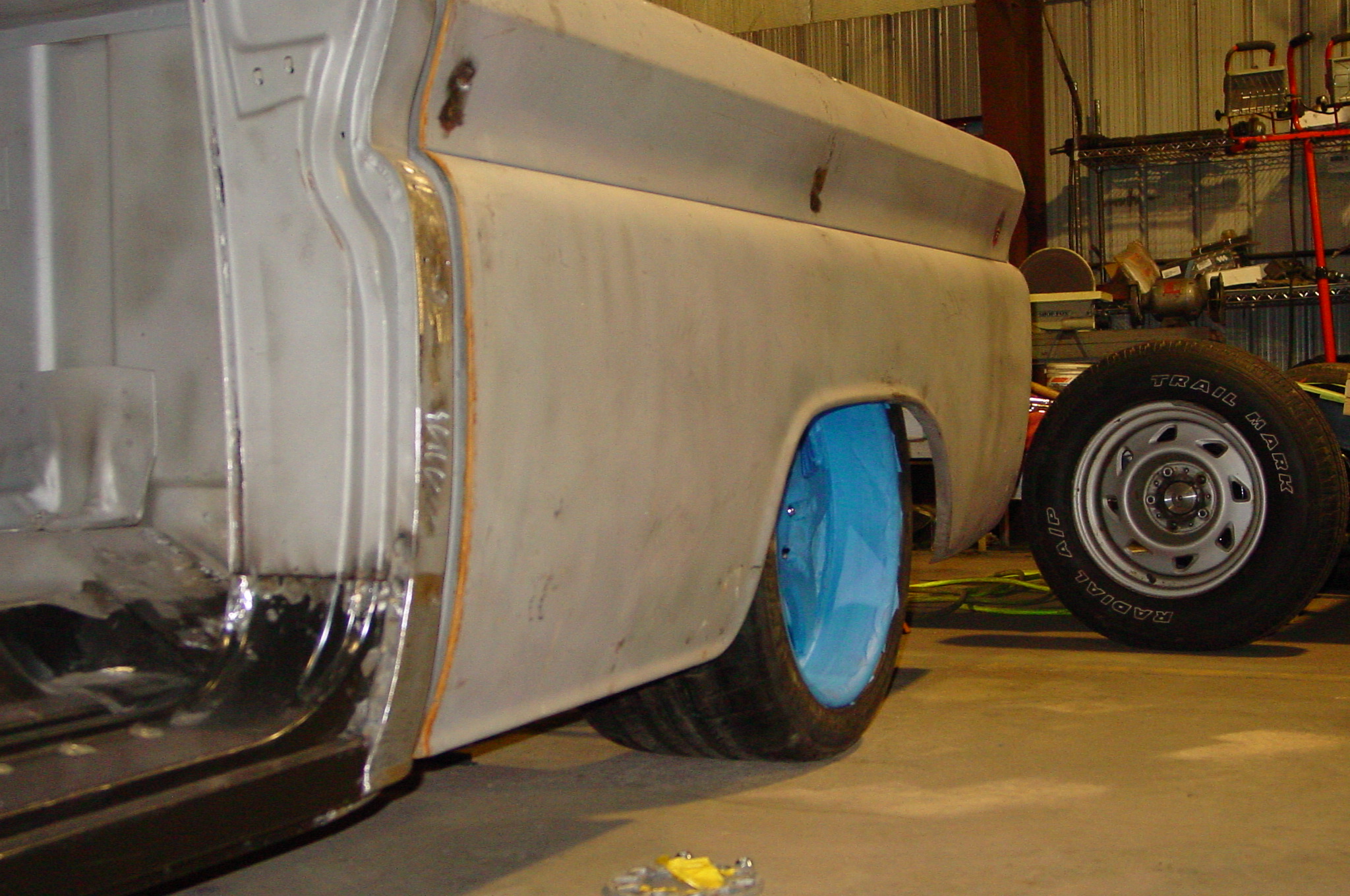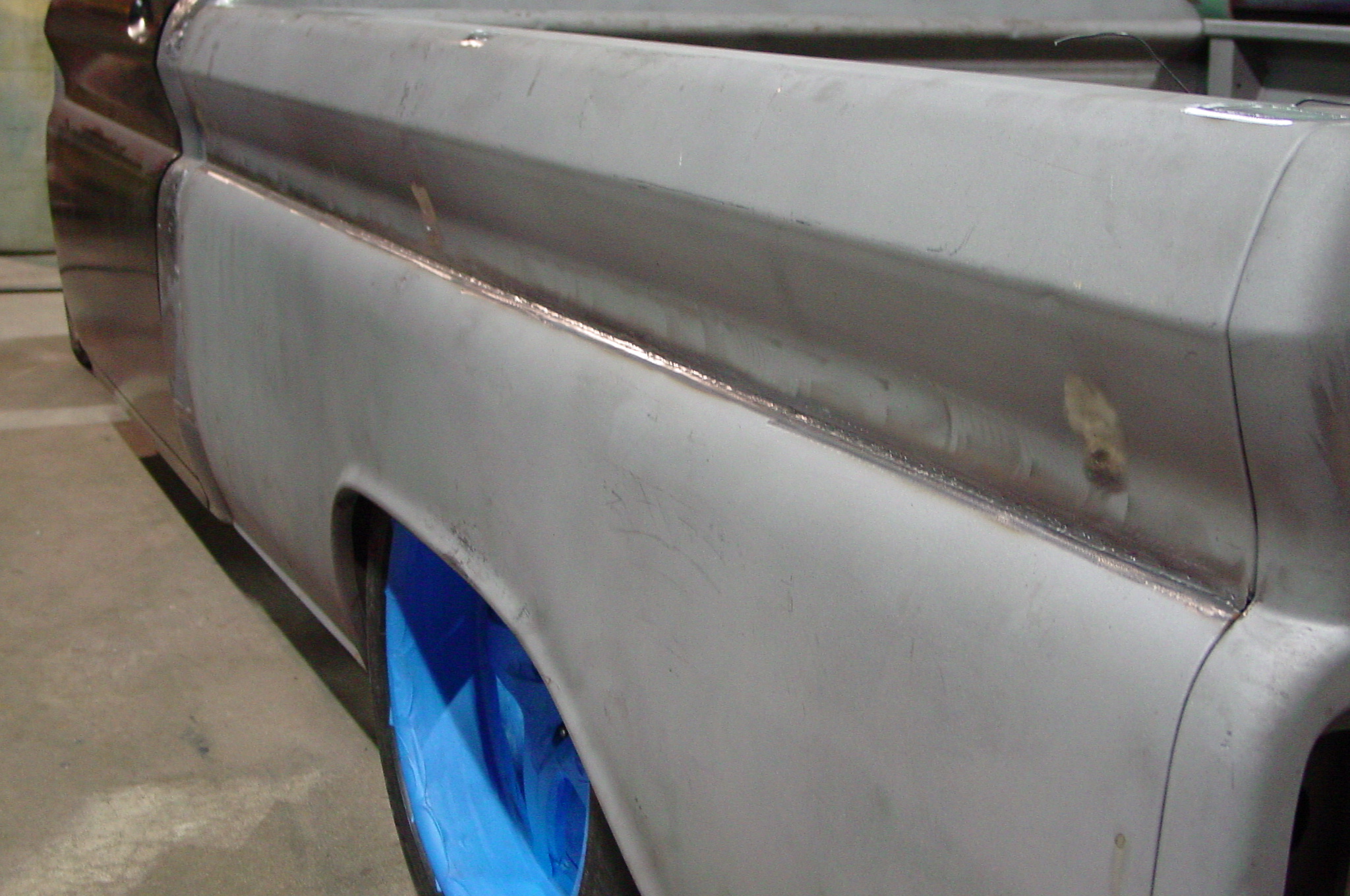 After blasting the old paint off we found a lot of filler over the rust holes. We removed the old rusted metal and replaced them with new steel. Now that the body is solid, the modifications have begun. -- Firewall, inner fenders, front fenders, front bumper, rear bumper, tailgate, and rear wheel opening.