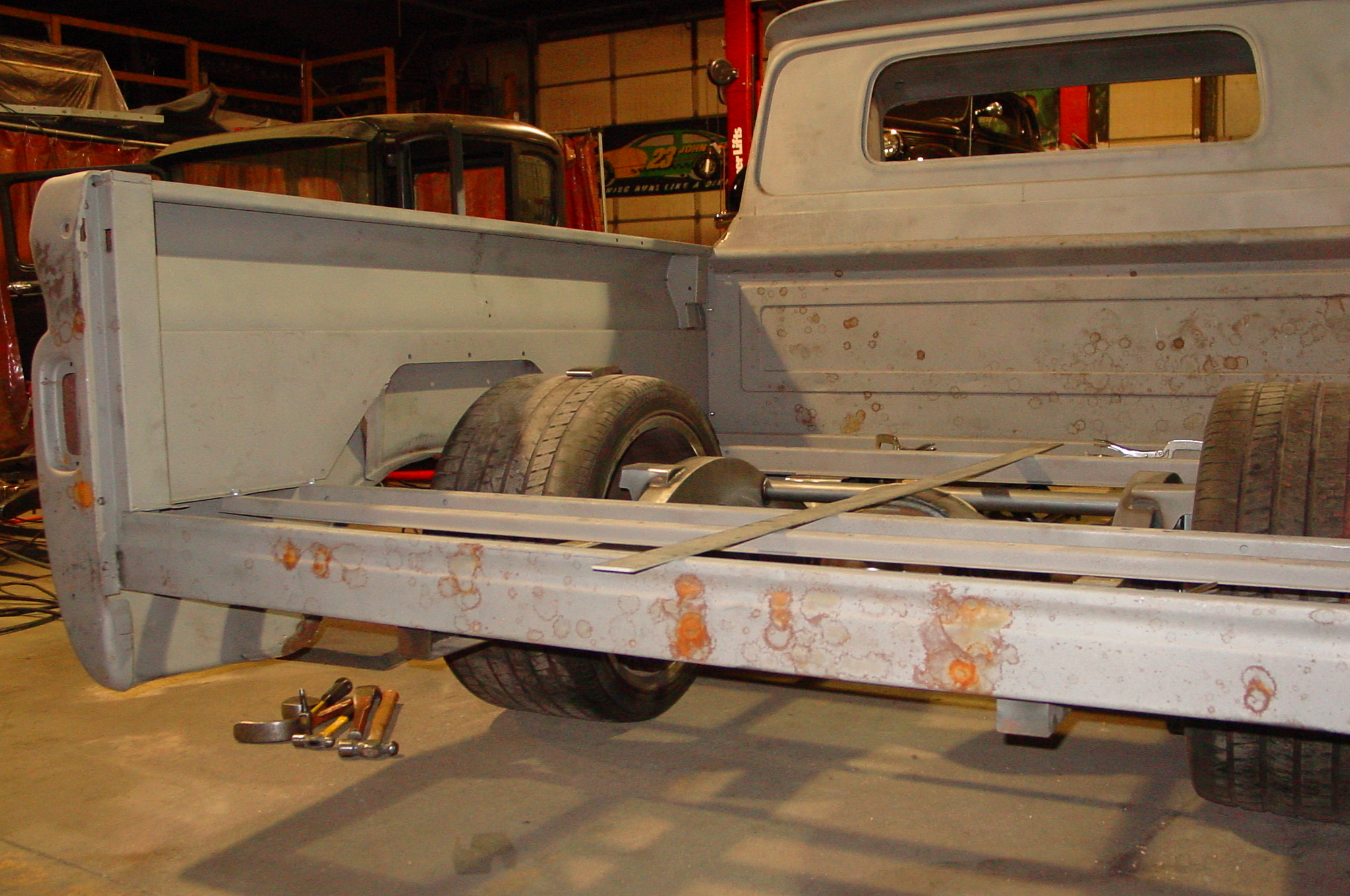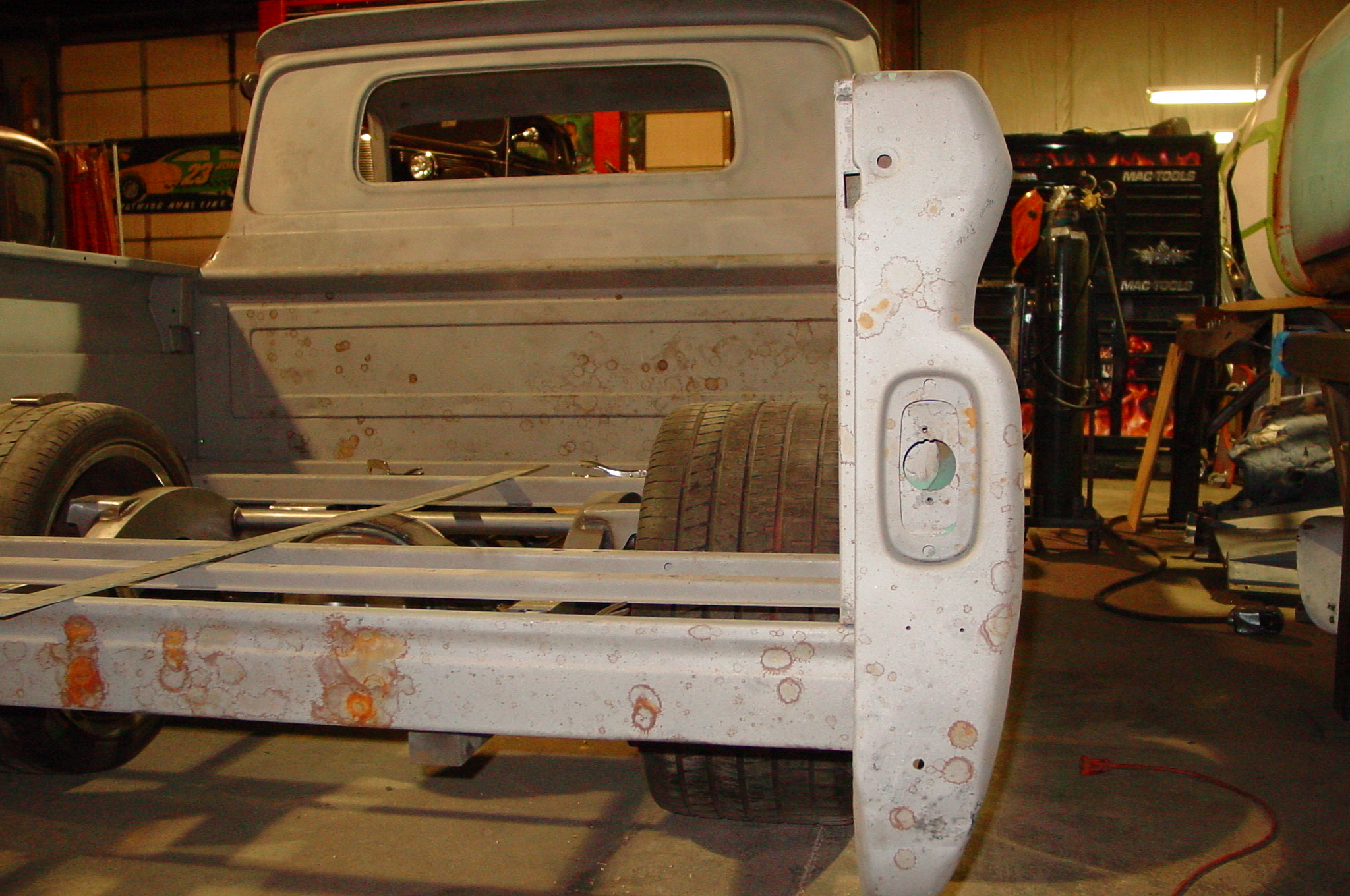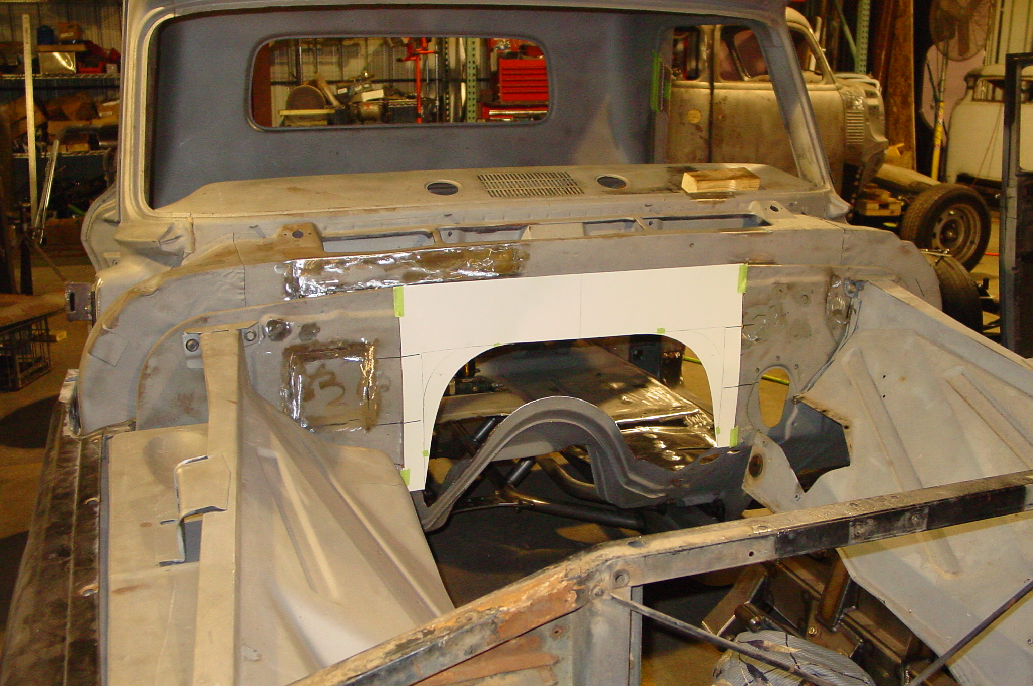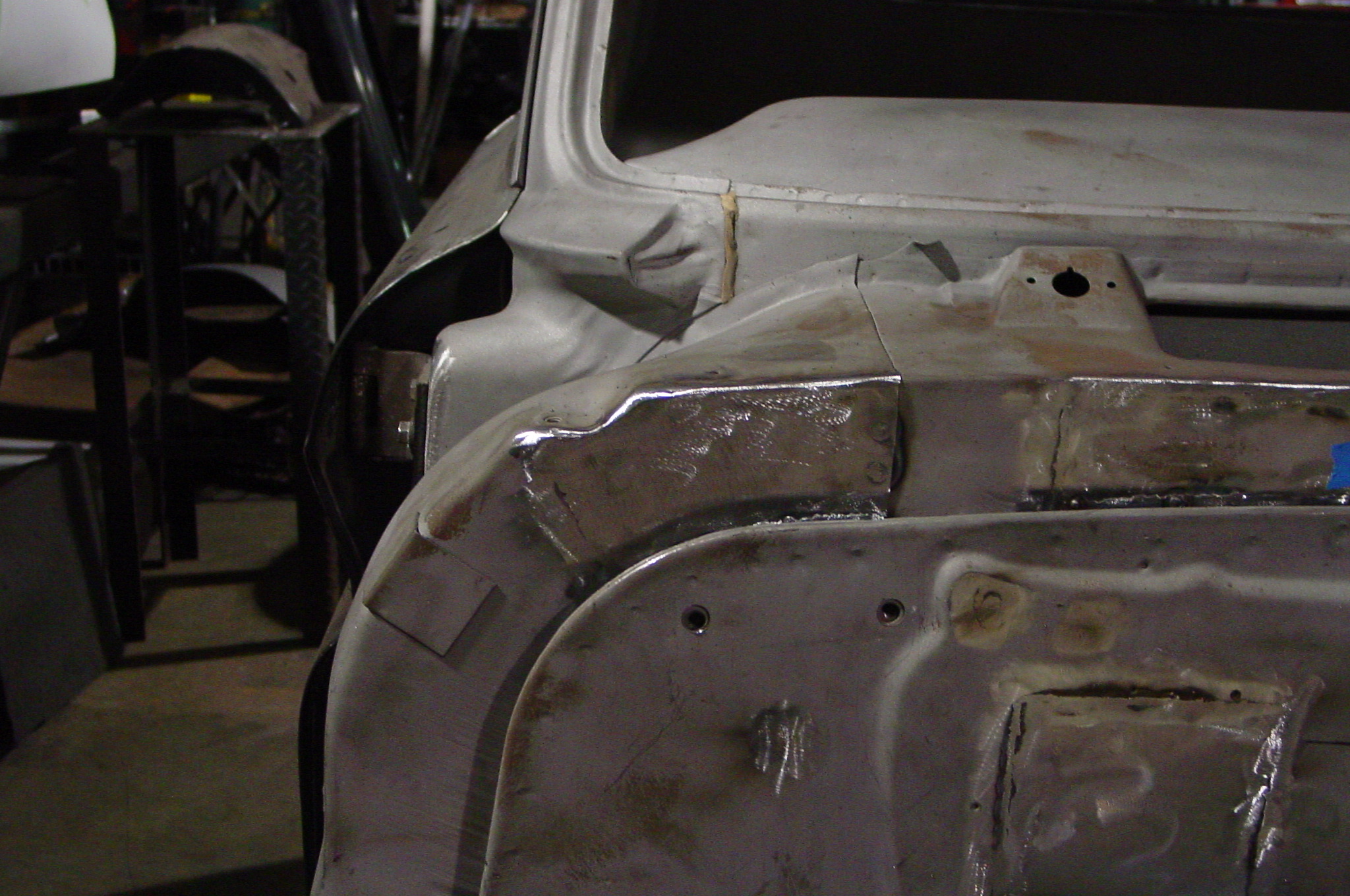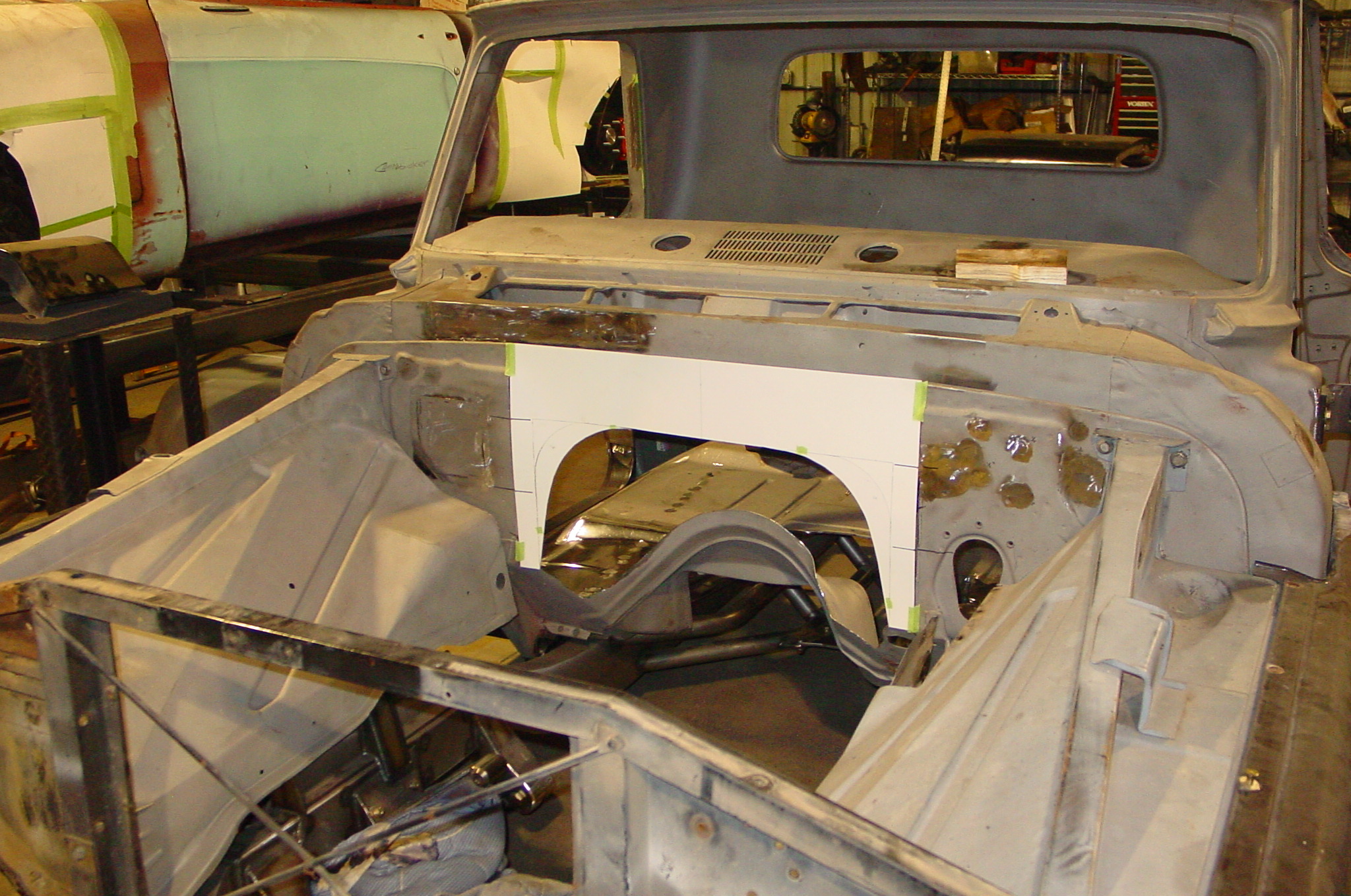 After blasting the old paint off we found a lot of filler over the rust holes. We removed the old rusted metal and replaced them with new steel. Now that the body is solid, the modifications have begun. -- Firewall, inner fenders, front fenders, front bumper, rear bumper, tailgate, and rear wheel opening.