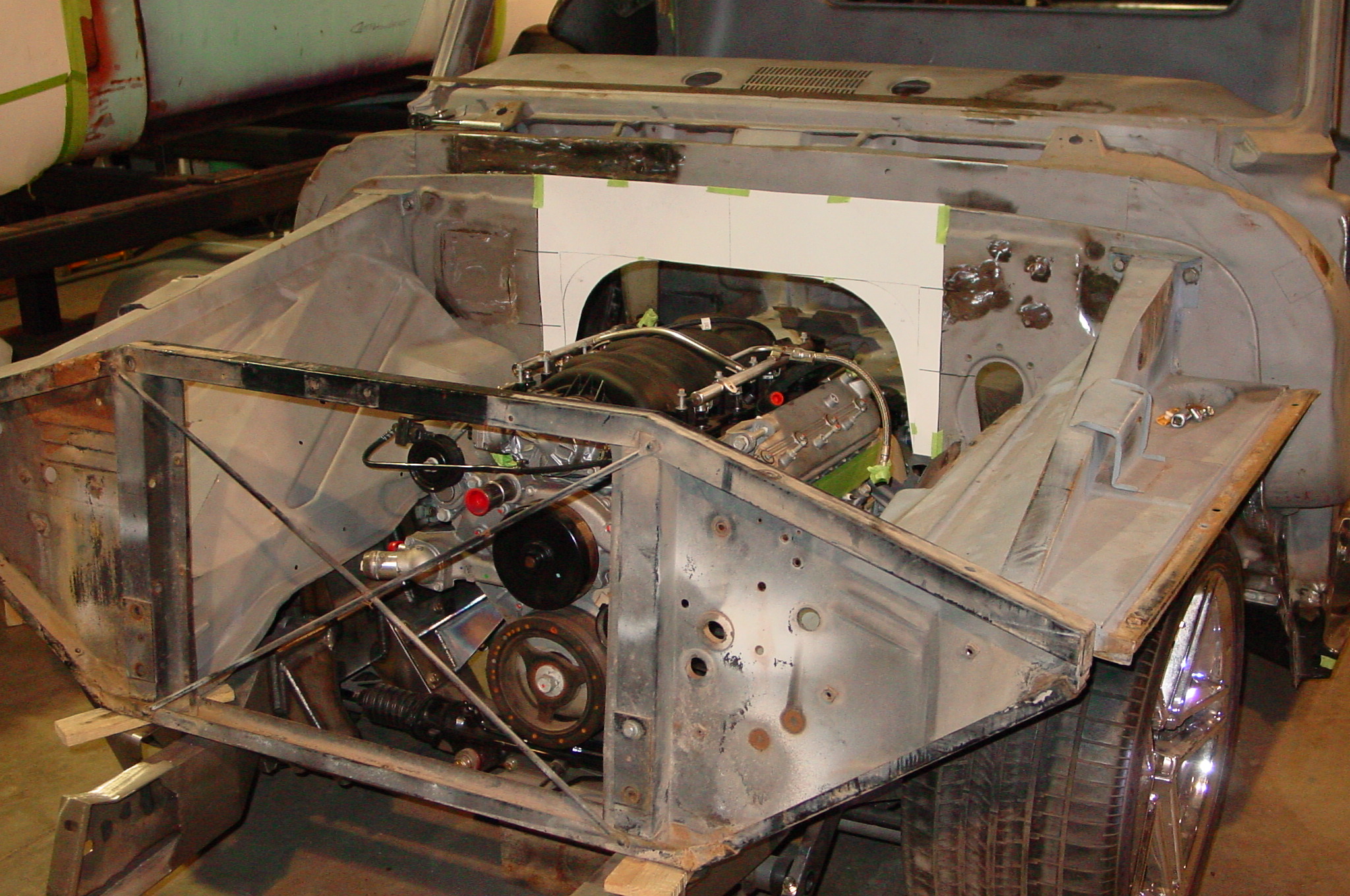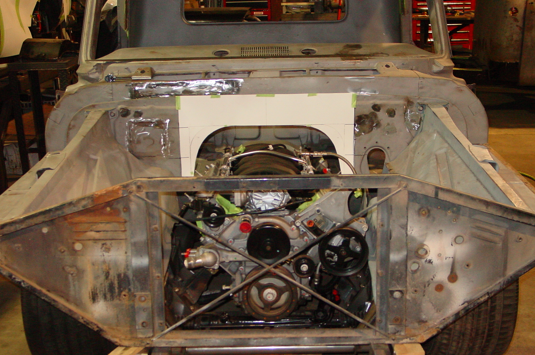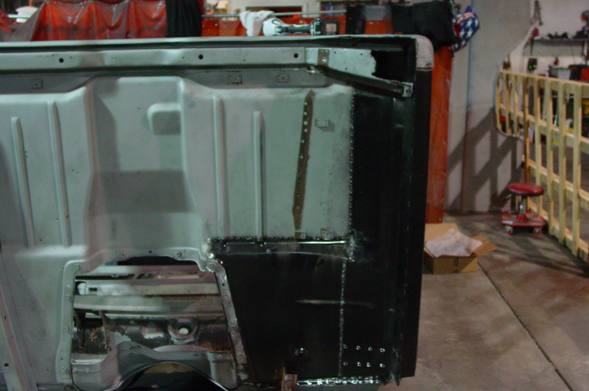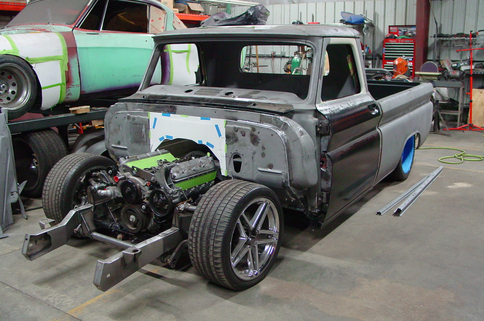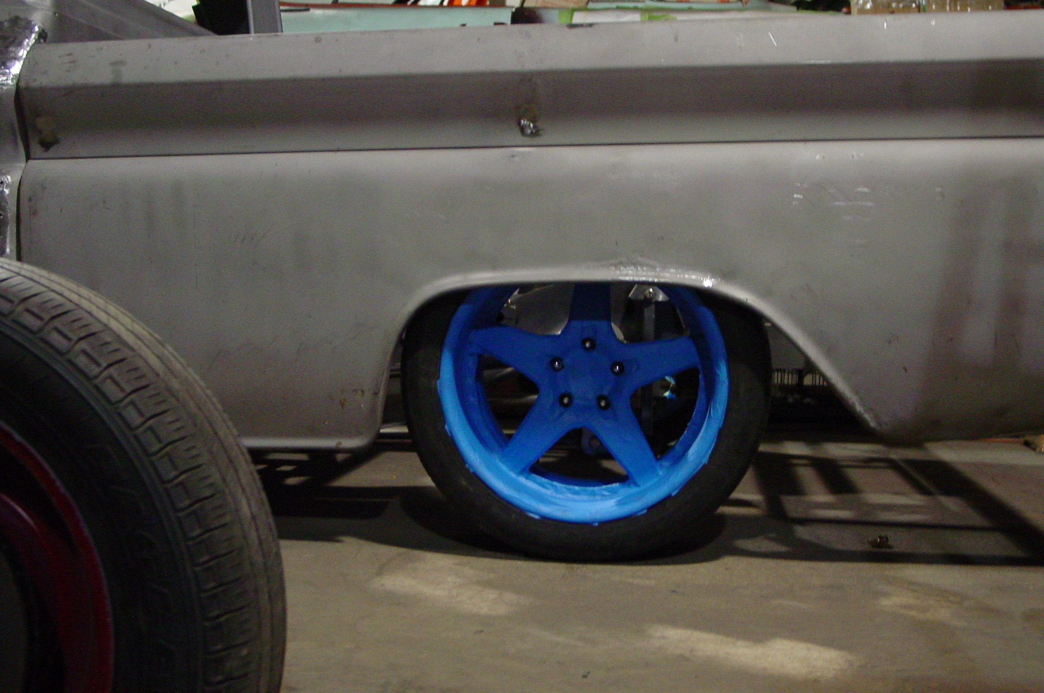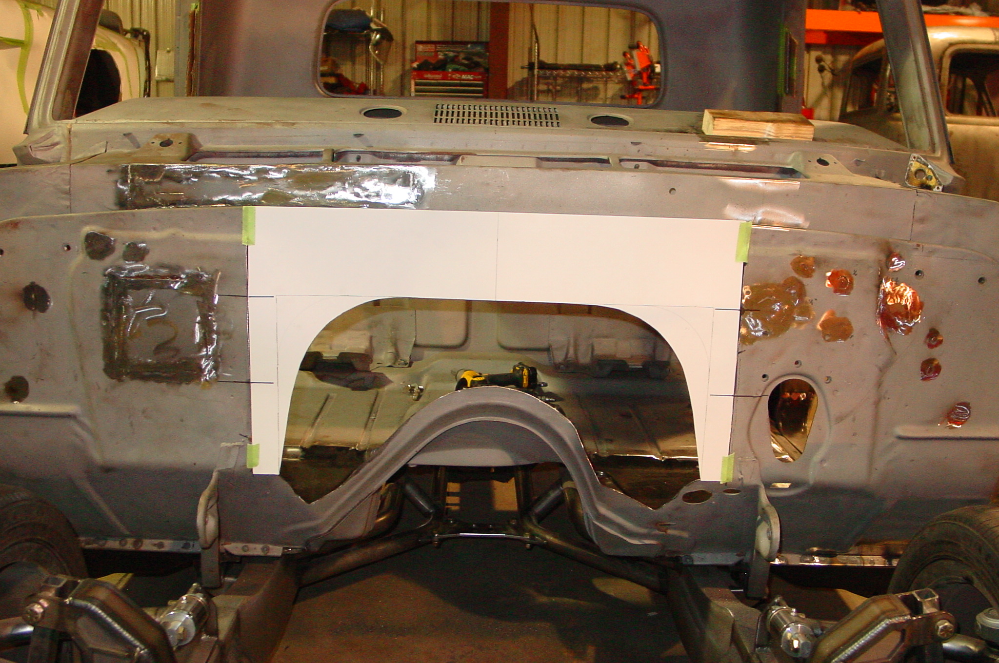 After blasting the old paint off we found a lot of filler over the rust holes. We removed the old rusted metal and replaced them with new steel. Now that the body is solid, the modifications have begun. -- Firewall, inner fenders, front fenders, front bumper, rear bumper, tailgate, and rear wheel opening.