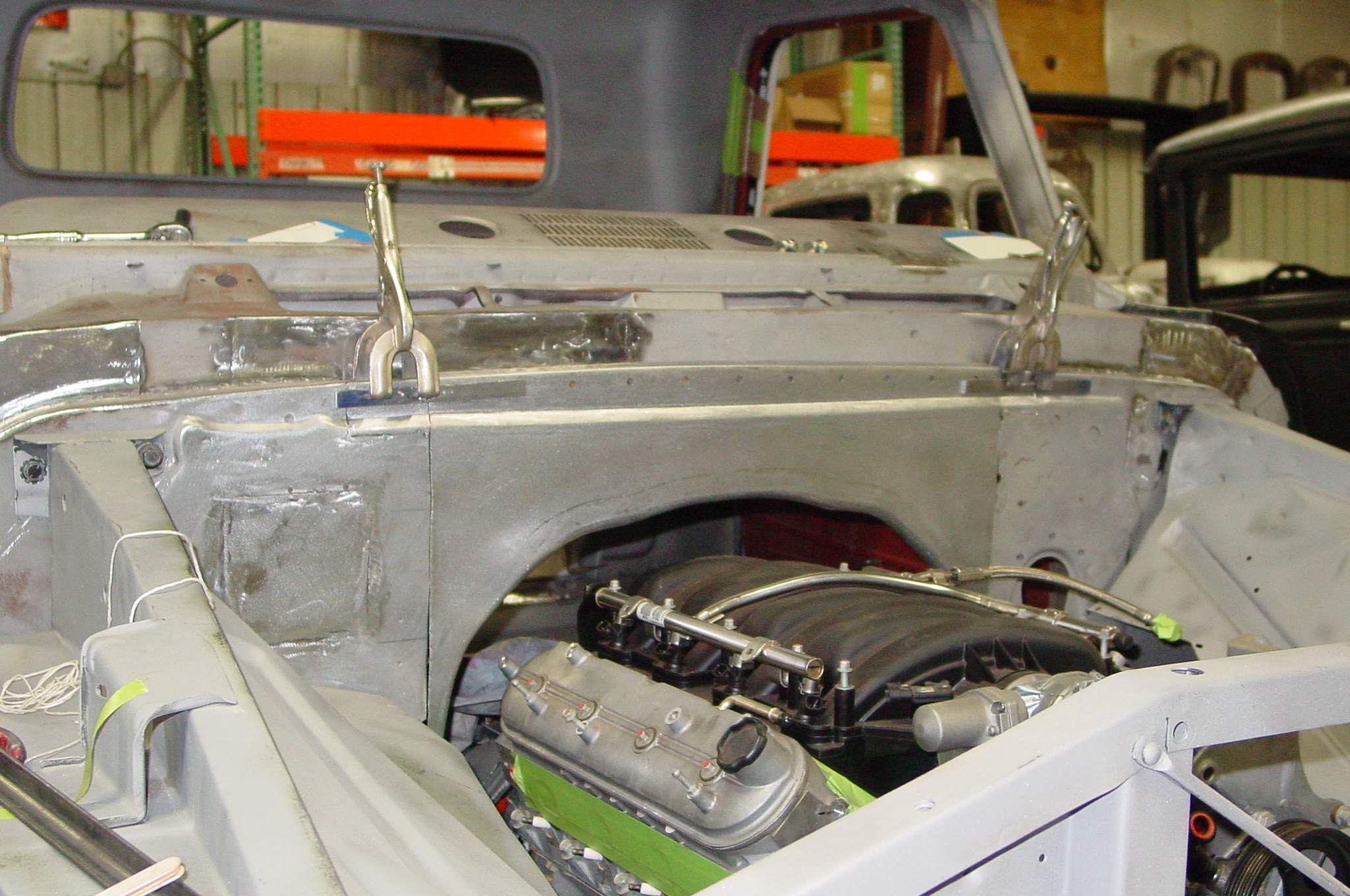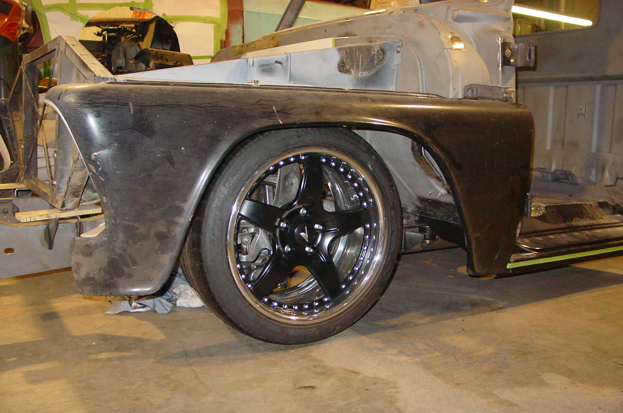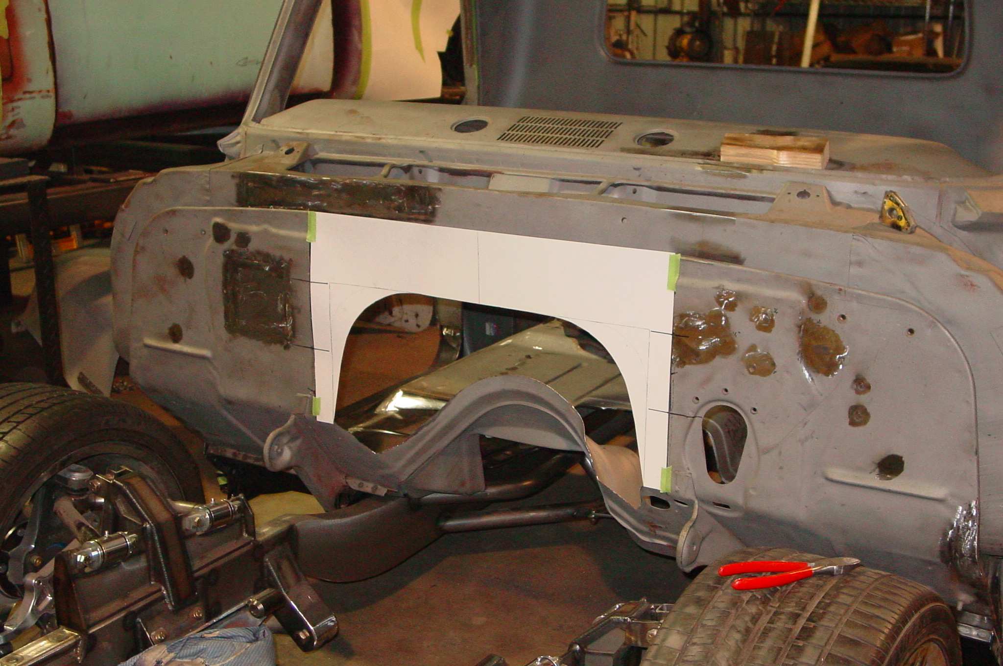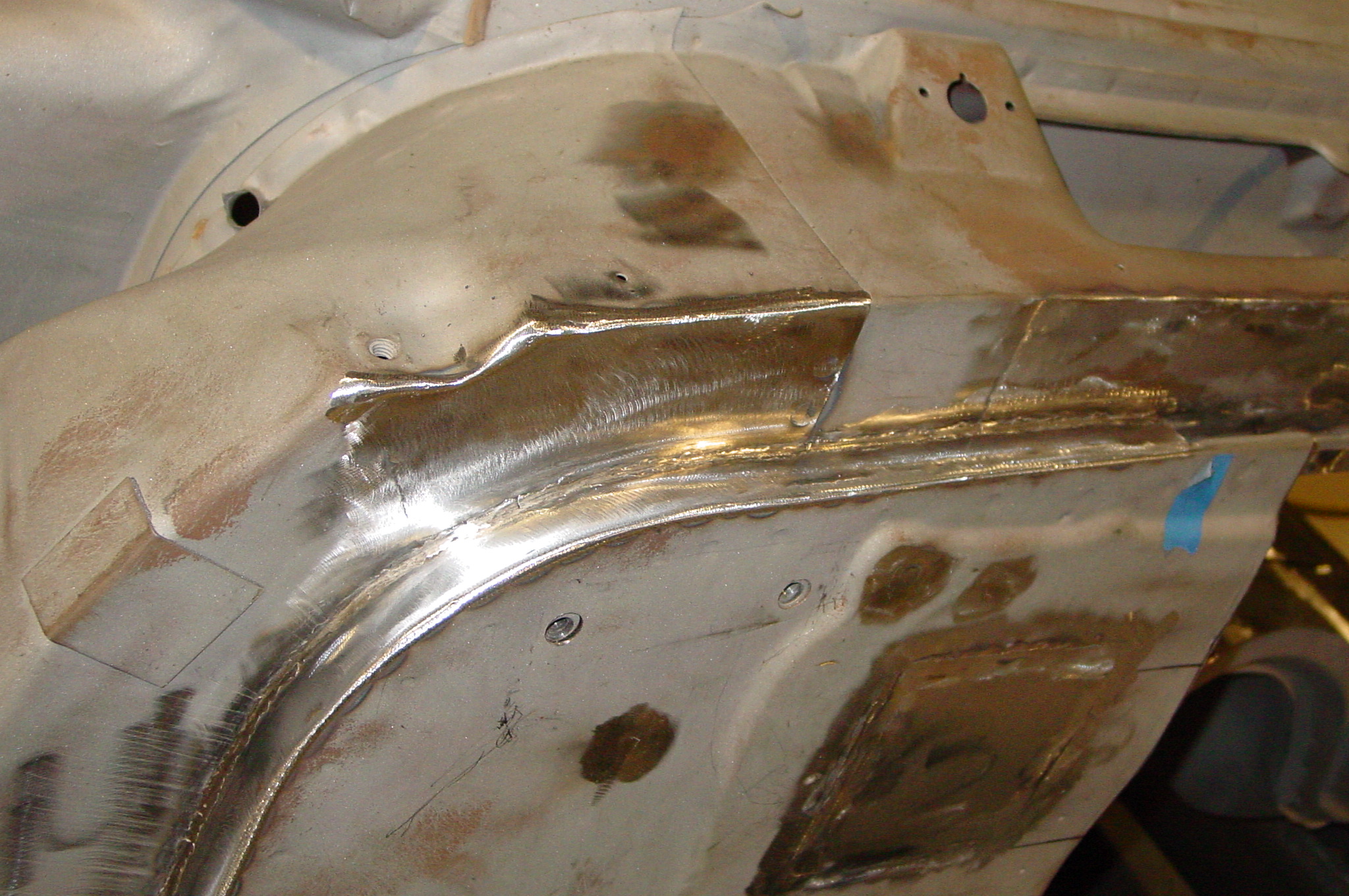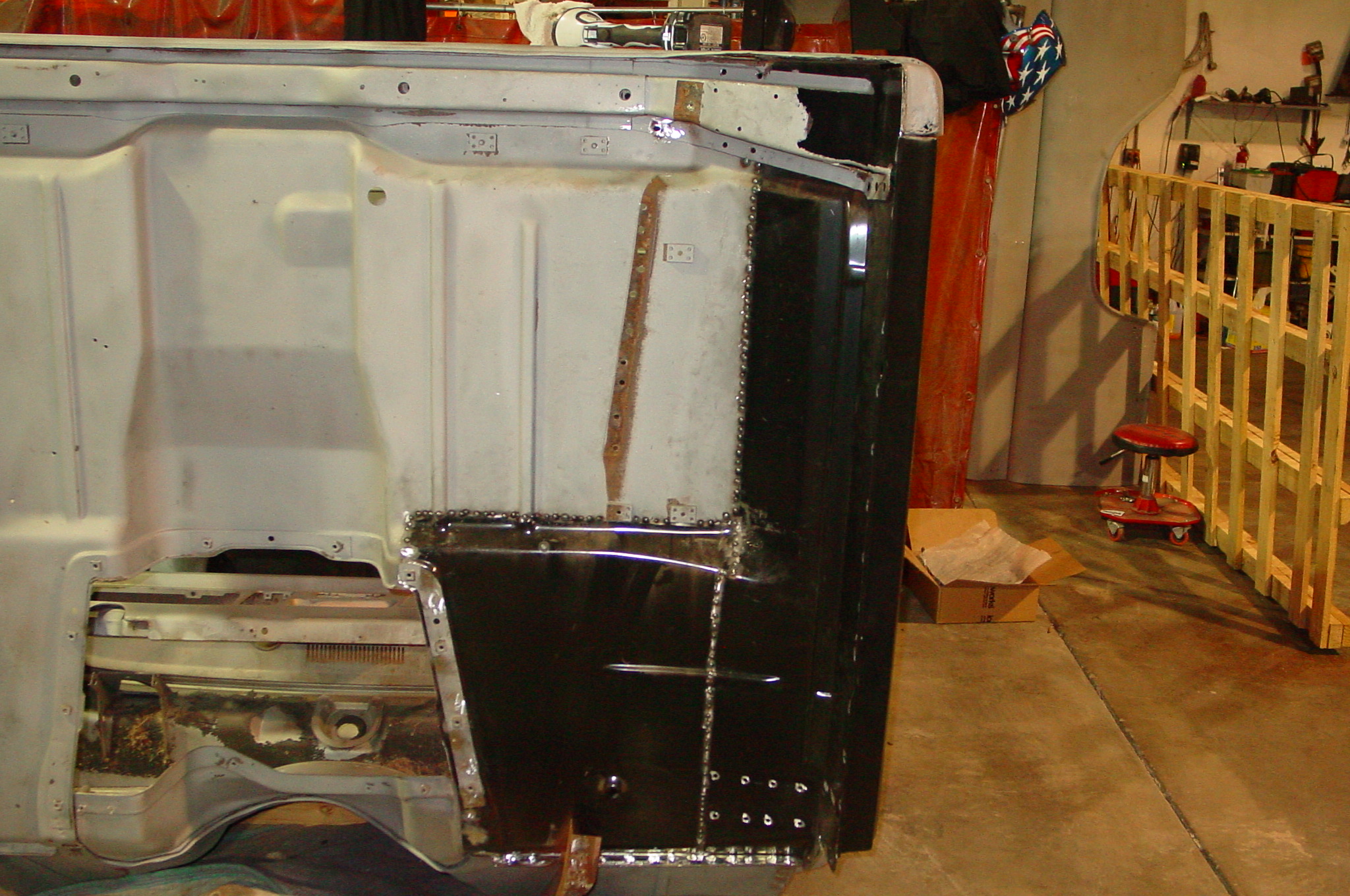 After blasting the old paint off we found a lot of filler over the rust holes. We removed the old rusted metal and replaced them with new steel. Now that the body is solid, the modifications have begun. -- Firewall, inner fenders, front fenders, front bumper, rear bumper, tailgate, and rear wheel opening.
