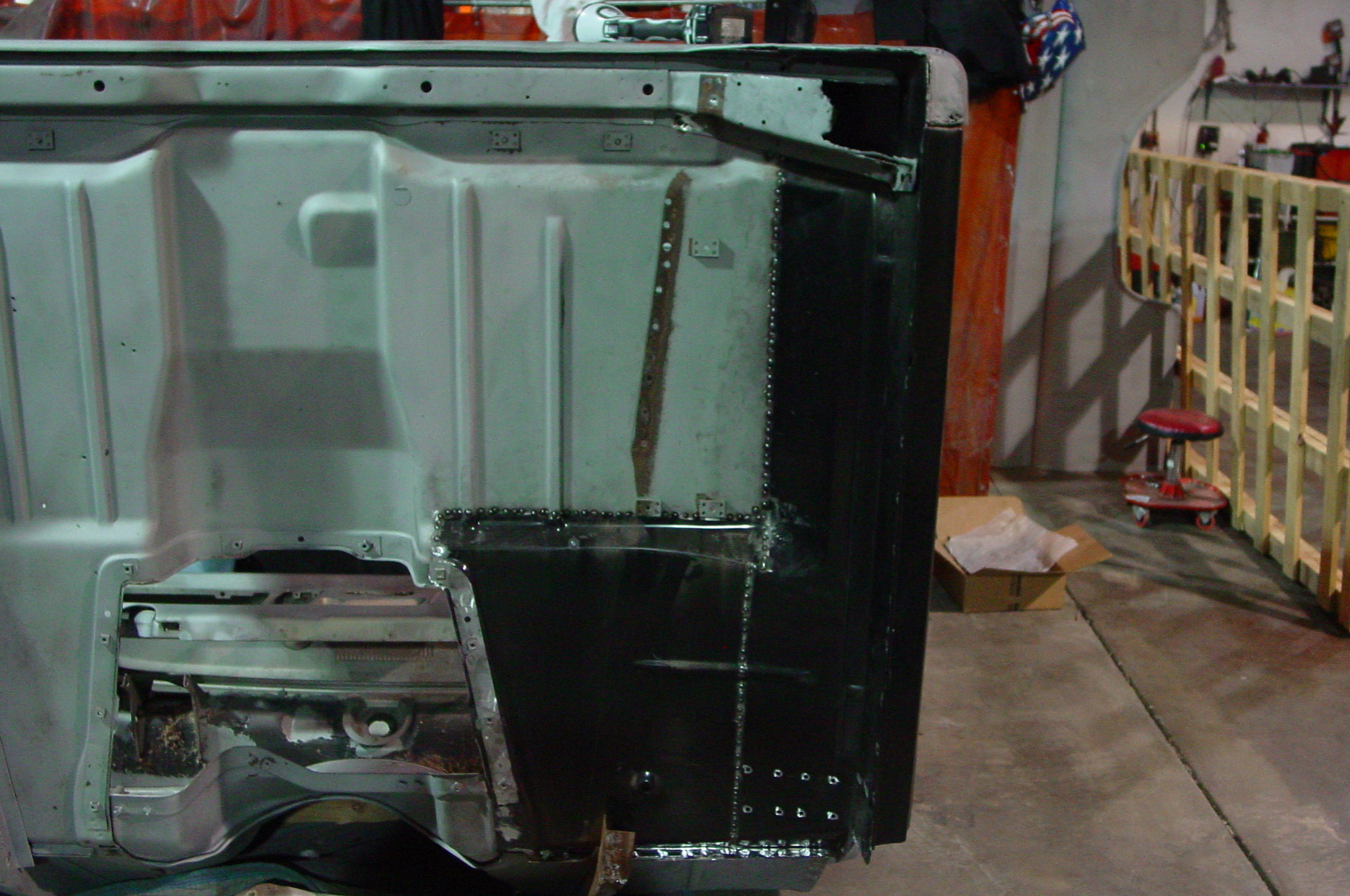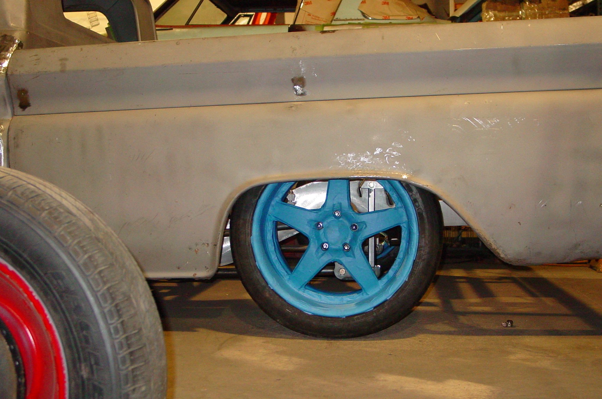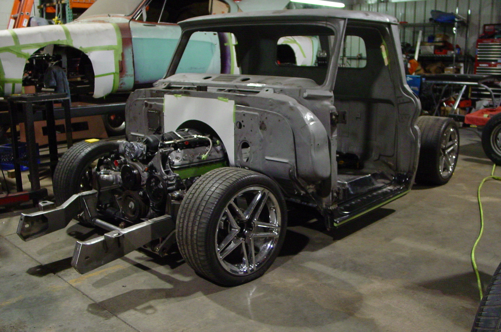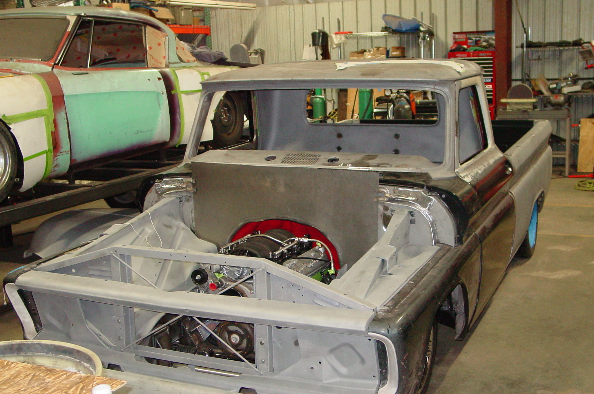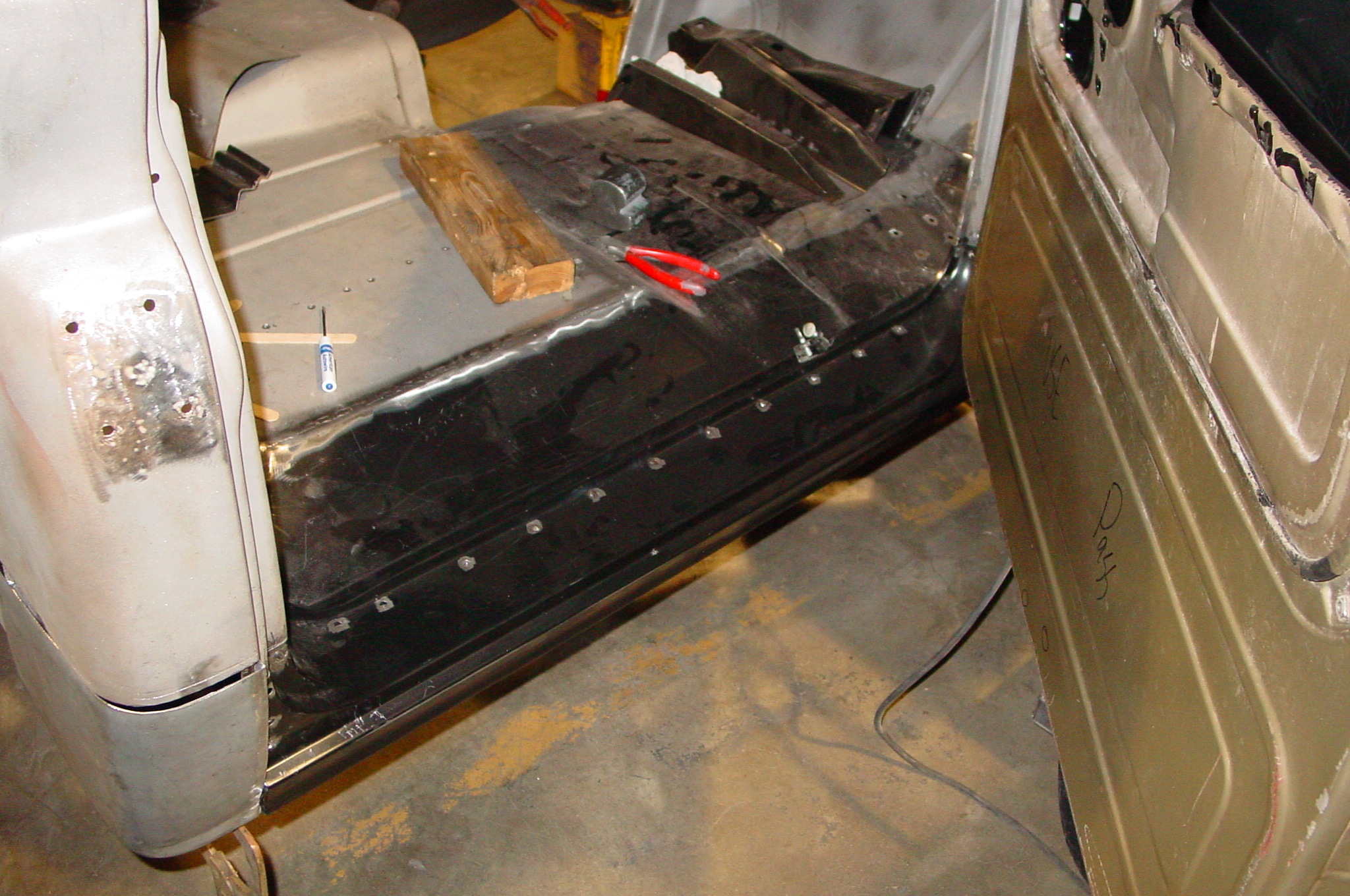 After blasting the old paint off we found a lot of filler over the rust holes. We removed the old rusted metal and replaced them with new steel. Now that the body is solid, the modifications have begun. -- Firewall, inner fenders, front fenders, front bumper, rear bumper, tailgate, and rear wheel opening.