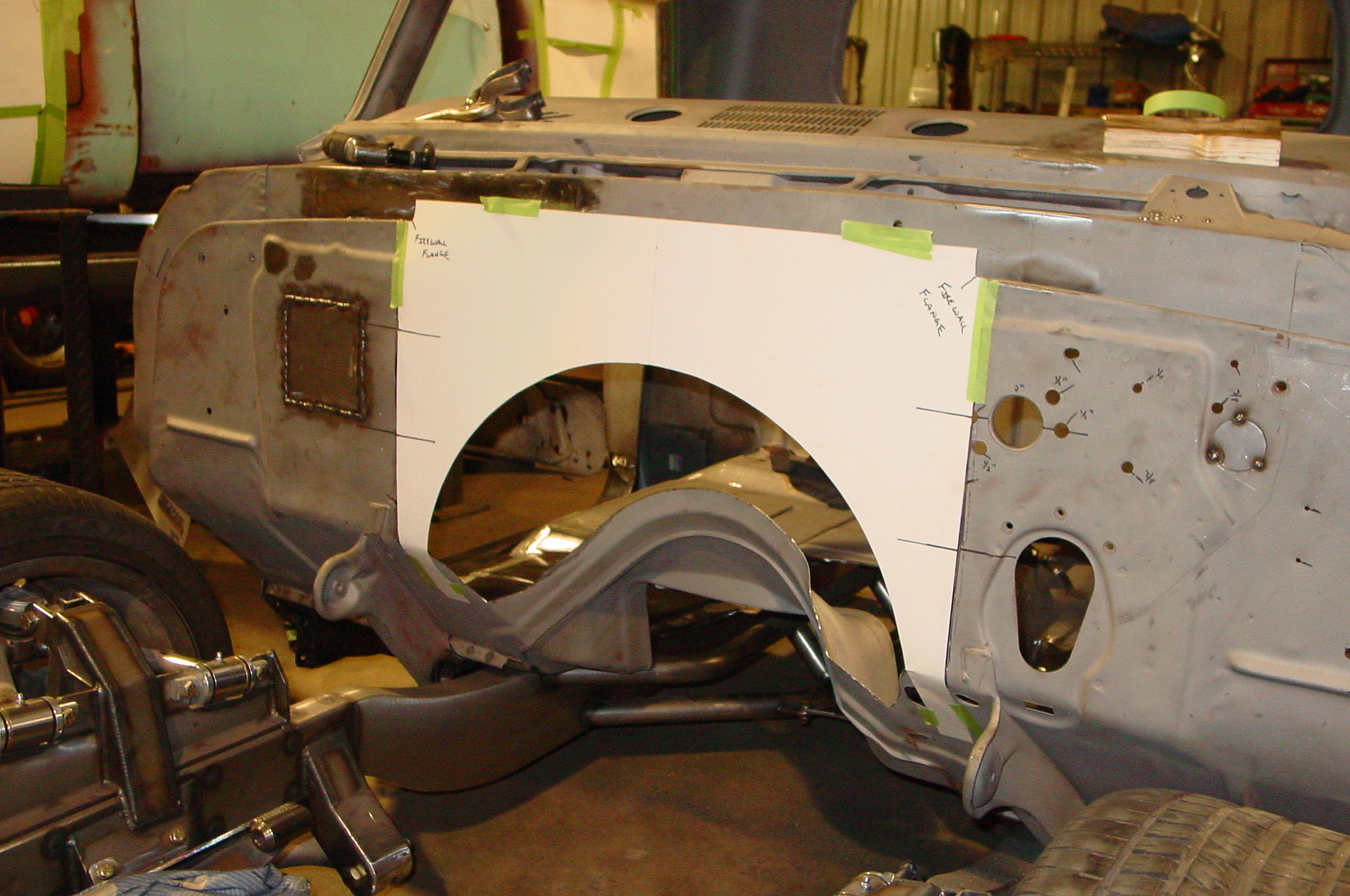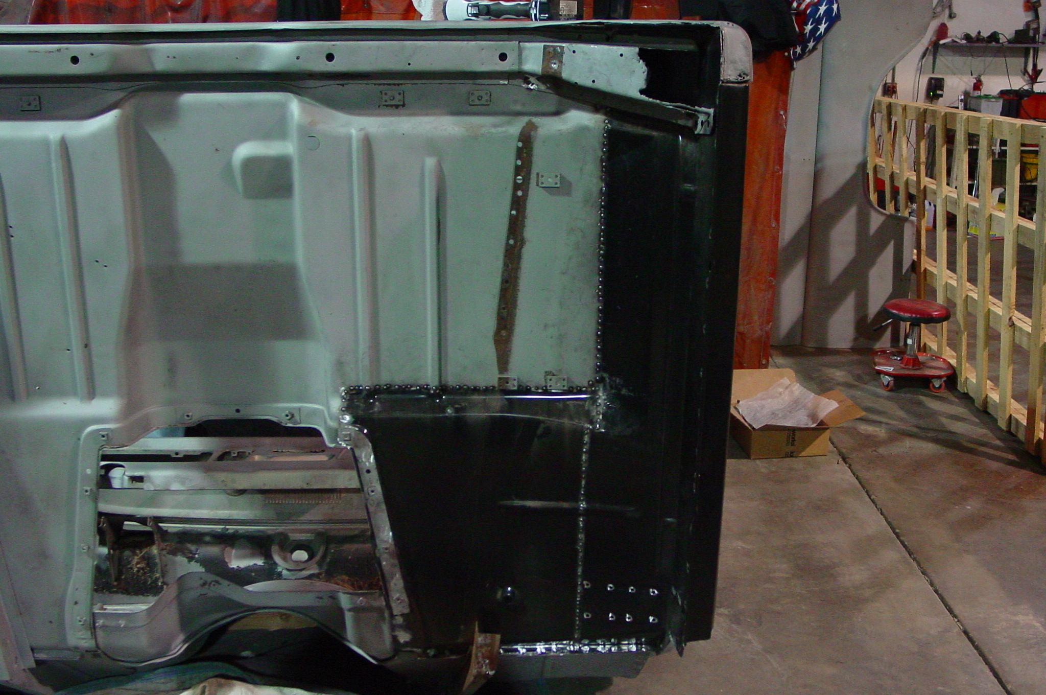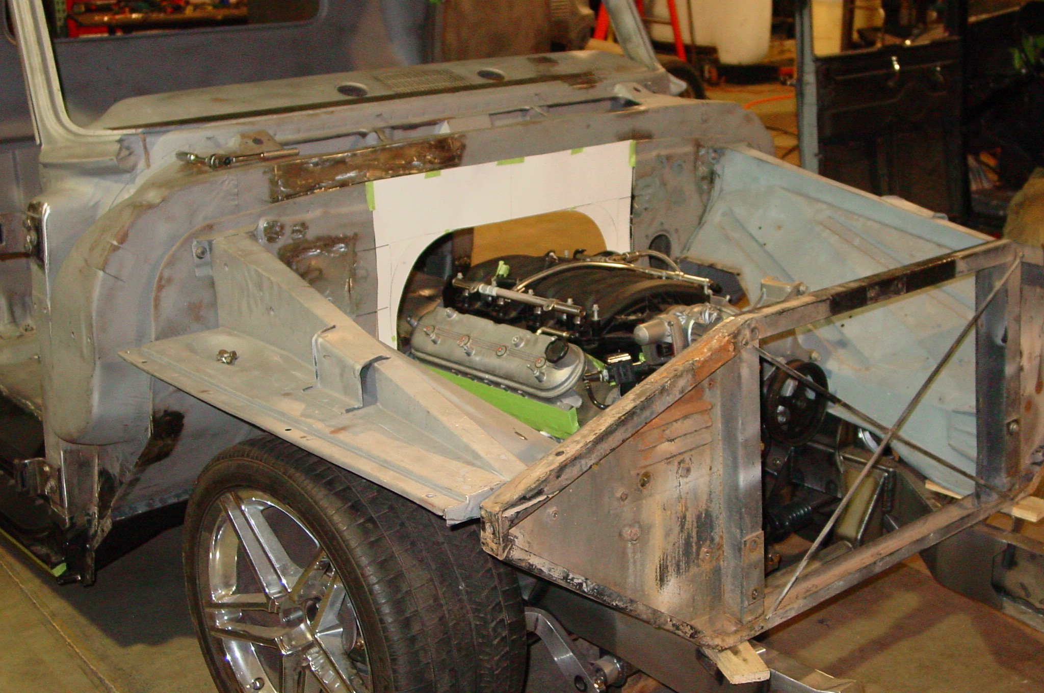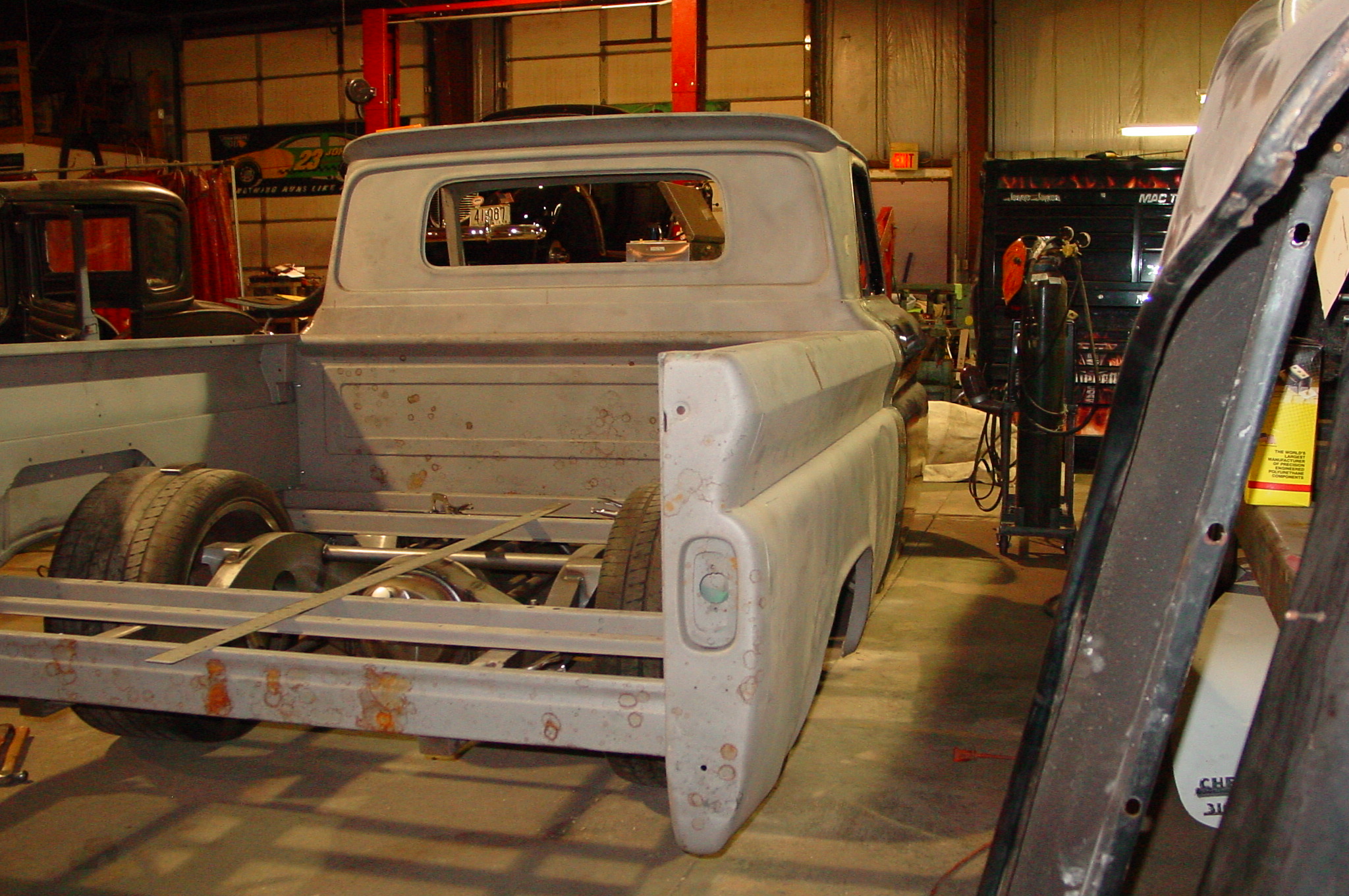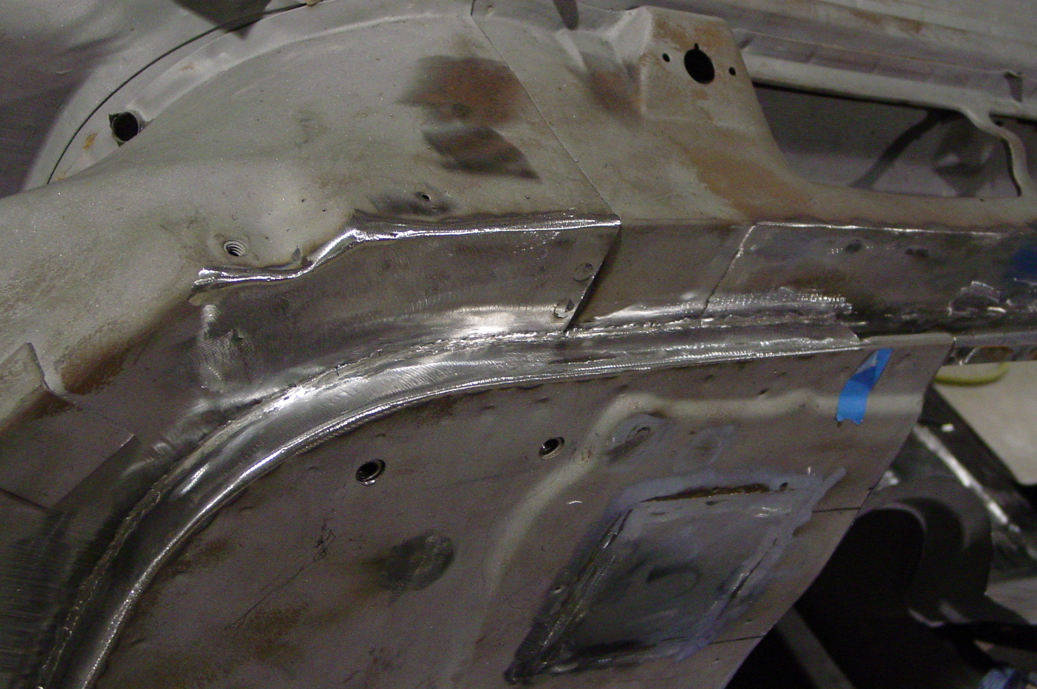 After blasting the old paint off we found a lot of filler over the rust holes. We removed the old rusted metal and replaced them with new steel. Now that the body is solid, the modifications have begun. -- Firewall, inner fenders, front fenders, front bumper, rear bumper, tailgate, and rear wheel opening.