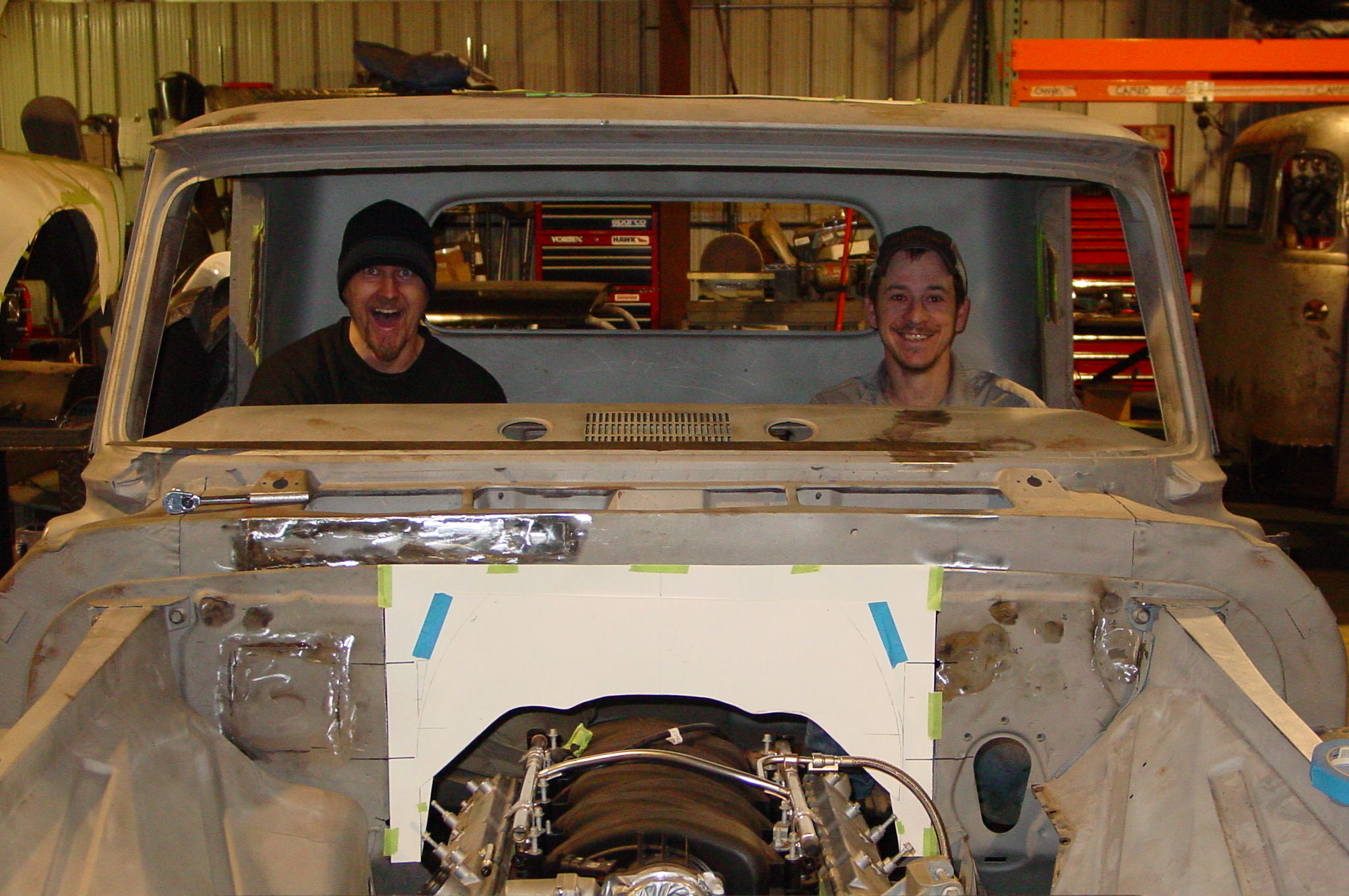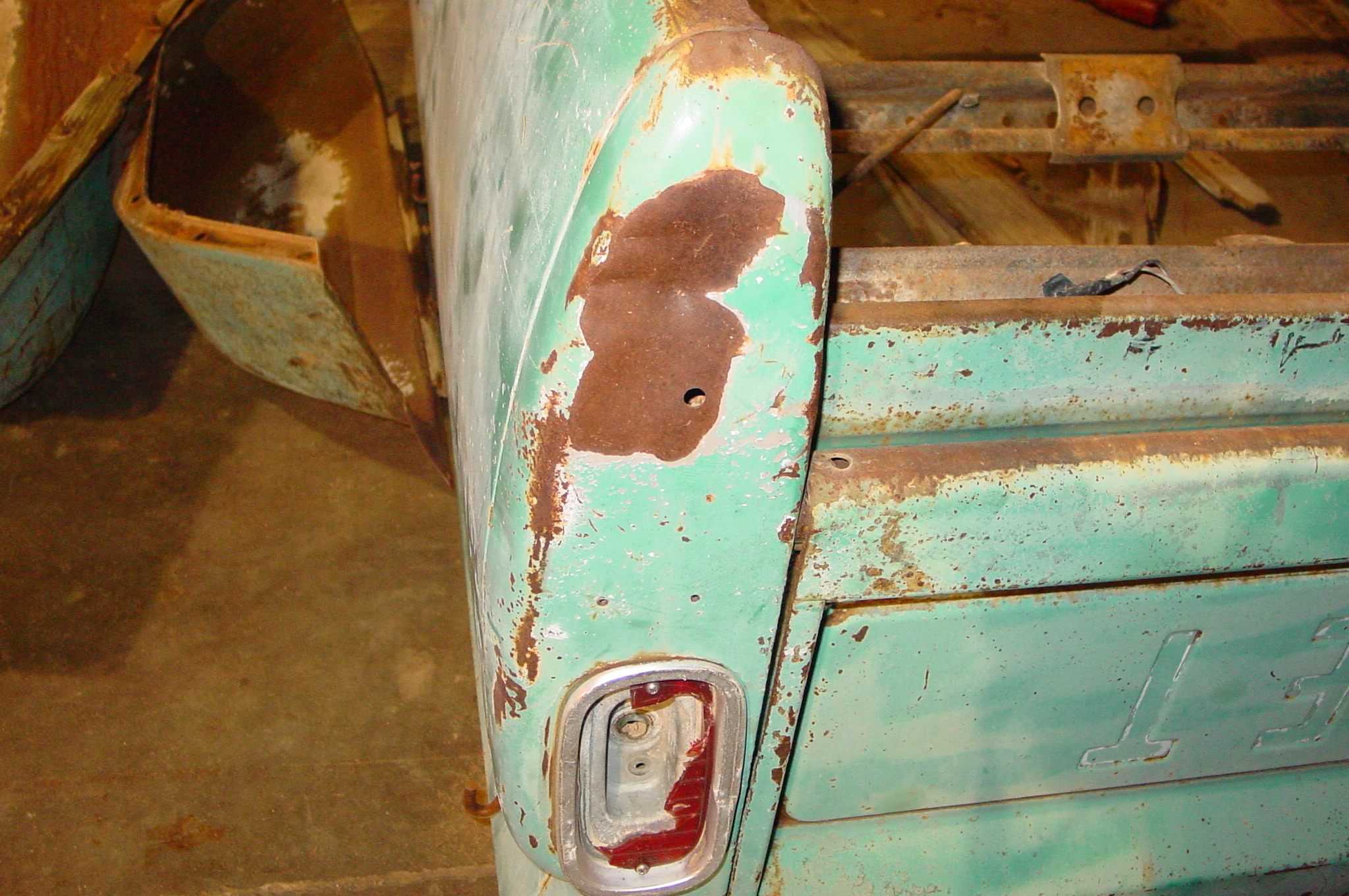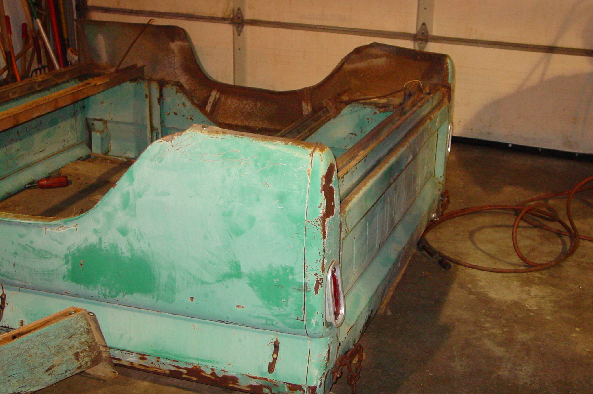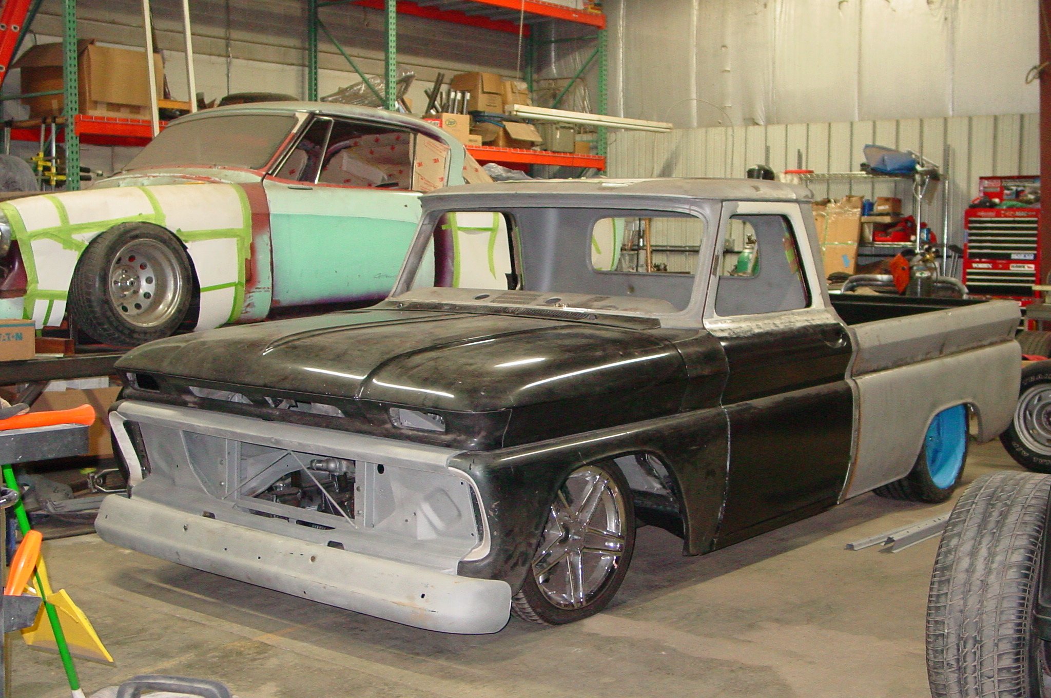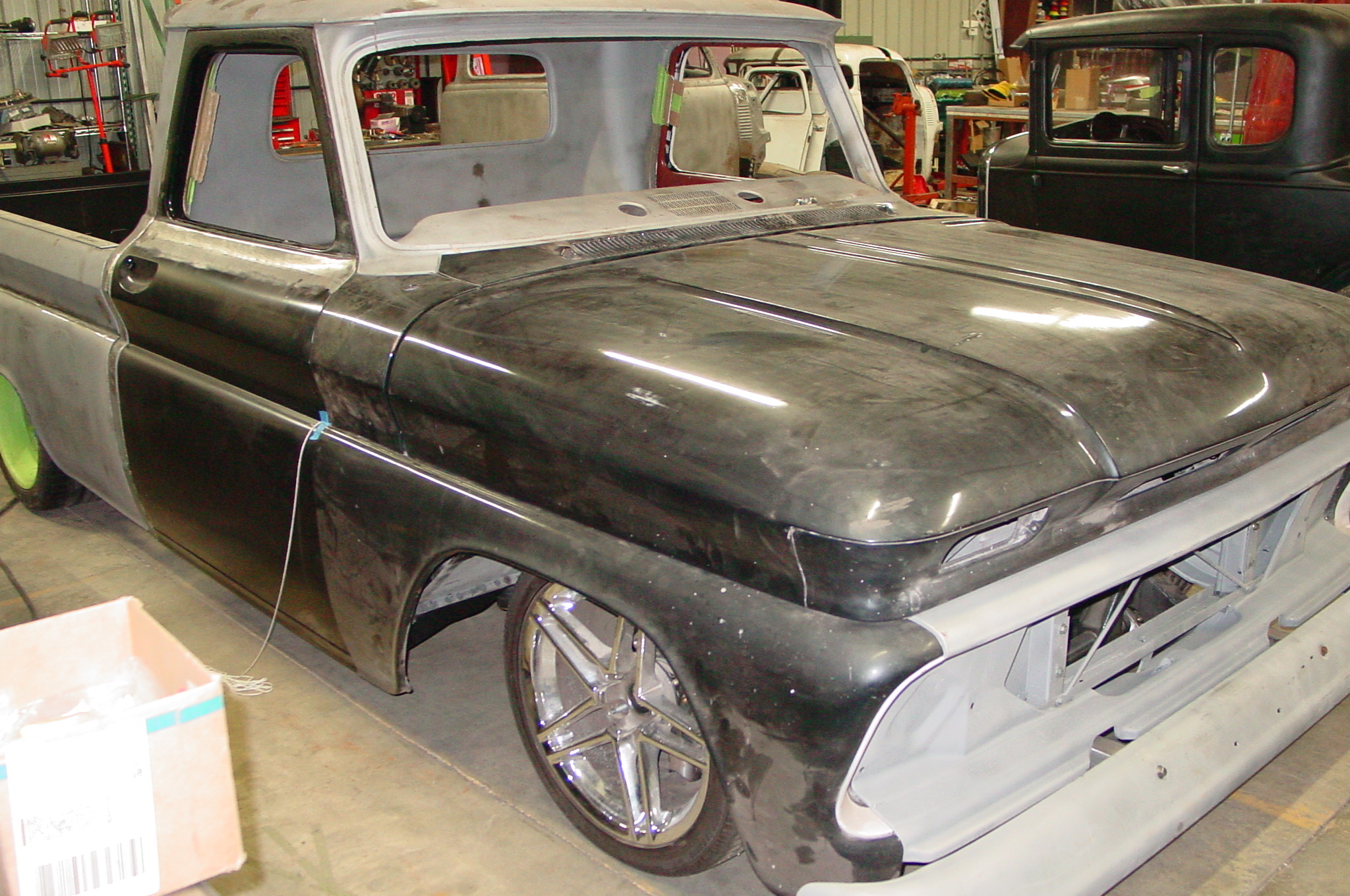 After blasting the old paint off we found a lot of filler over the rust holes. We removed the old rusted metal and replaced them with new steel. Now that the body is solid, the modifications have begun. -- Firewall, inner fenders, front fenders, front bumper, rear bumper, tailgate, and rear wheel opening.
