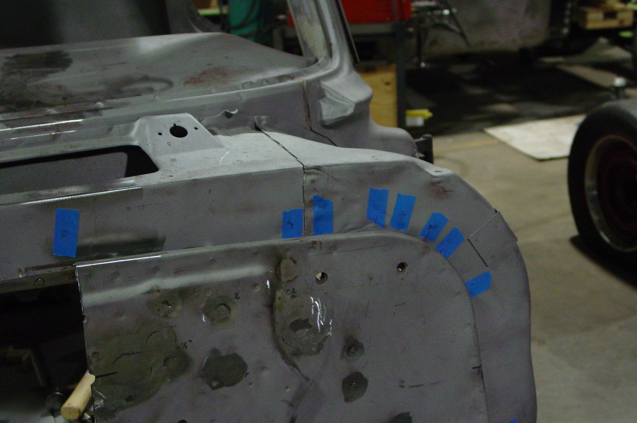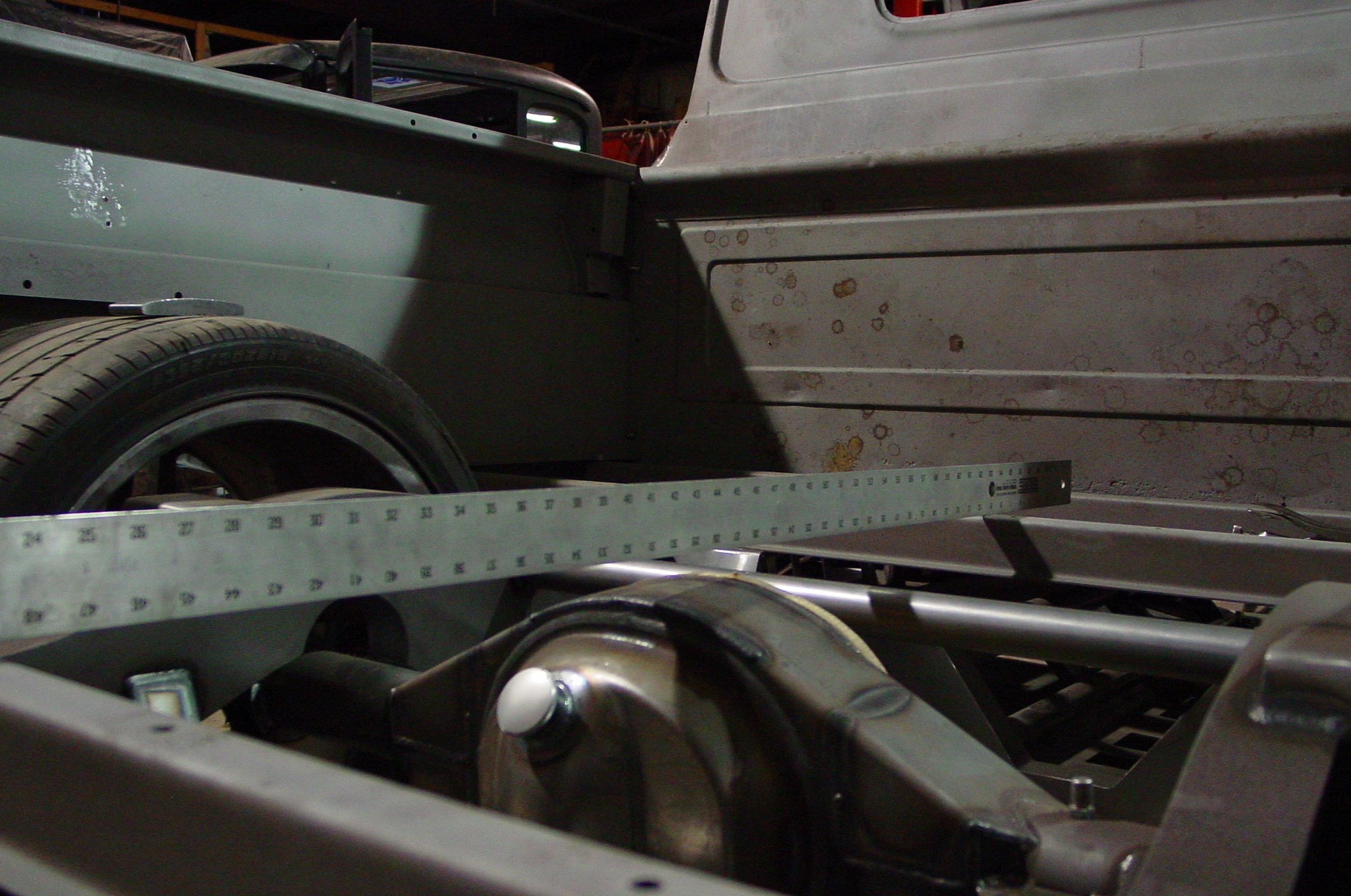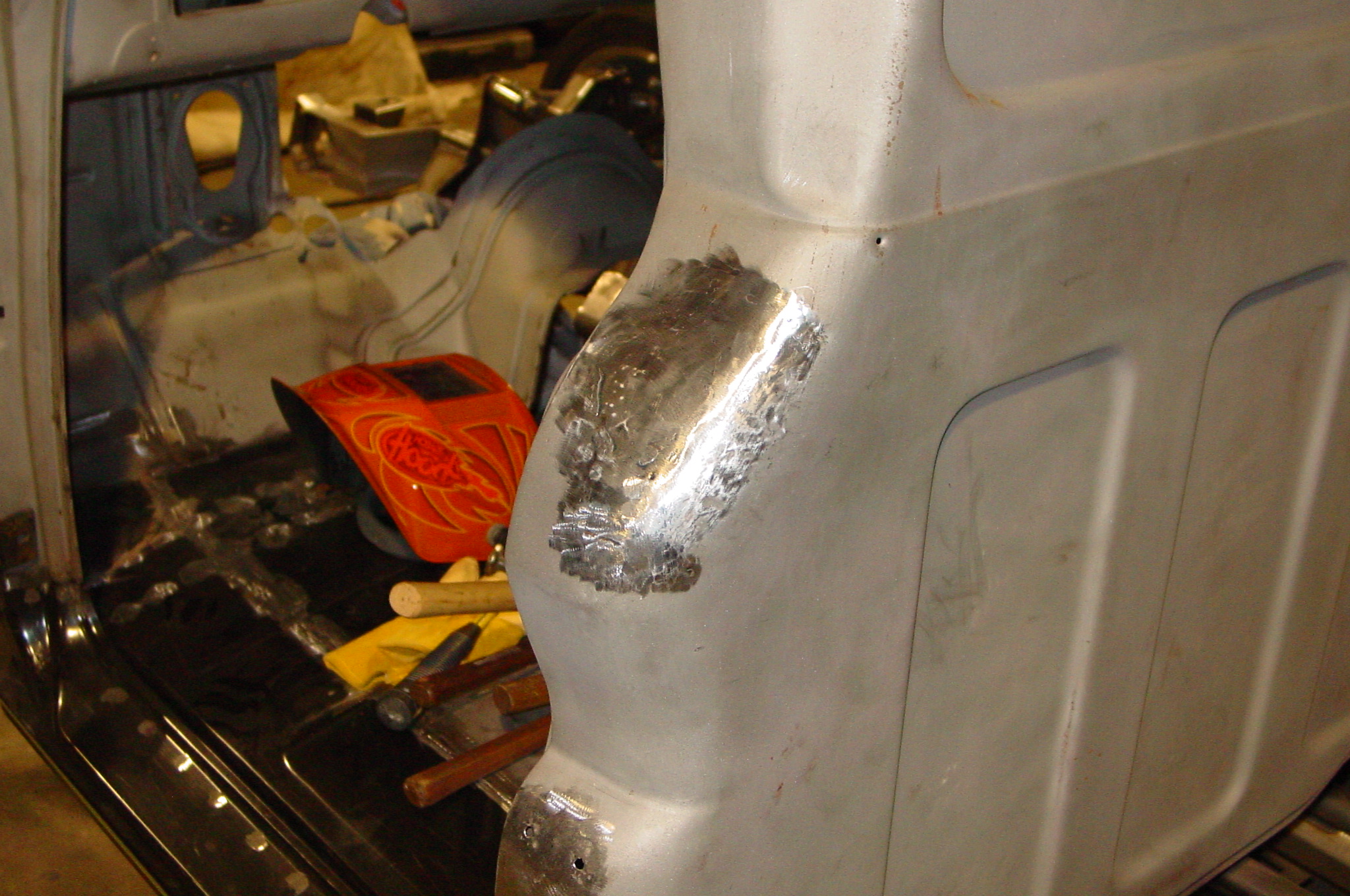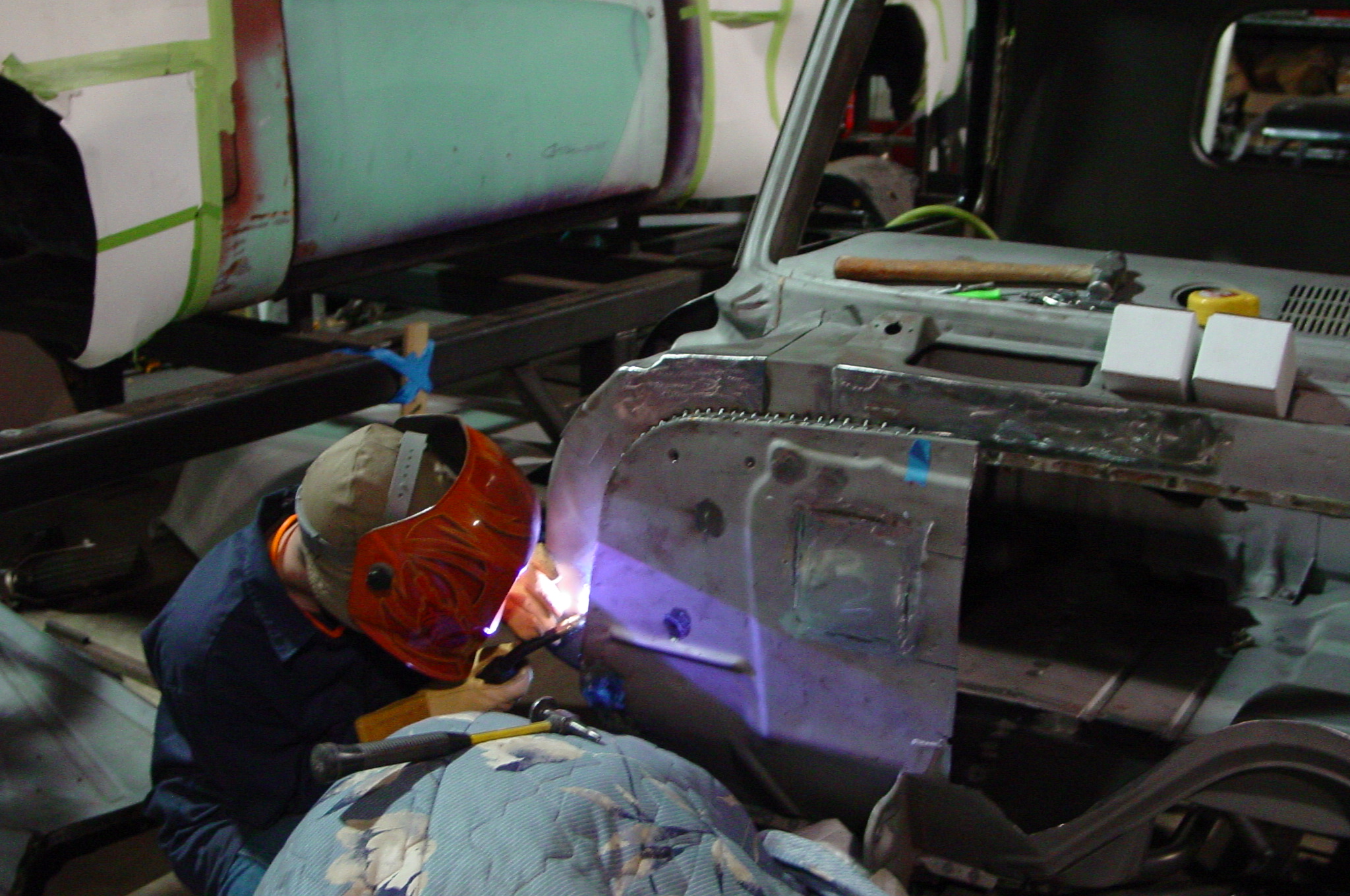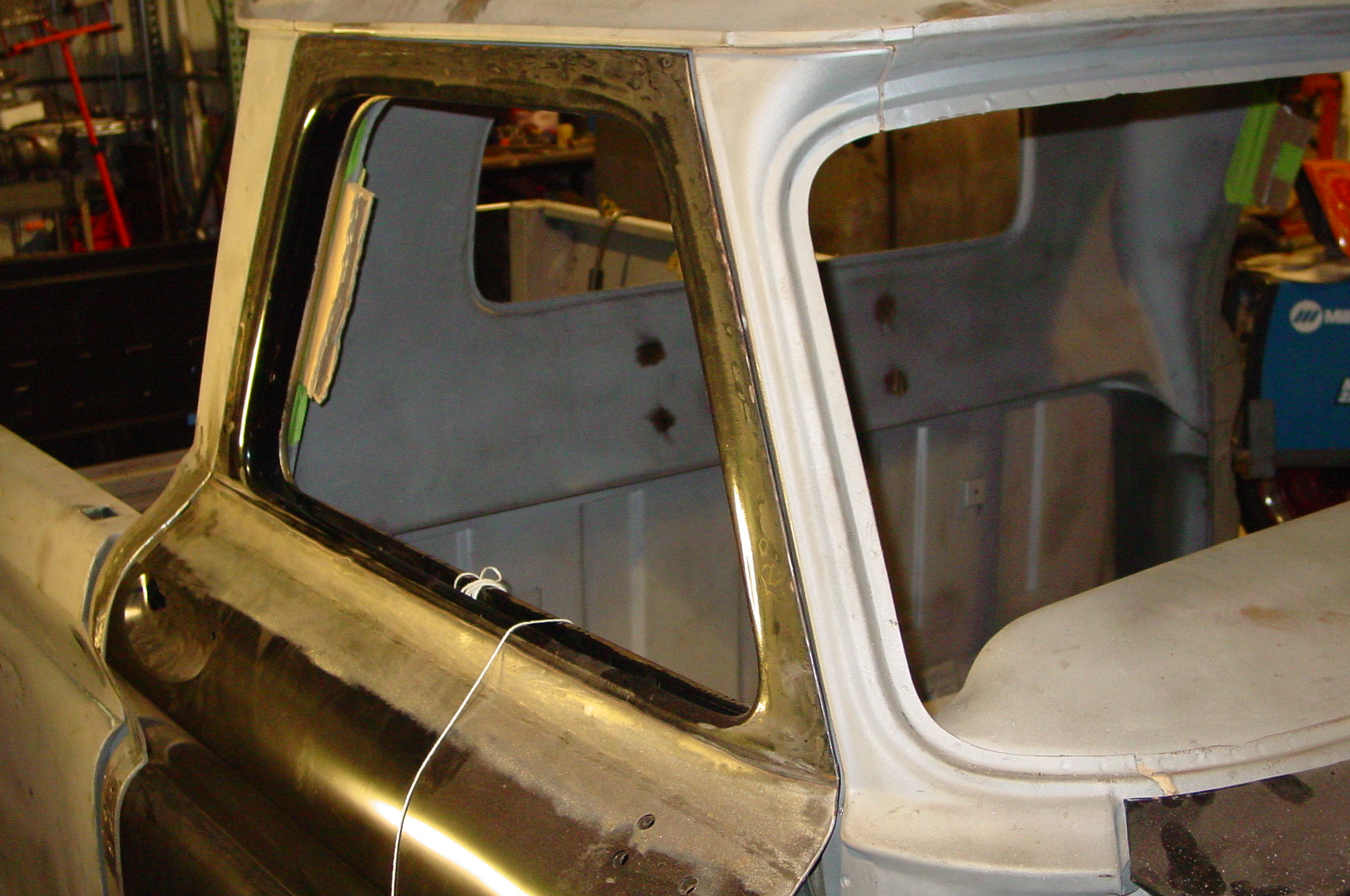 After blasting the old paint off we found a lot of filler over the rust holes. We removed the old rusted metal and replaced them with new steel. Now that the body is solid, the modifications have begun. -- Firewall, inner fenders, front fenders, front bumper, rear bumper, tailgate, and rear wheel opening.