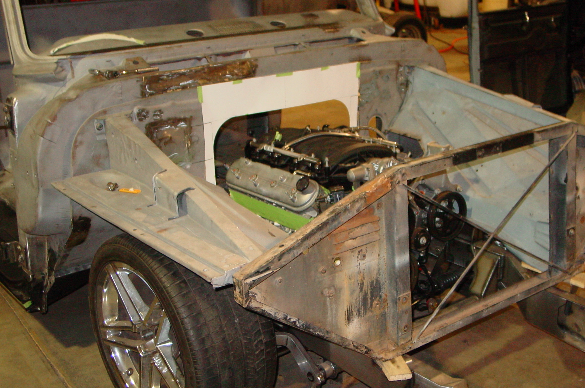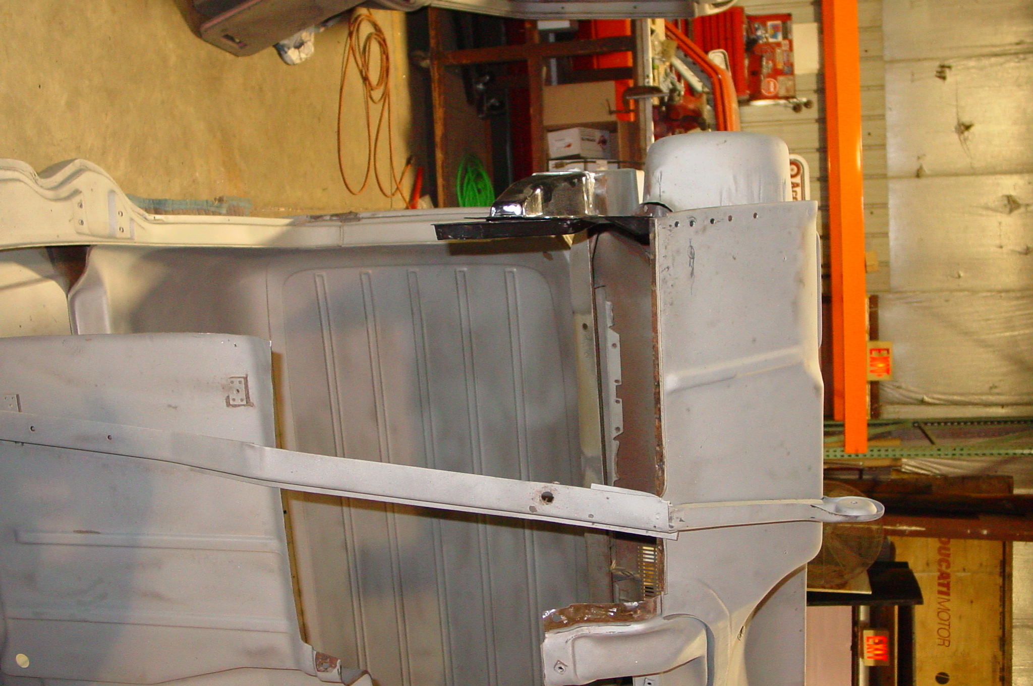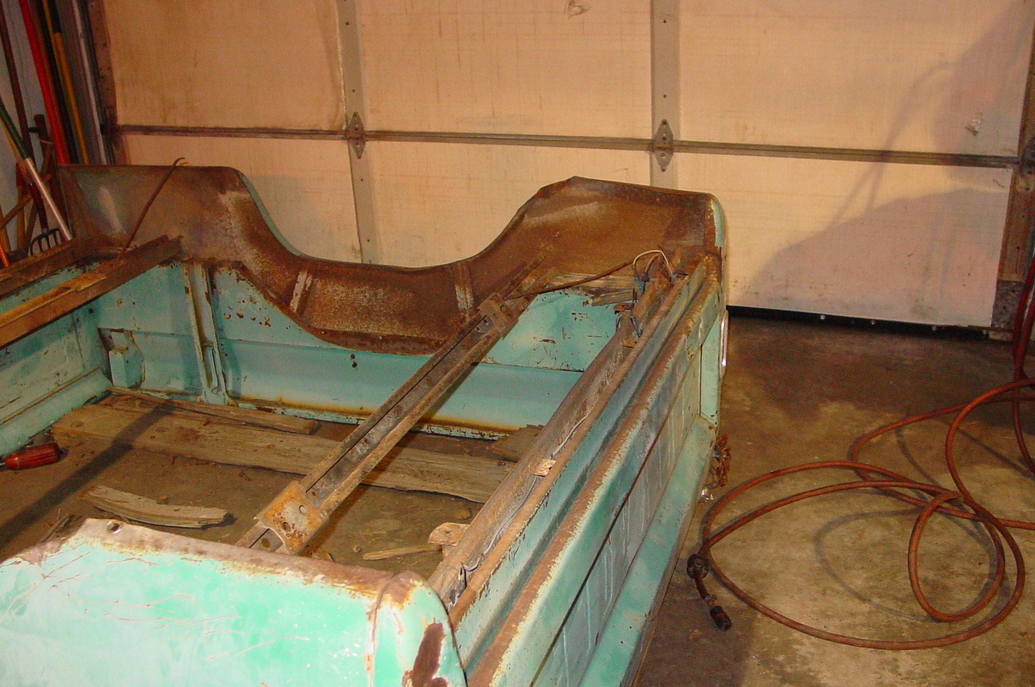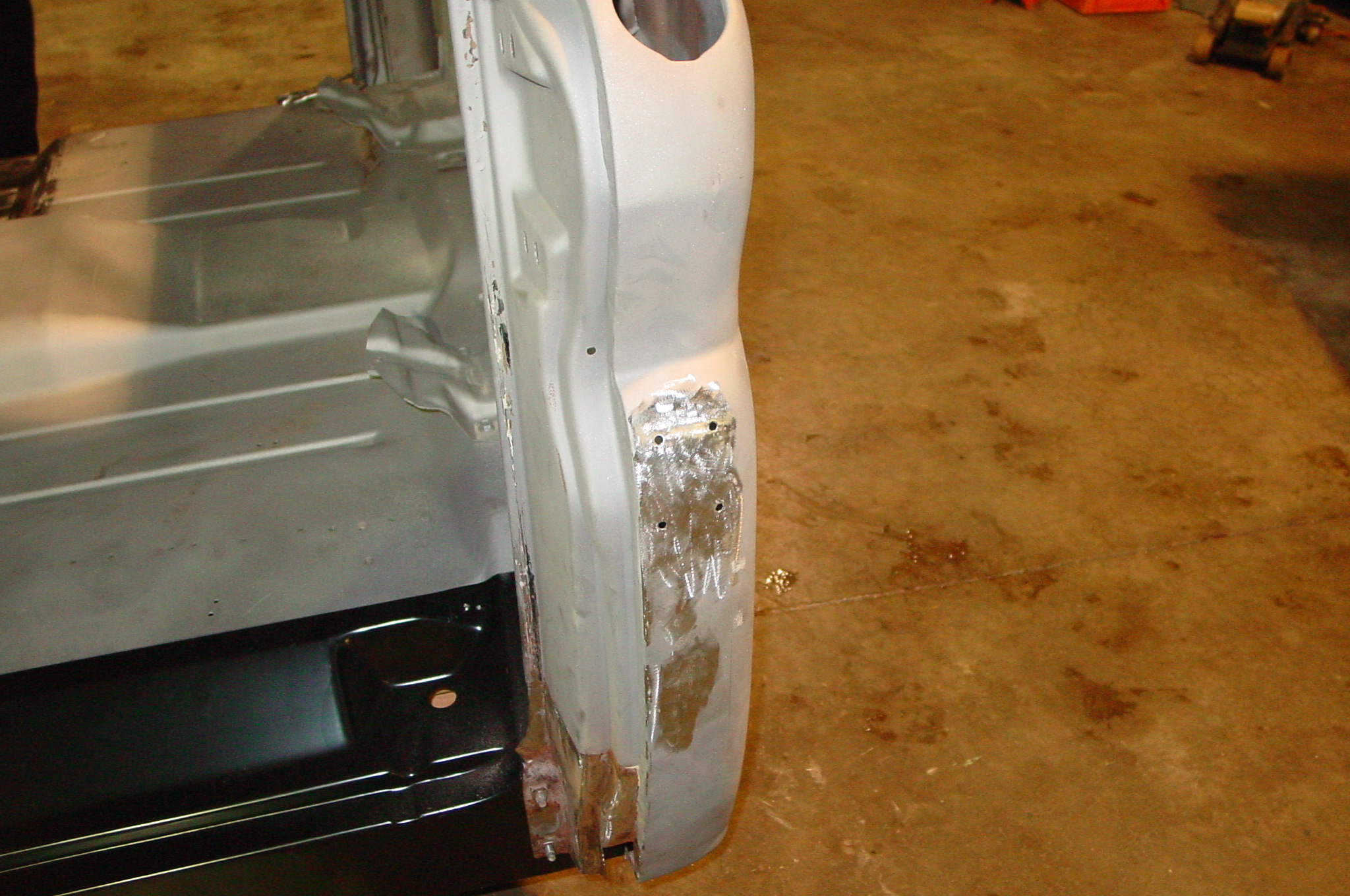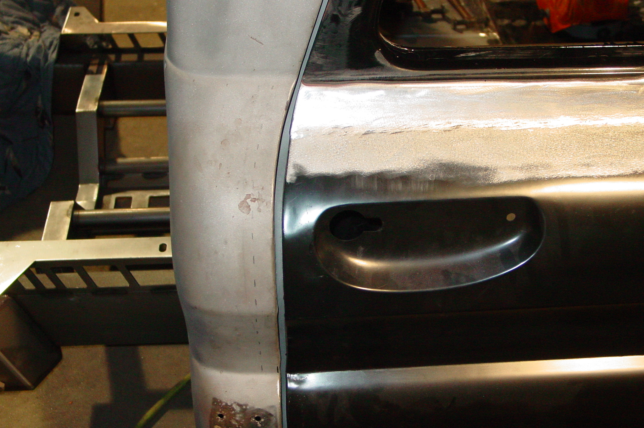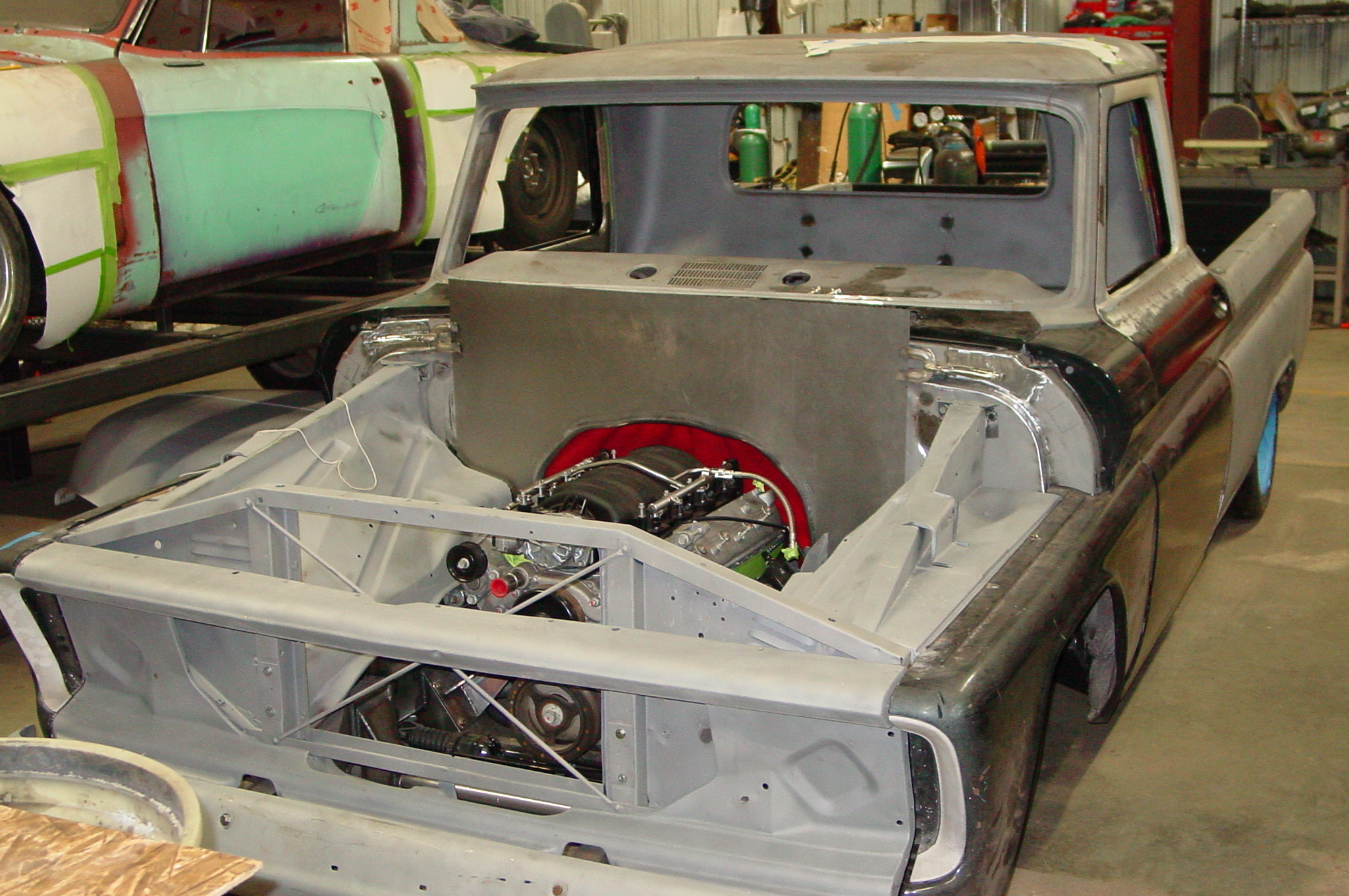 After blasting the old paint off we found a lot of filler over the rust holes. We removed the old rusted metal and replaced them with new steel. Now that the body is solid, the modifications have begun. -- Firewall, inner fenders, front fenders, front bumper, rear bumper, tailgate, and rear wheel opening.