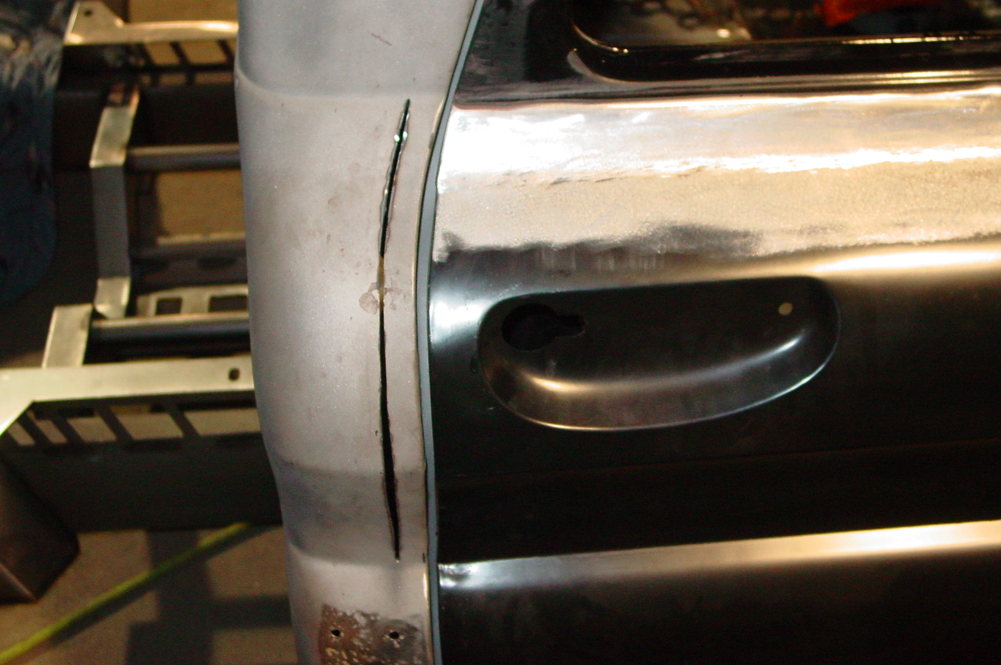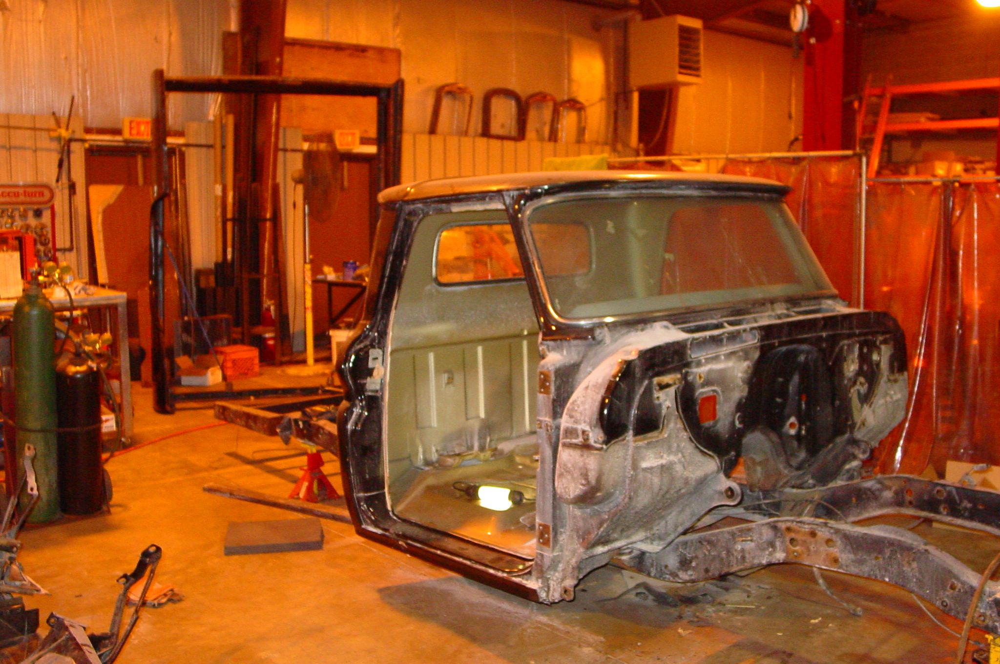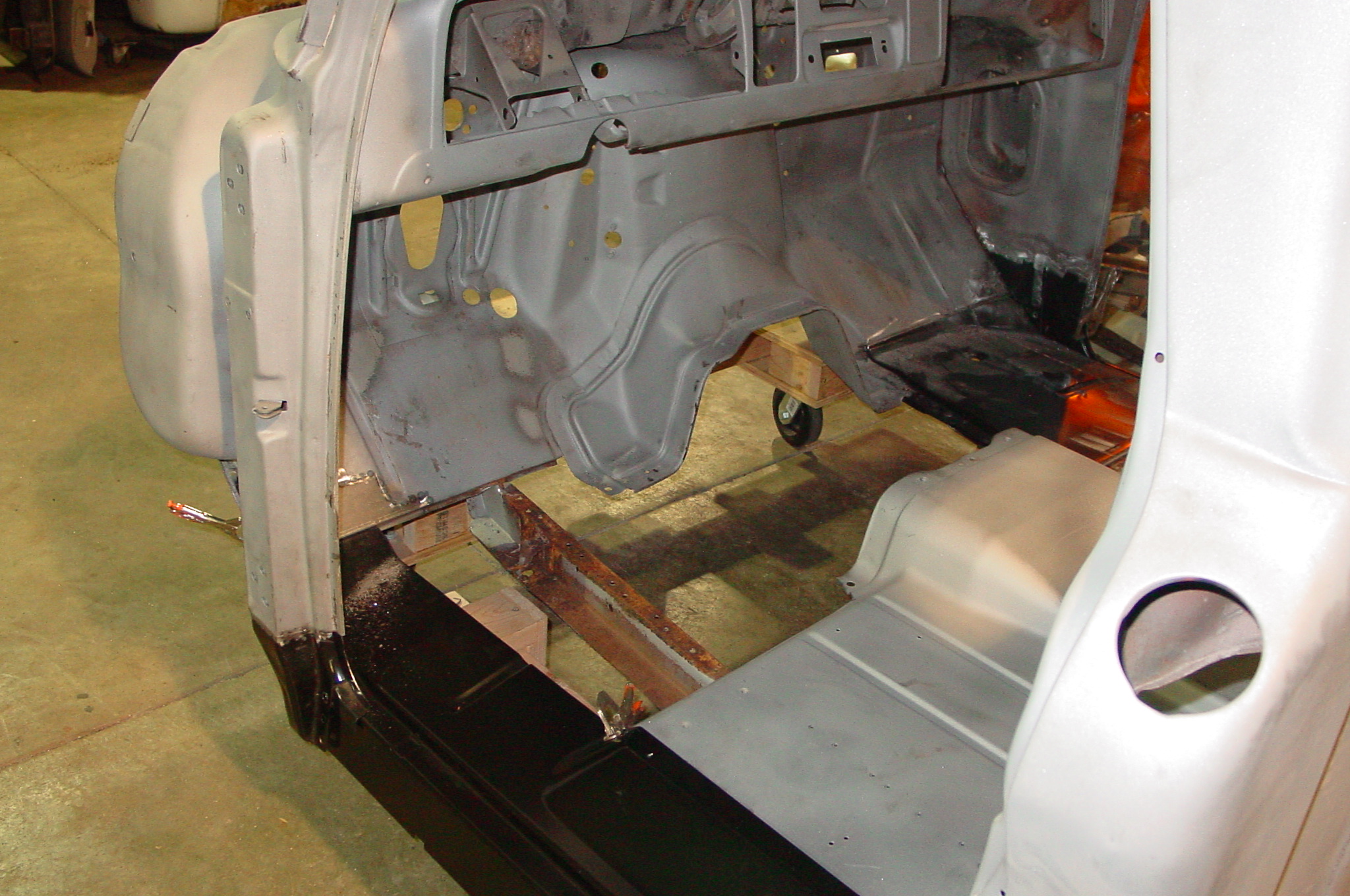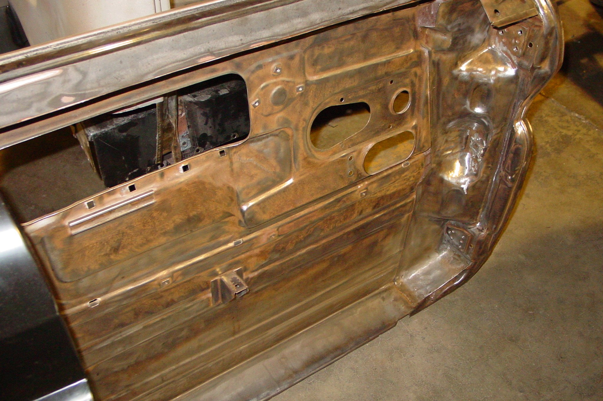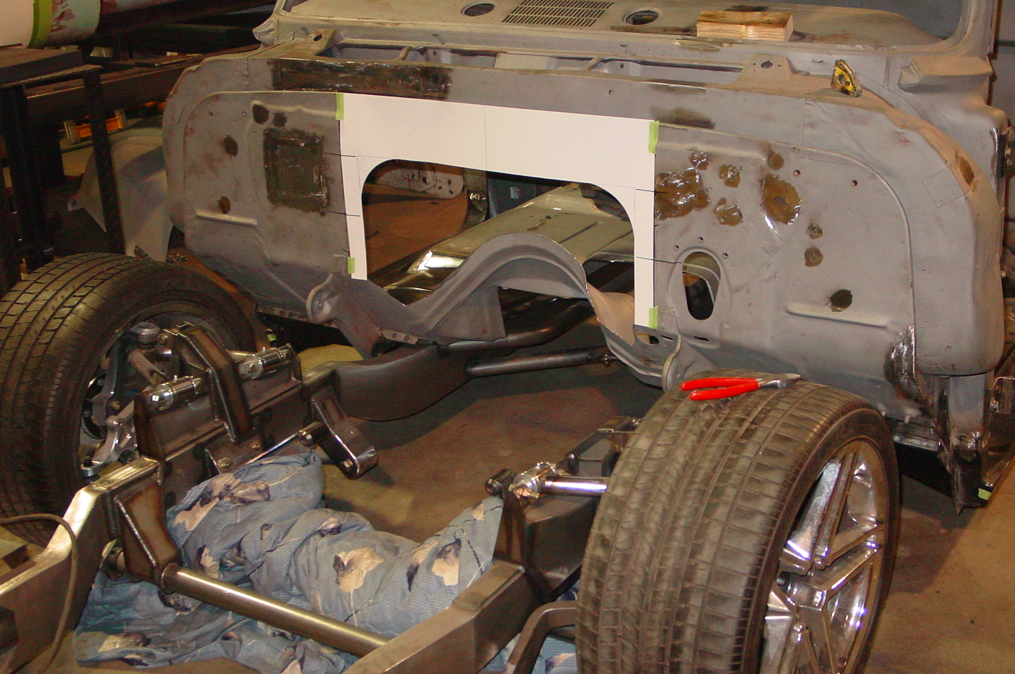 After blasting the old paint off we found a lot of filler over the rust holes. We removed the old rusted metal and replaced them with new steel. Now that the body is solid, the modifications have begun. -- Firewall, inner fenders, front fenders, front bumper, rear bumper, tailgate, and rear wheel opening.