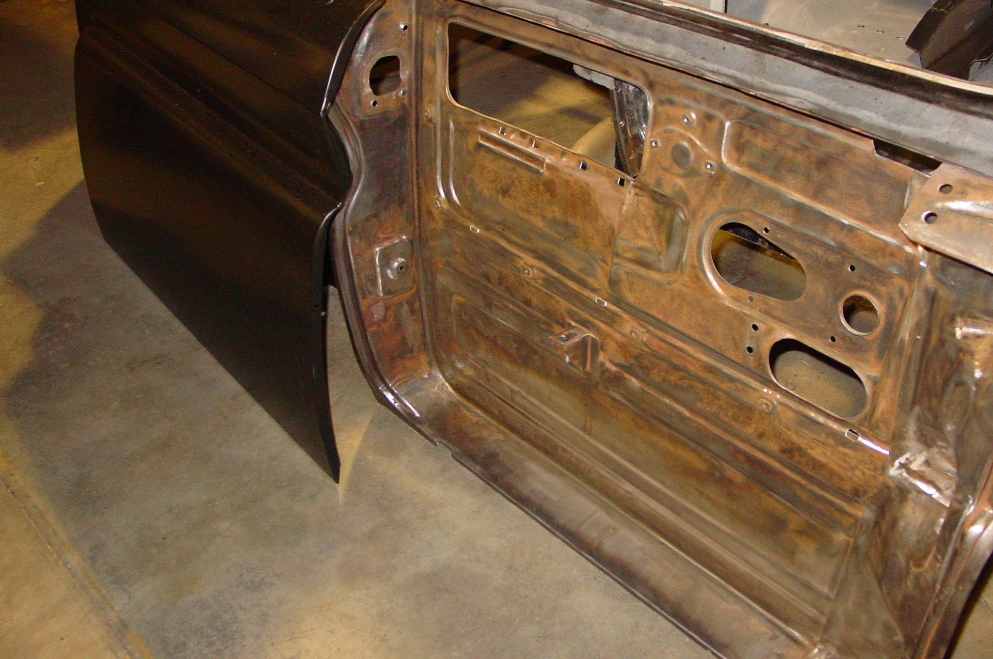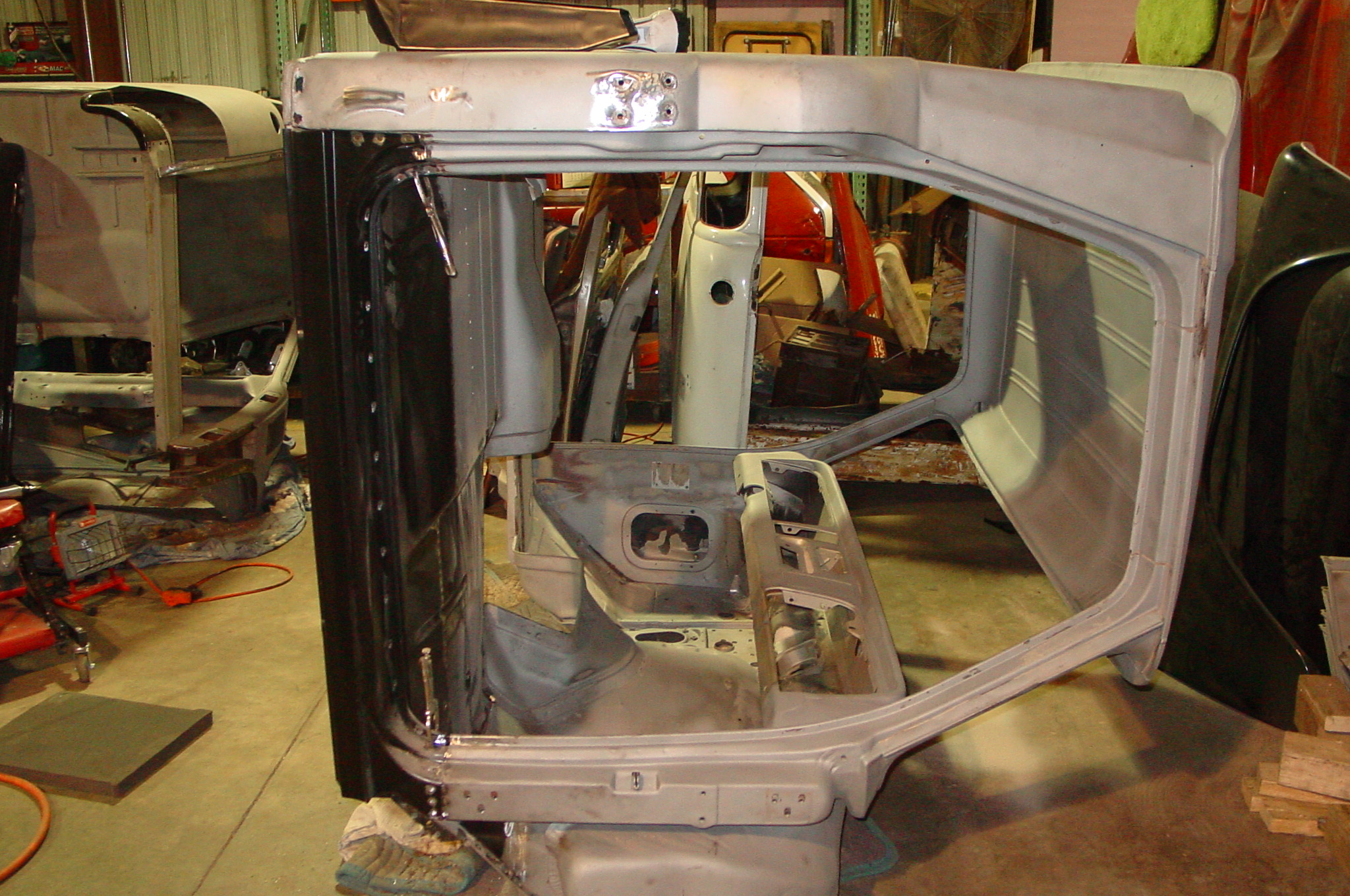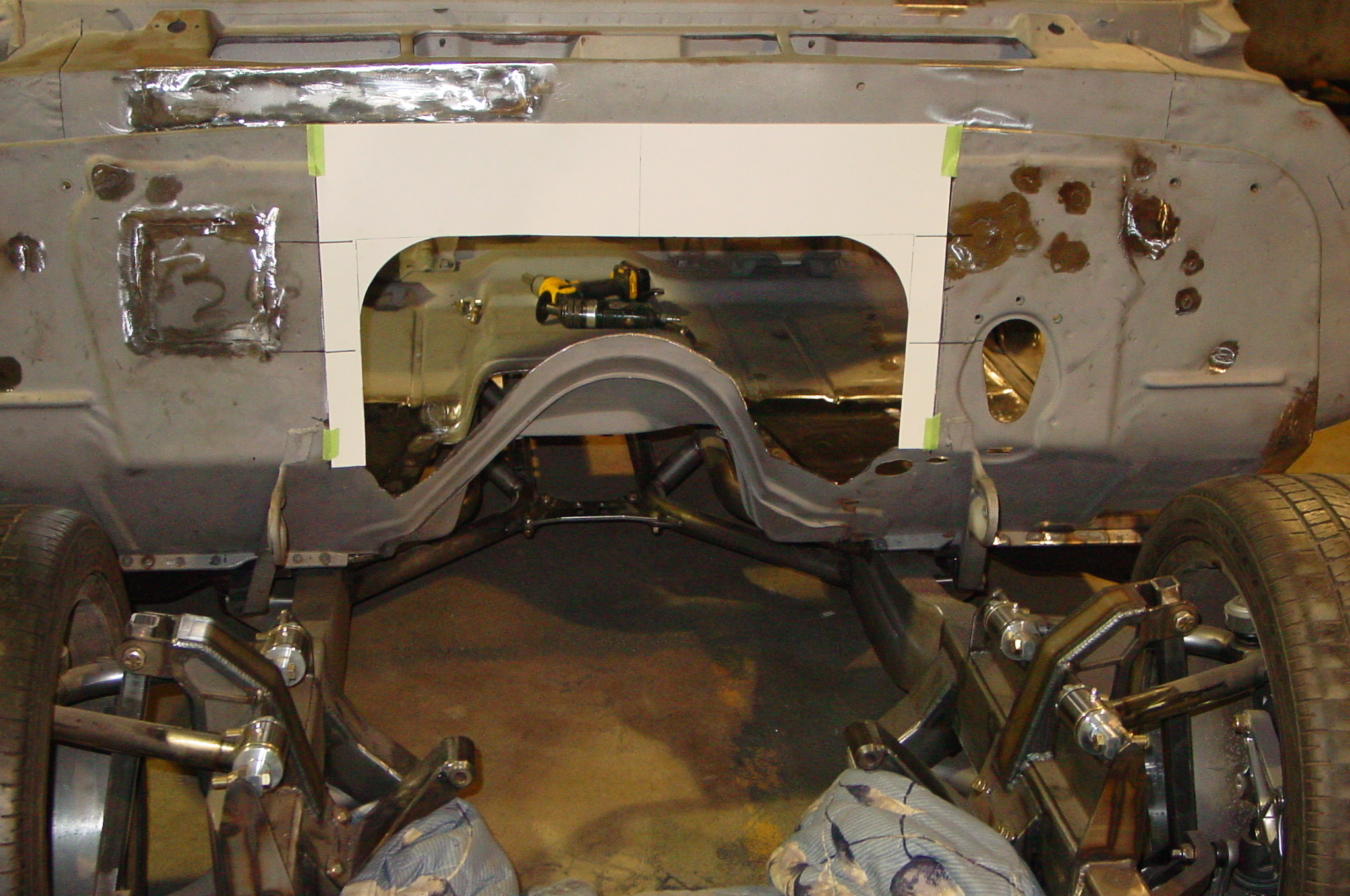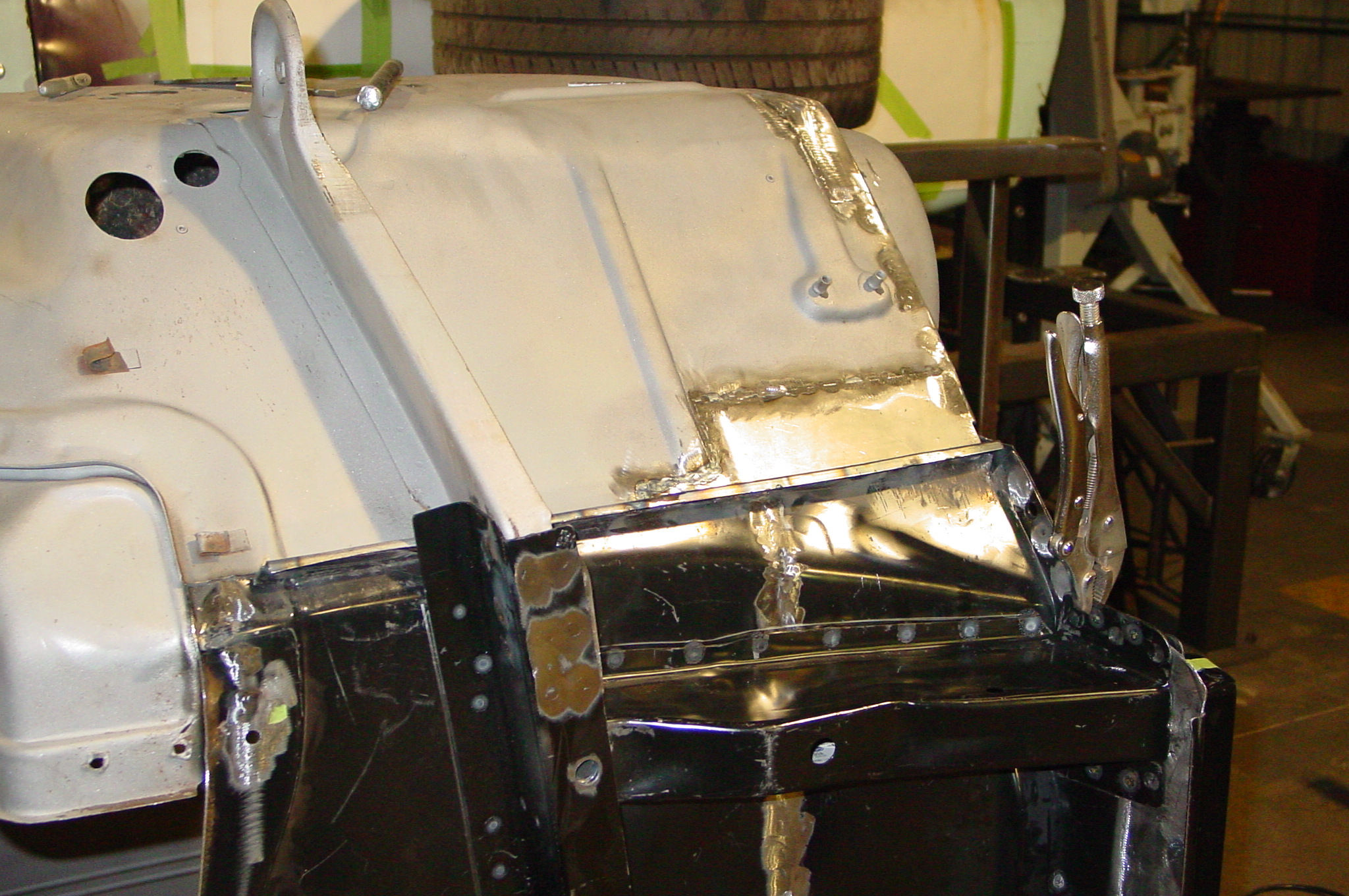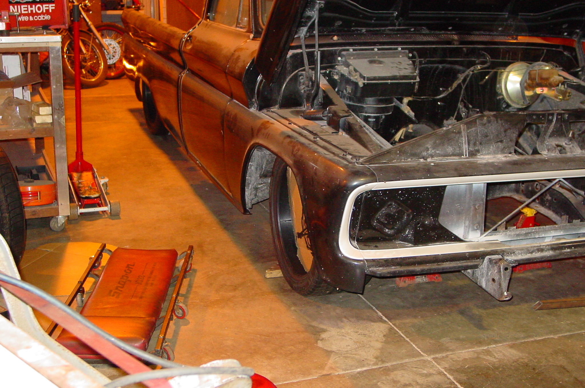 After blasting the old paint off we found a lot of filler over the rust holes. We removed the old rusted metal and replaced them with new steel. Now that the body is solid, the modifications have begun. -- Firewall, inner fenders, front fenders, front bumper, rear bumper, tailgate, and rear wheel opening.