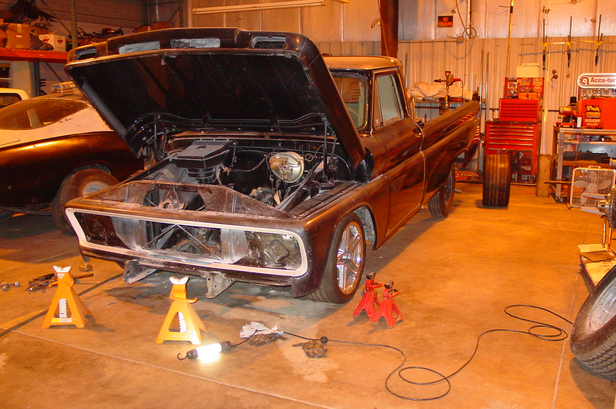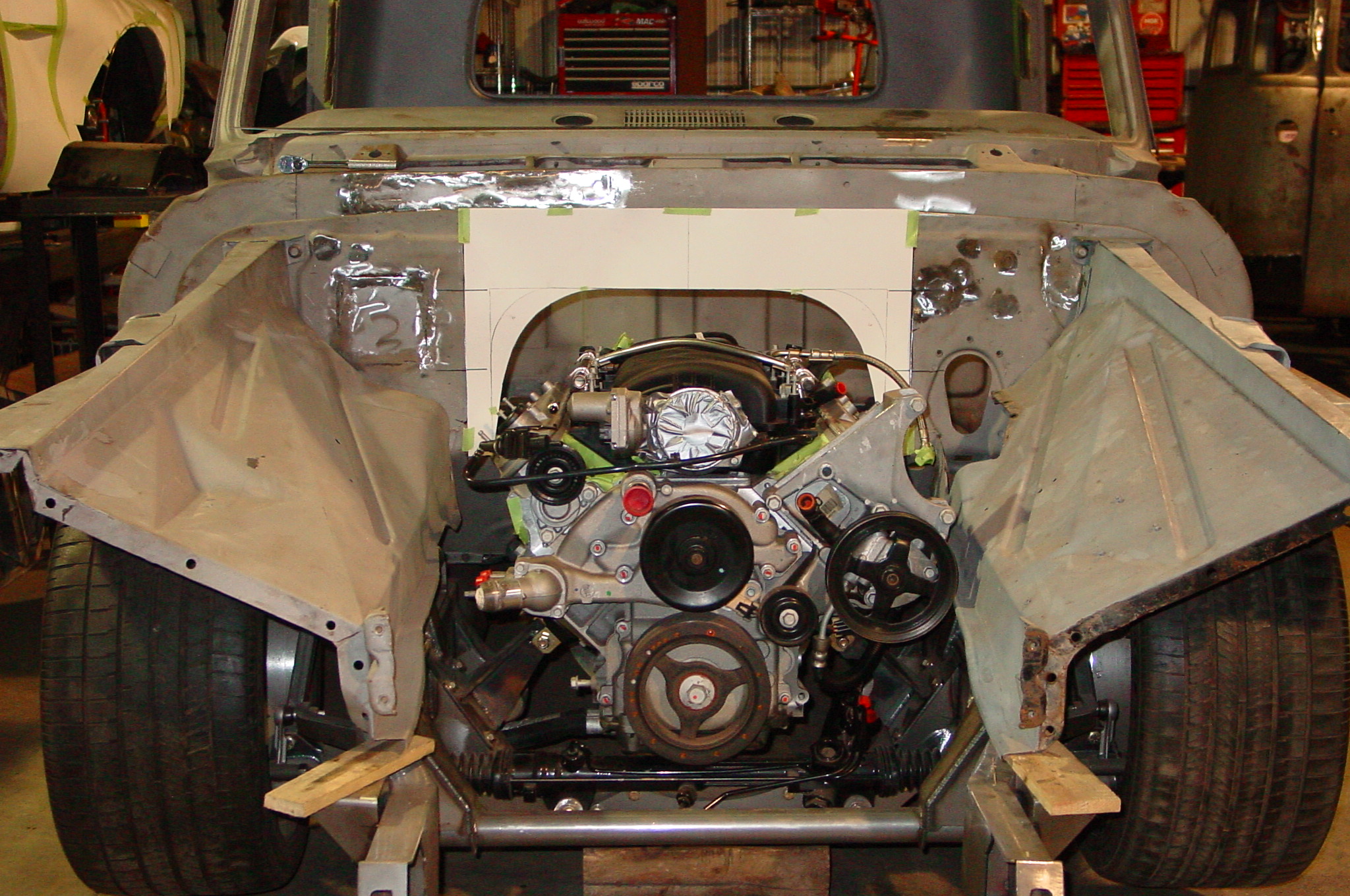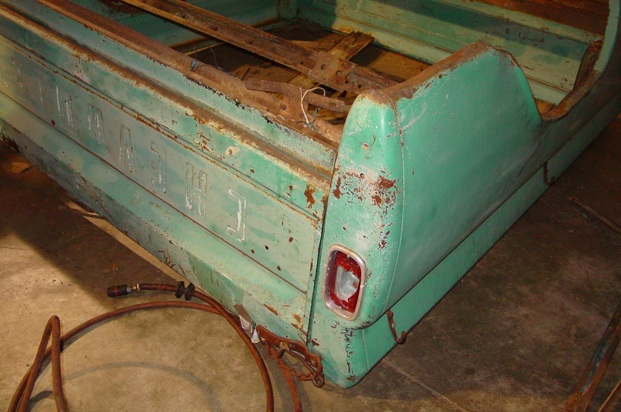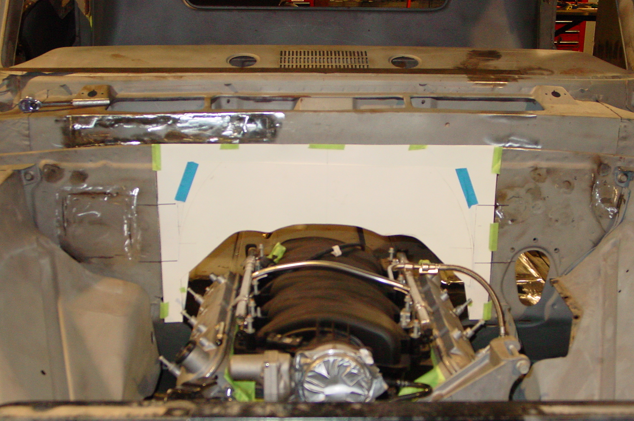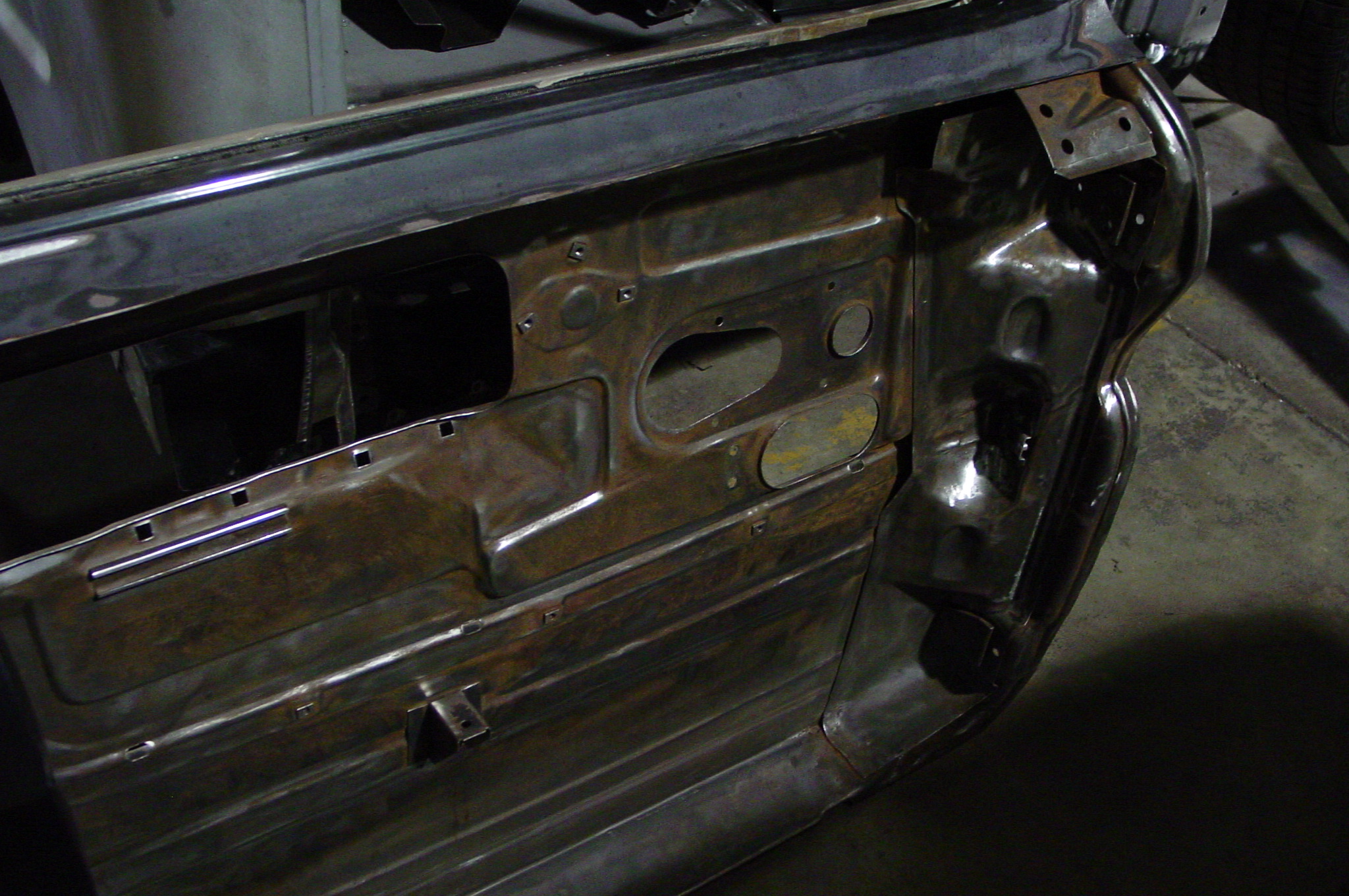 After blasting the old paint off we found a lot of filler over the rust holes. We removed the old rusted metal and replaced them with new steel. Now that the body is solid, the modifications have begun. -- Firewall, inner fenders, front fenders, front bumper, rear bumper, tailgate, and rear wheel opening.