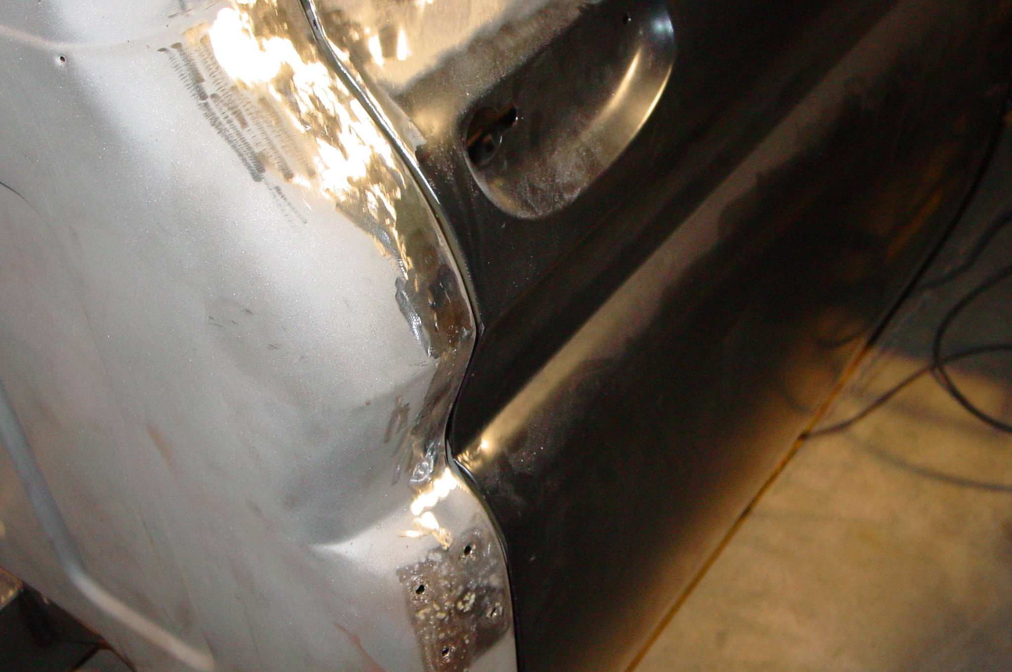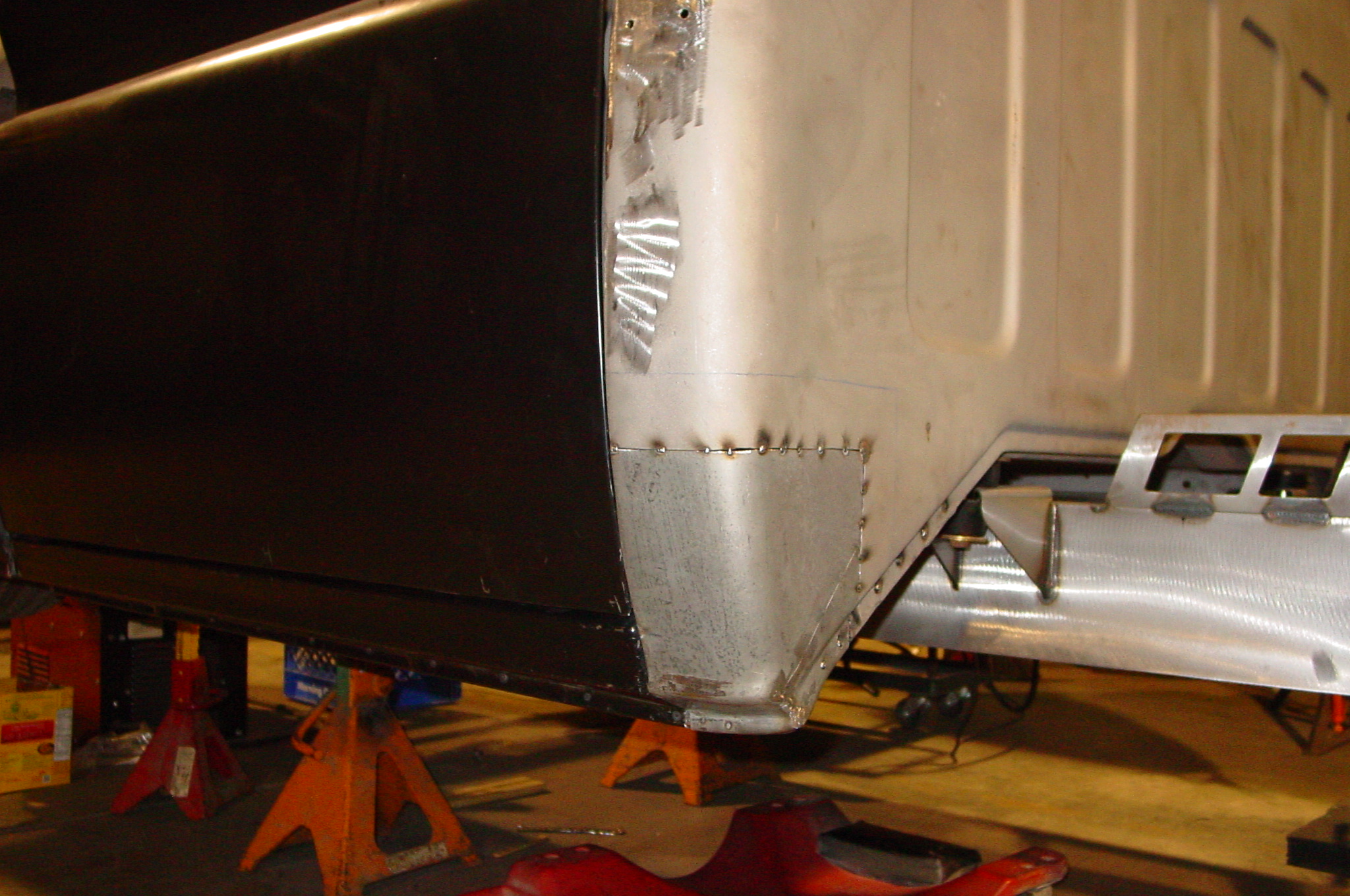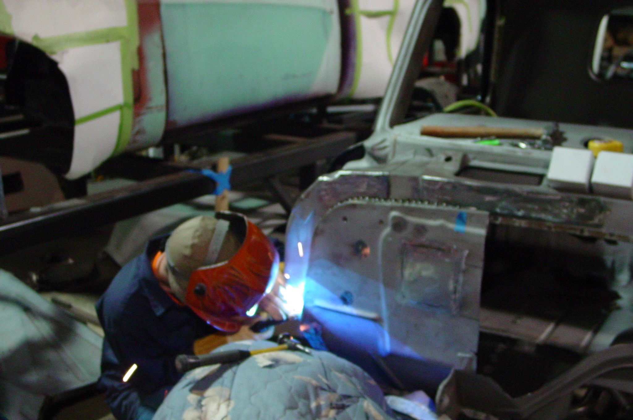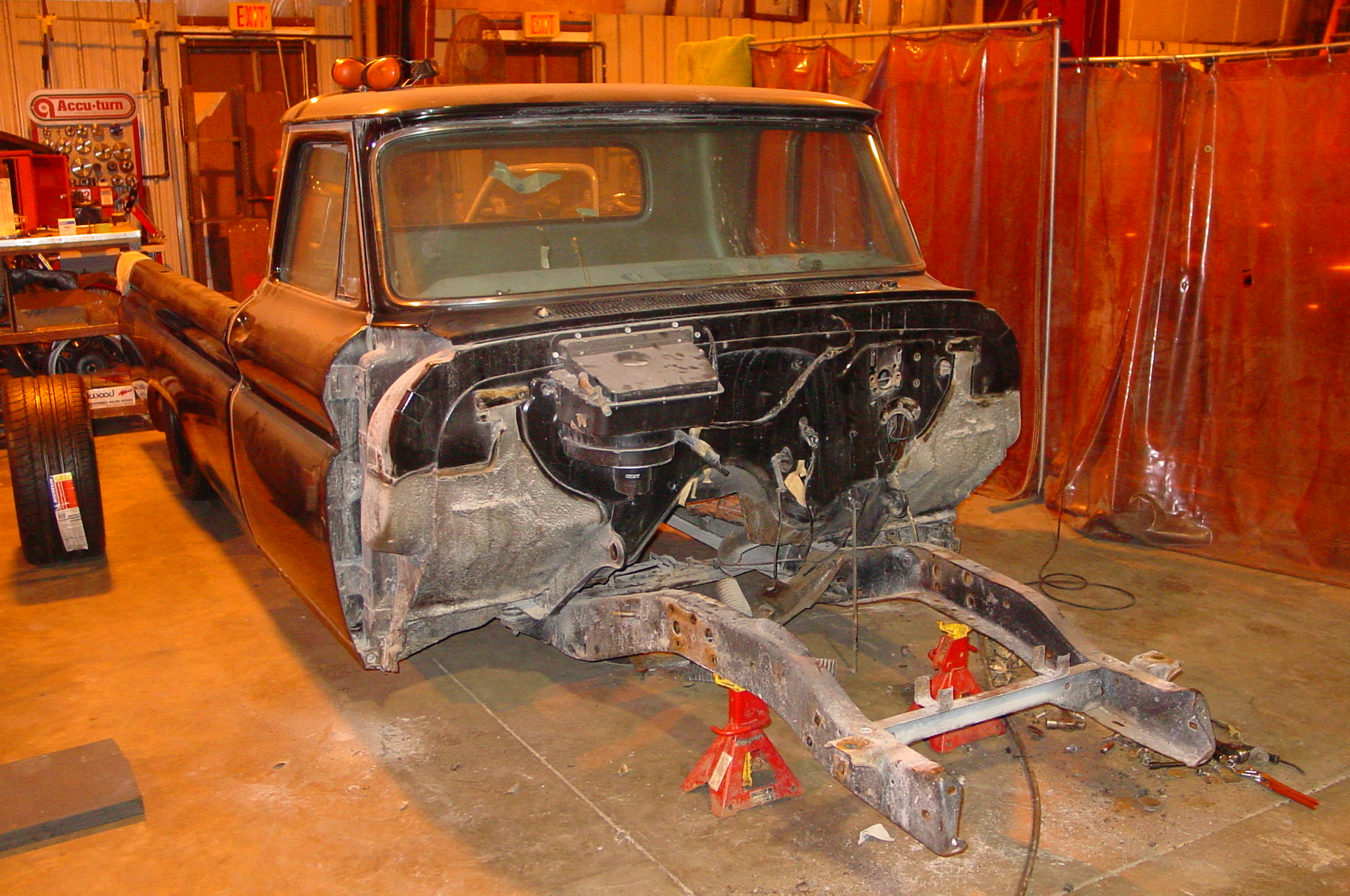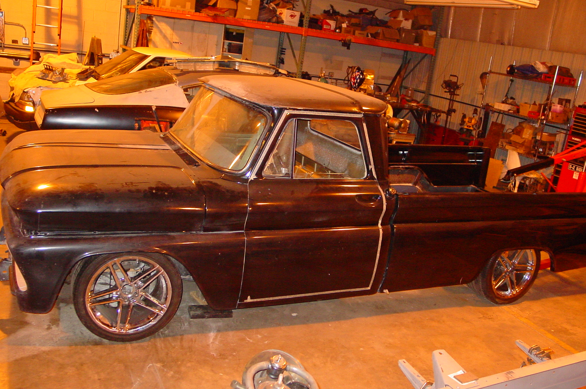 After blasting the old paint off we found a lot of filler over the rust holes. We removed the old rusted metal and replaced them with new steel. Now that the body is solid, the modifications have begun. -- Firewall, inner fenders, front fenders, front bumper, rear bumper, tailgate, and rear wheel opening.
