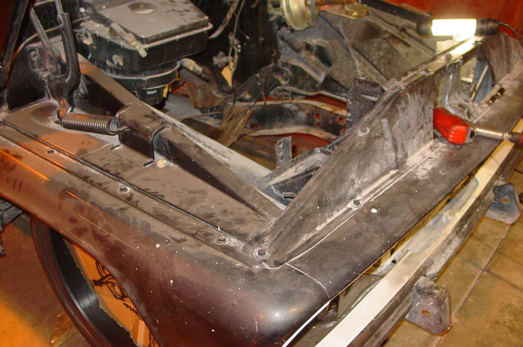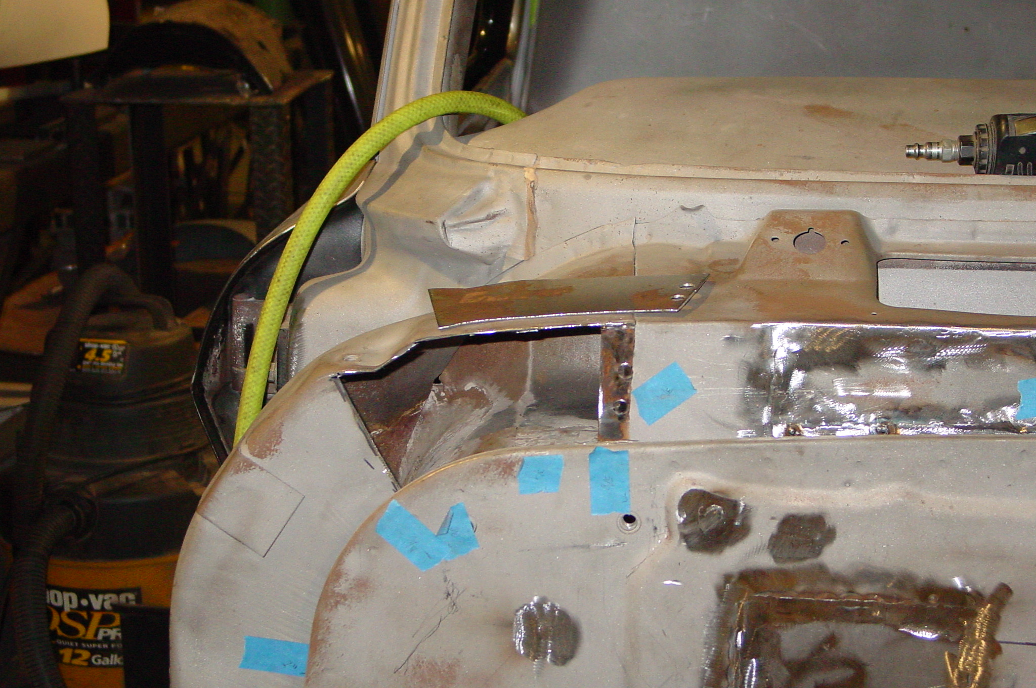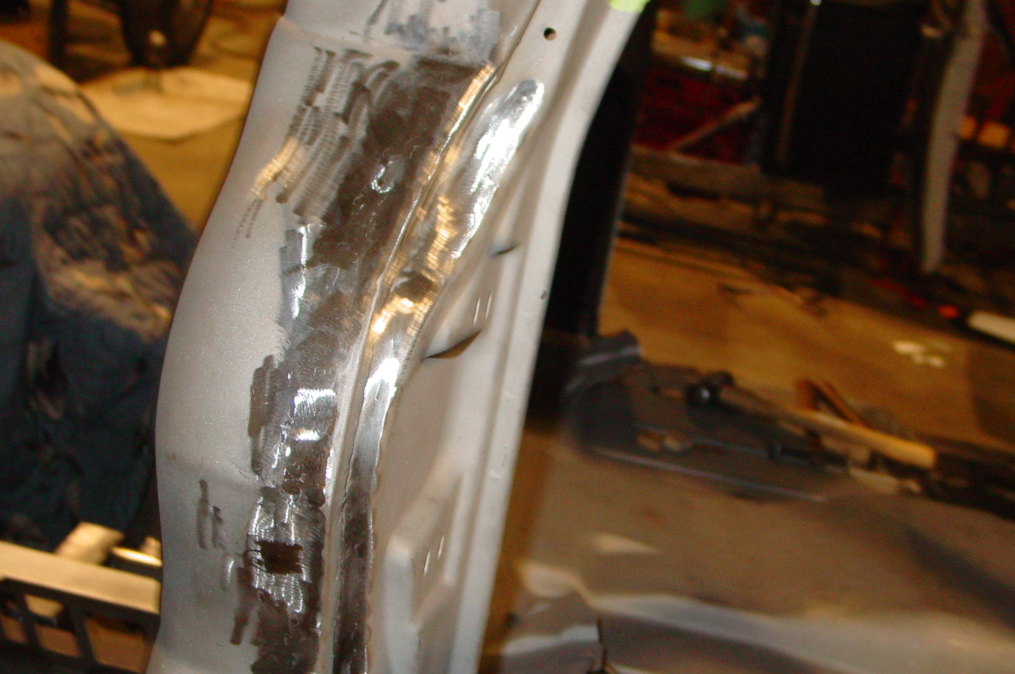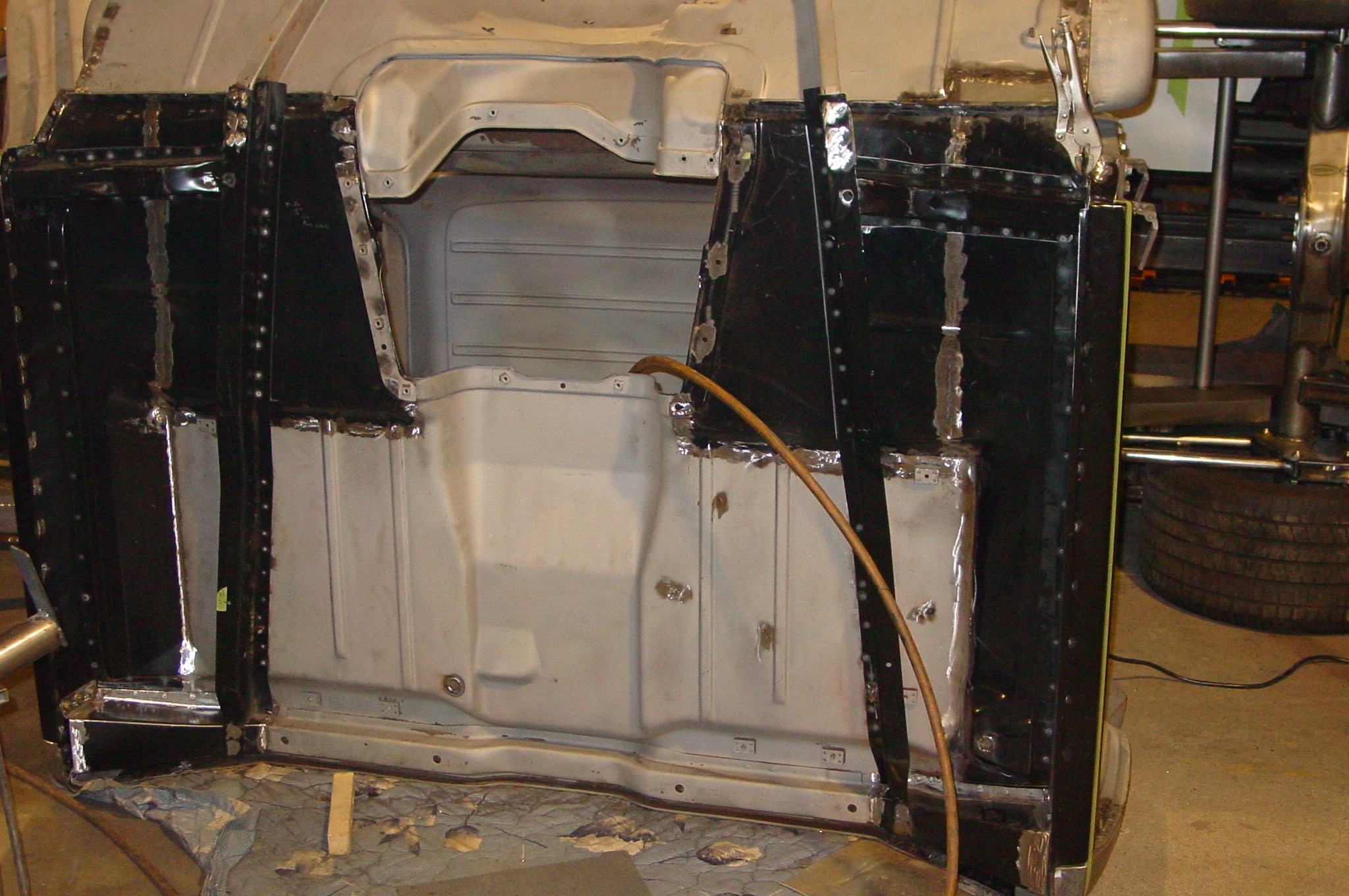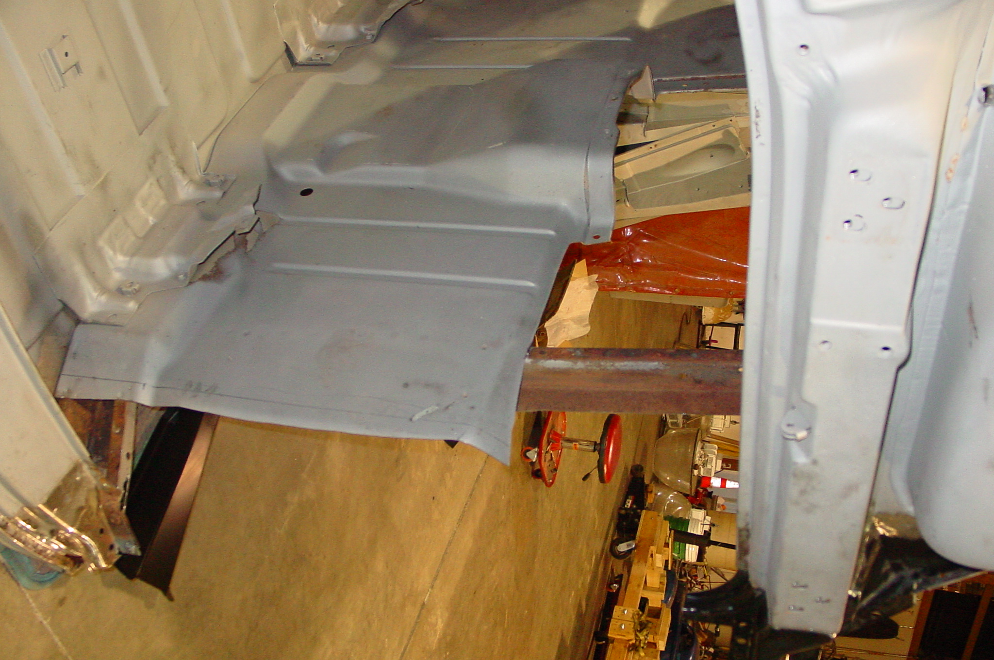 After blasting the old paint off we found a lot of filler over the rust holes. We removed the old rusted metal and replaced them with new steel. Now that the body is solid, the modifications have begun. -- Firewall, inner fenders, front fenders, front bumper, rear bumper, tailgate, and rear wheel opening.