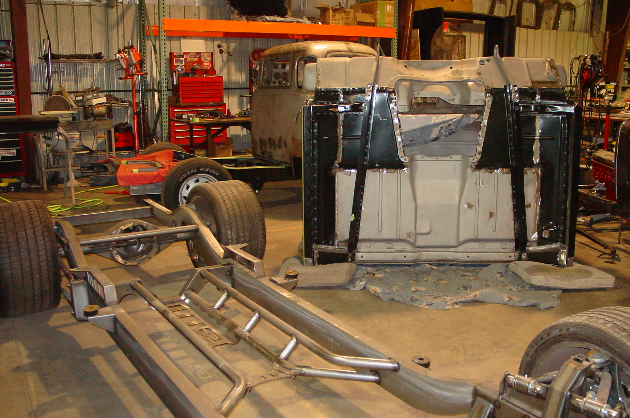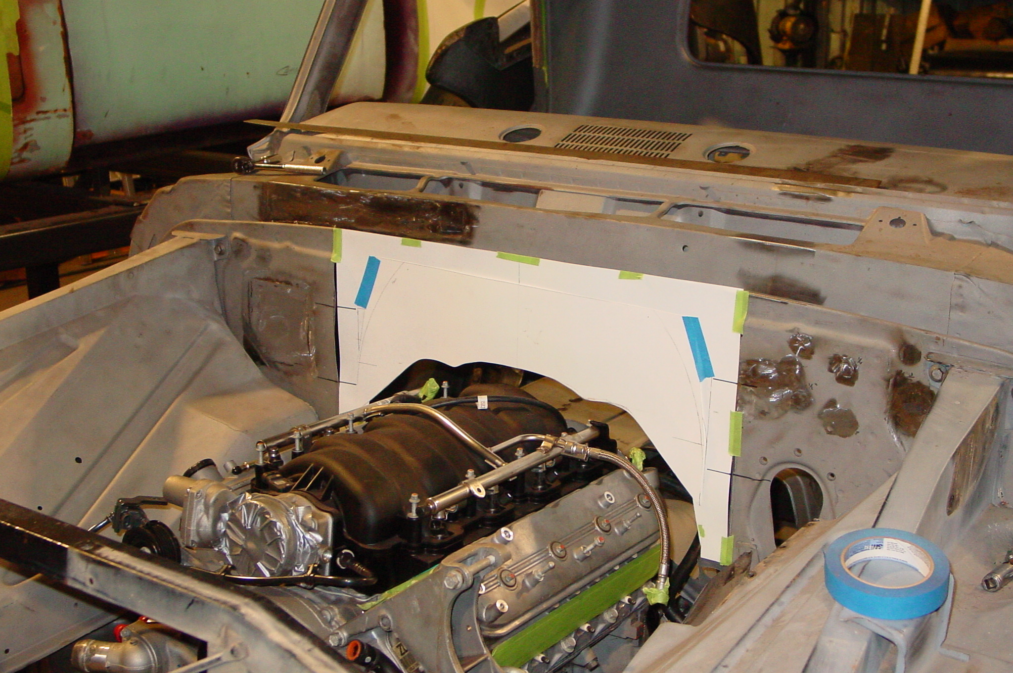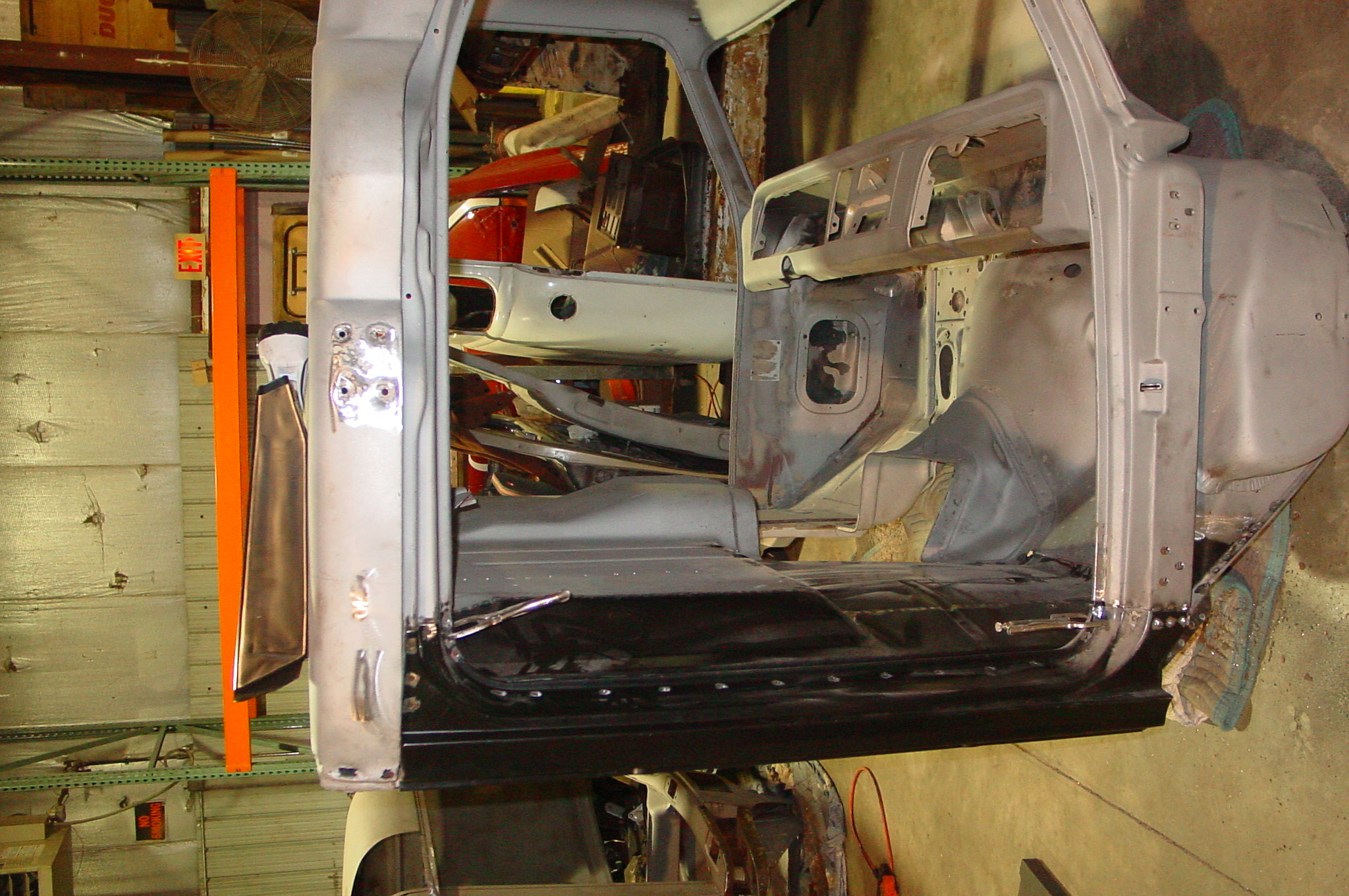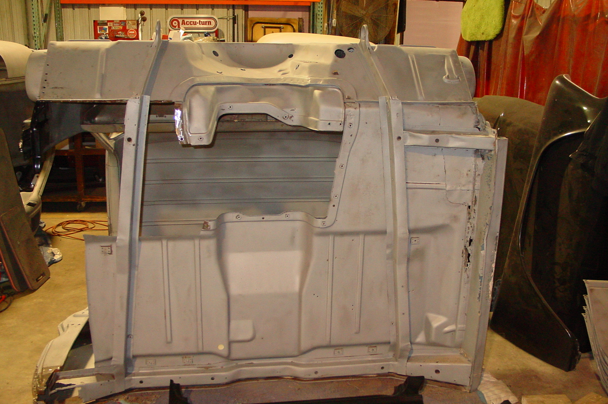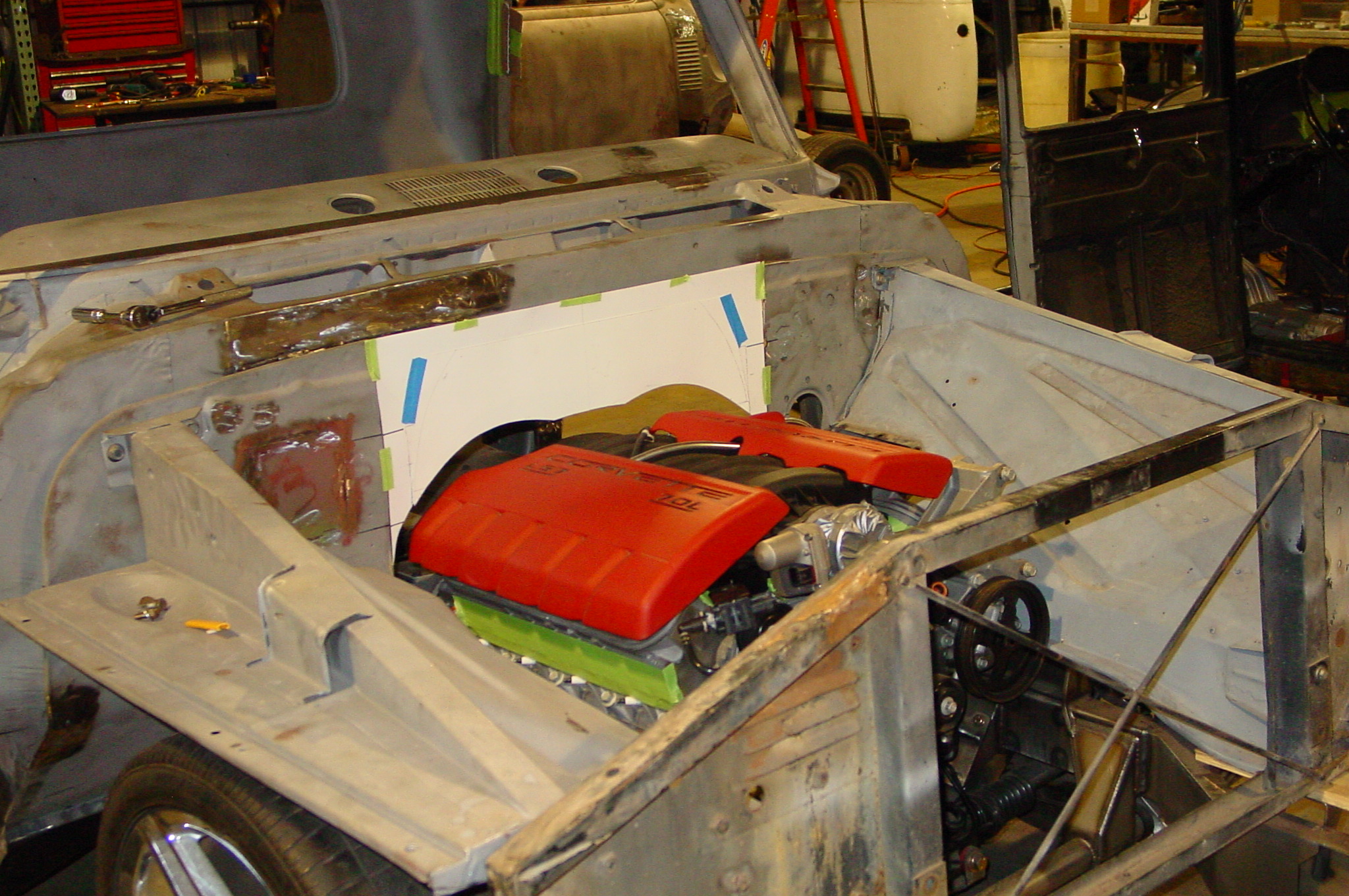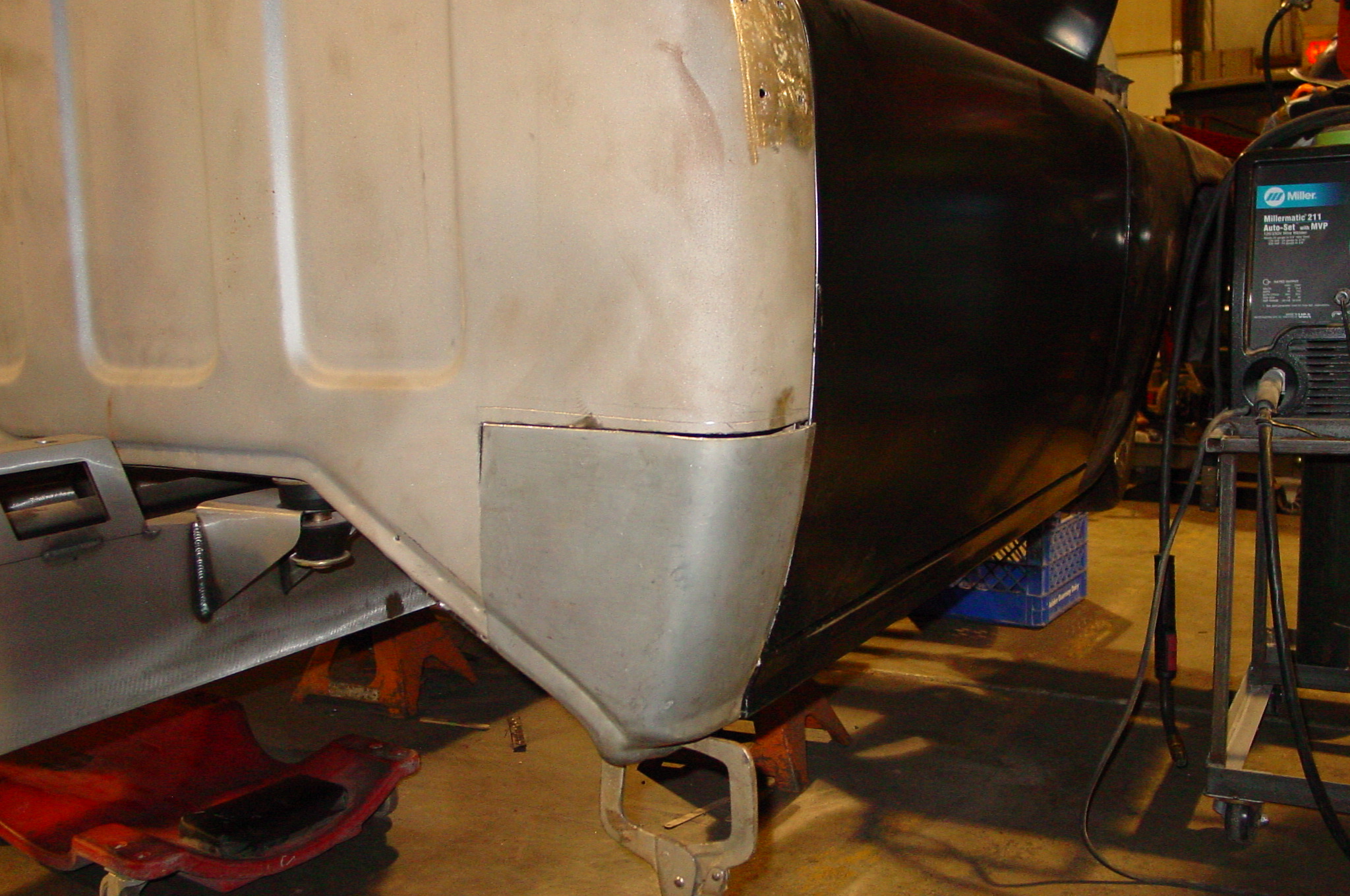 After blasting the old paint off we found a lot of filler over the rust holes. We removed the old rusted metal and replaced them with new steel. Now that the body is solid, the modifications have begun. -- Firewall, inner fenders, front fenders, front bumper, rear bumper, tailgate, and rear wheel opening.
