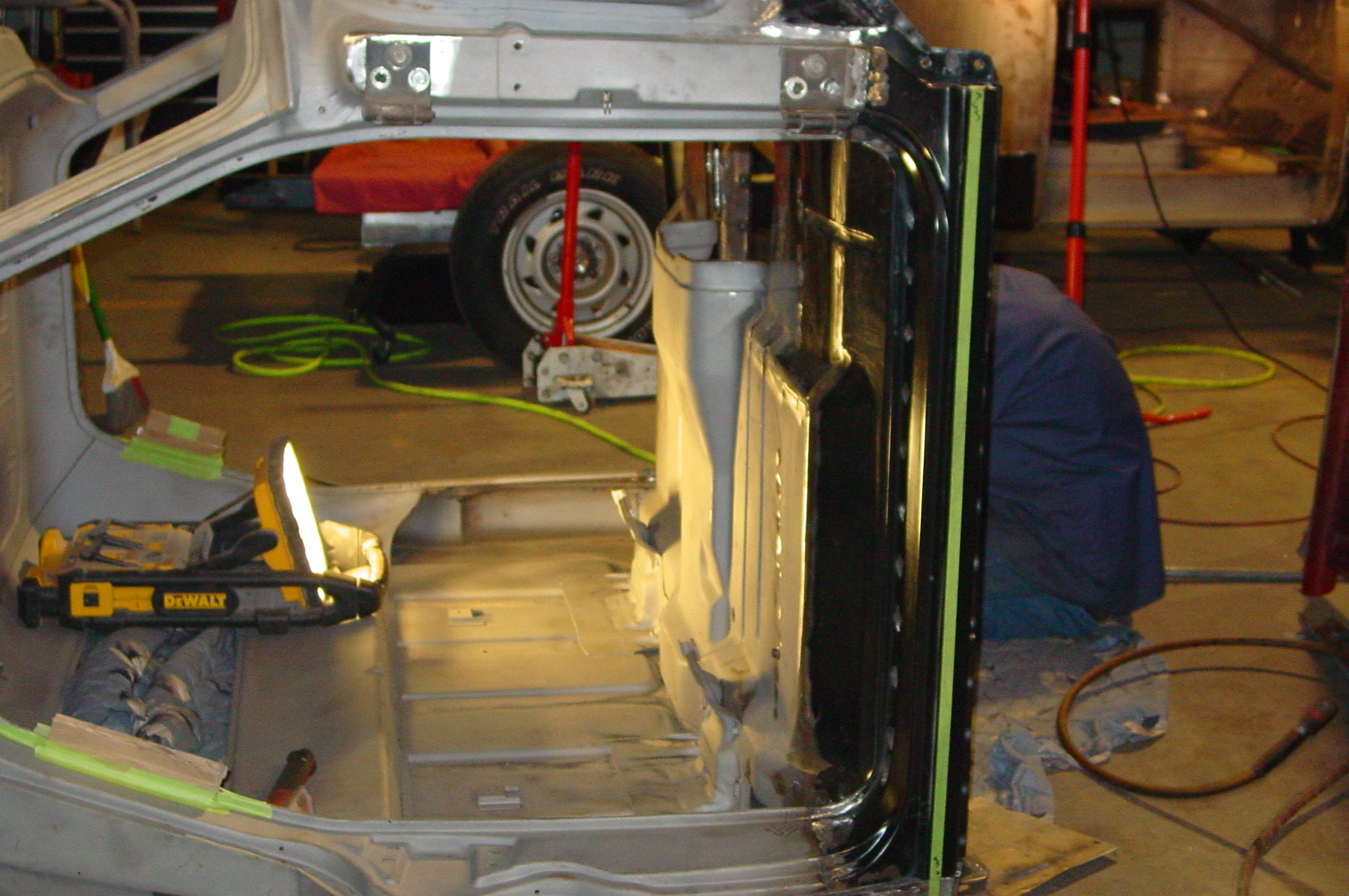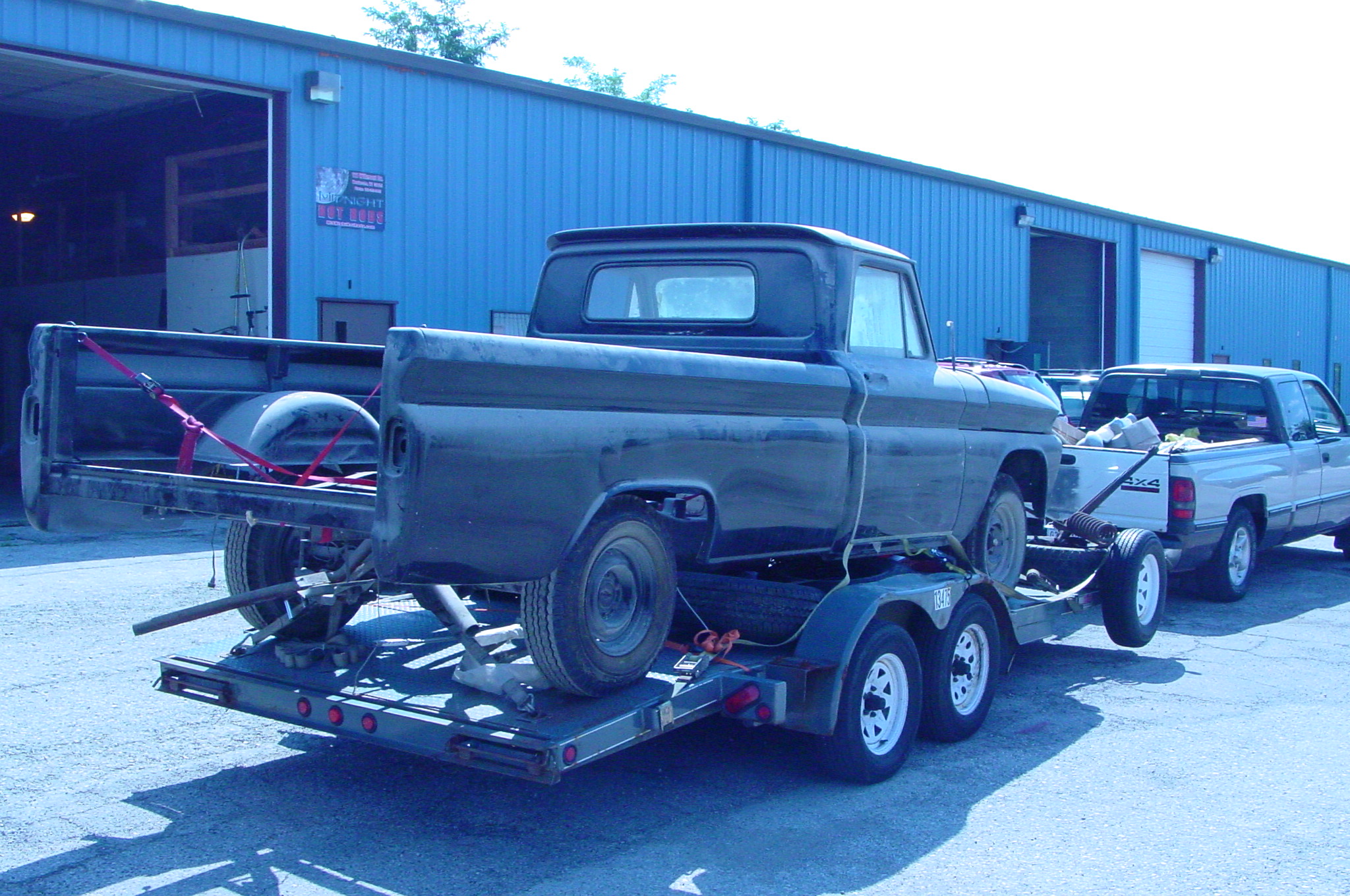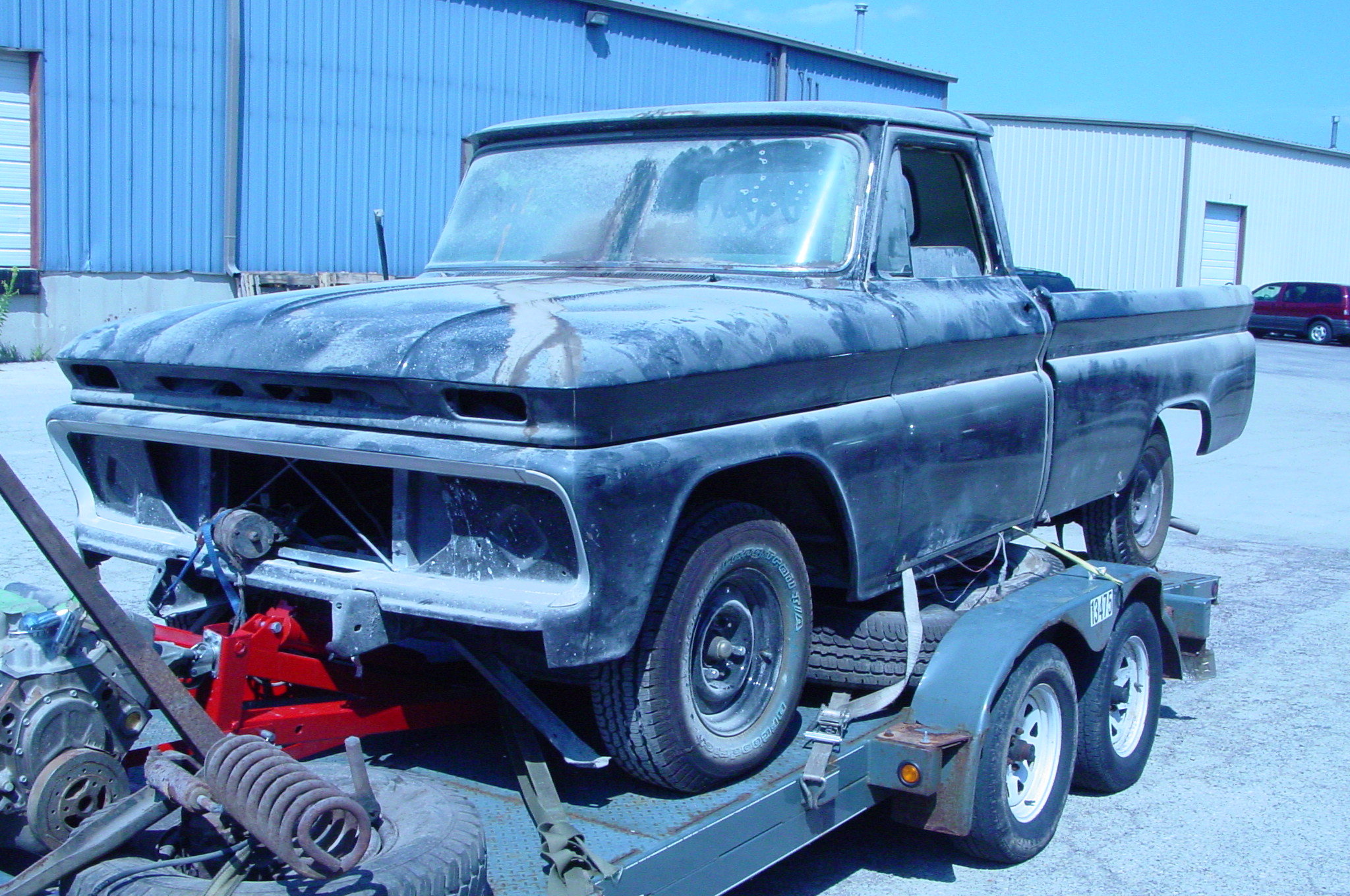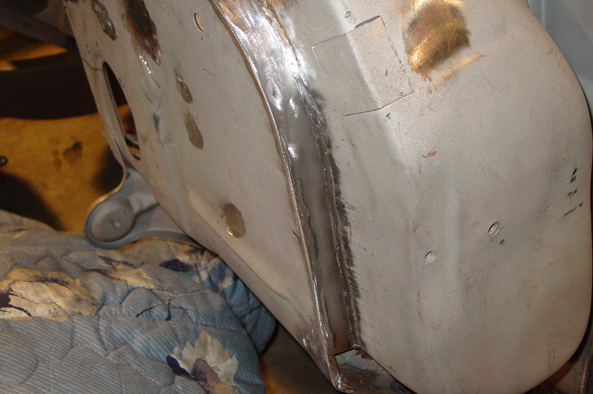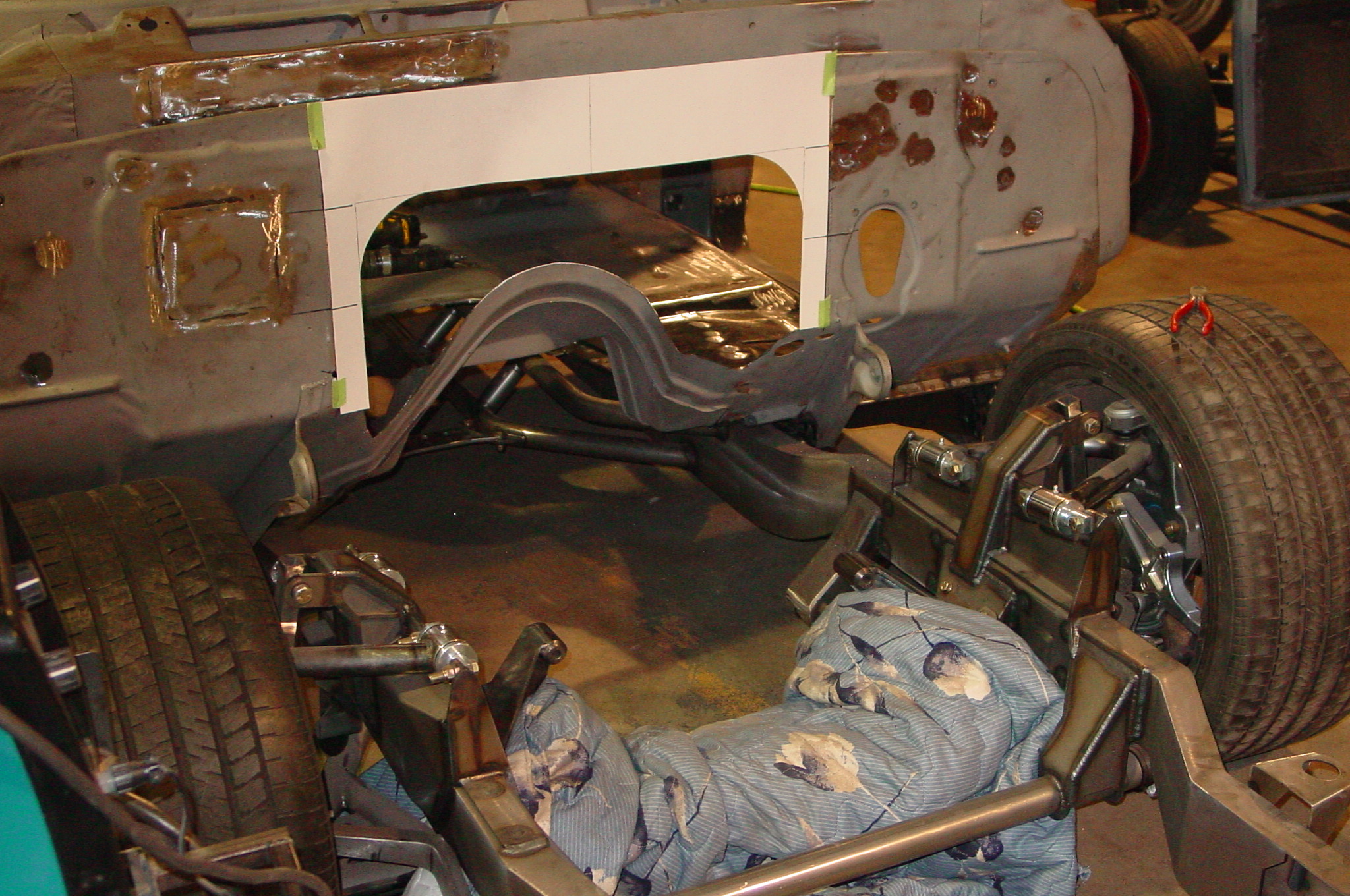 After blasting the old paint off we found a lot of filler over the rust holes. We removed the old rusted metal and replaced them with new steel. Now that the body is solid, the modifications have begun. -- Firewall, inner fenders, front fenders, front bumper, rear bumper, tailgate, and rear wheel opening.
