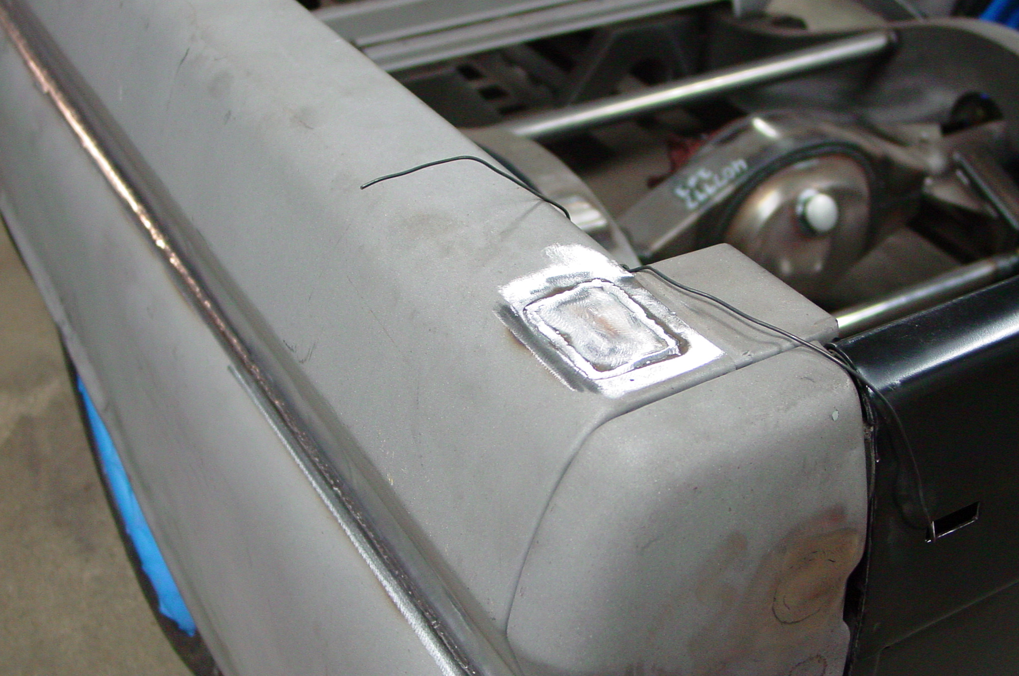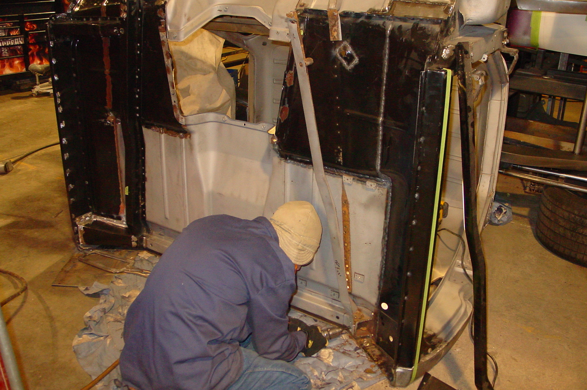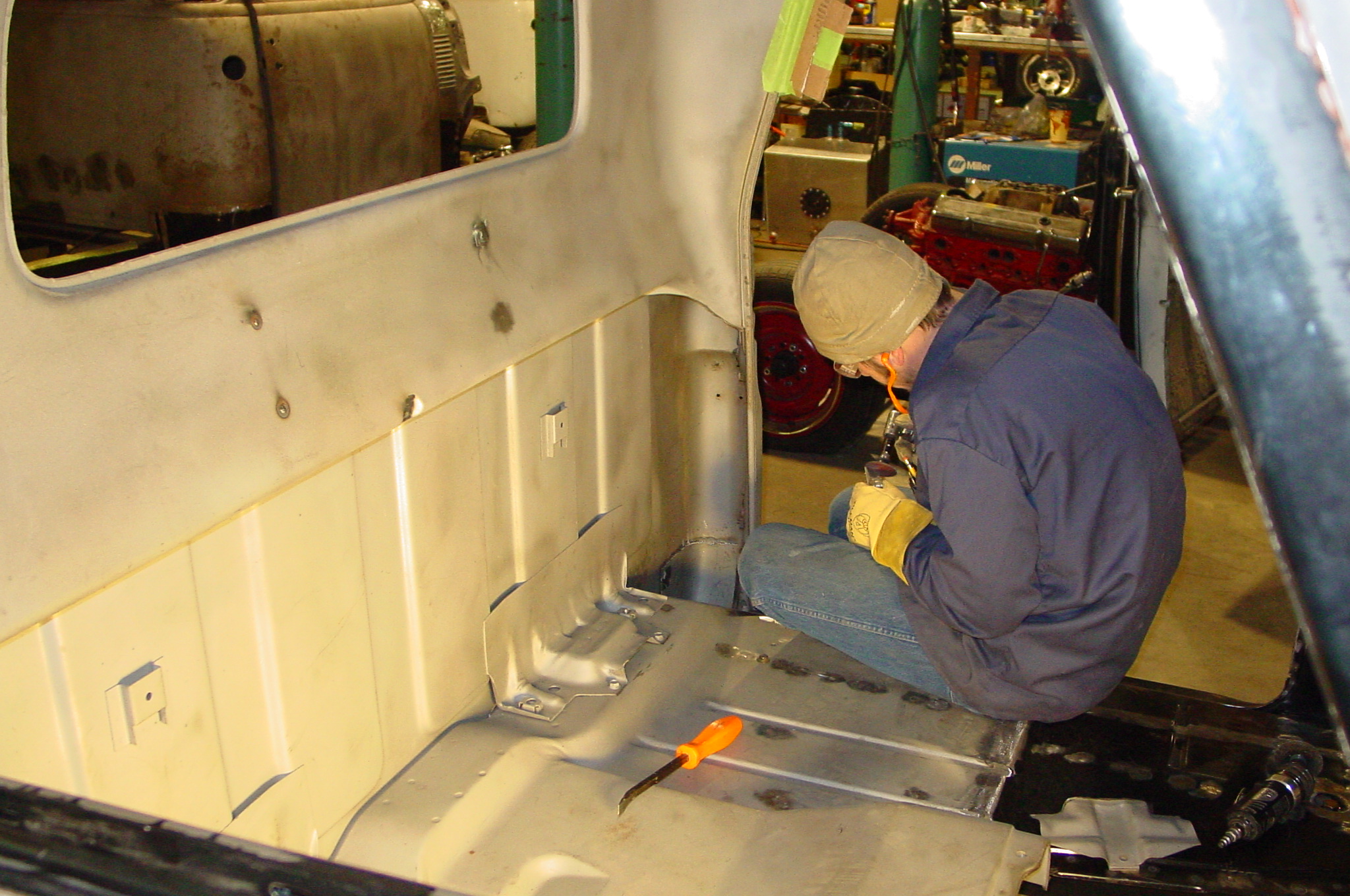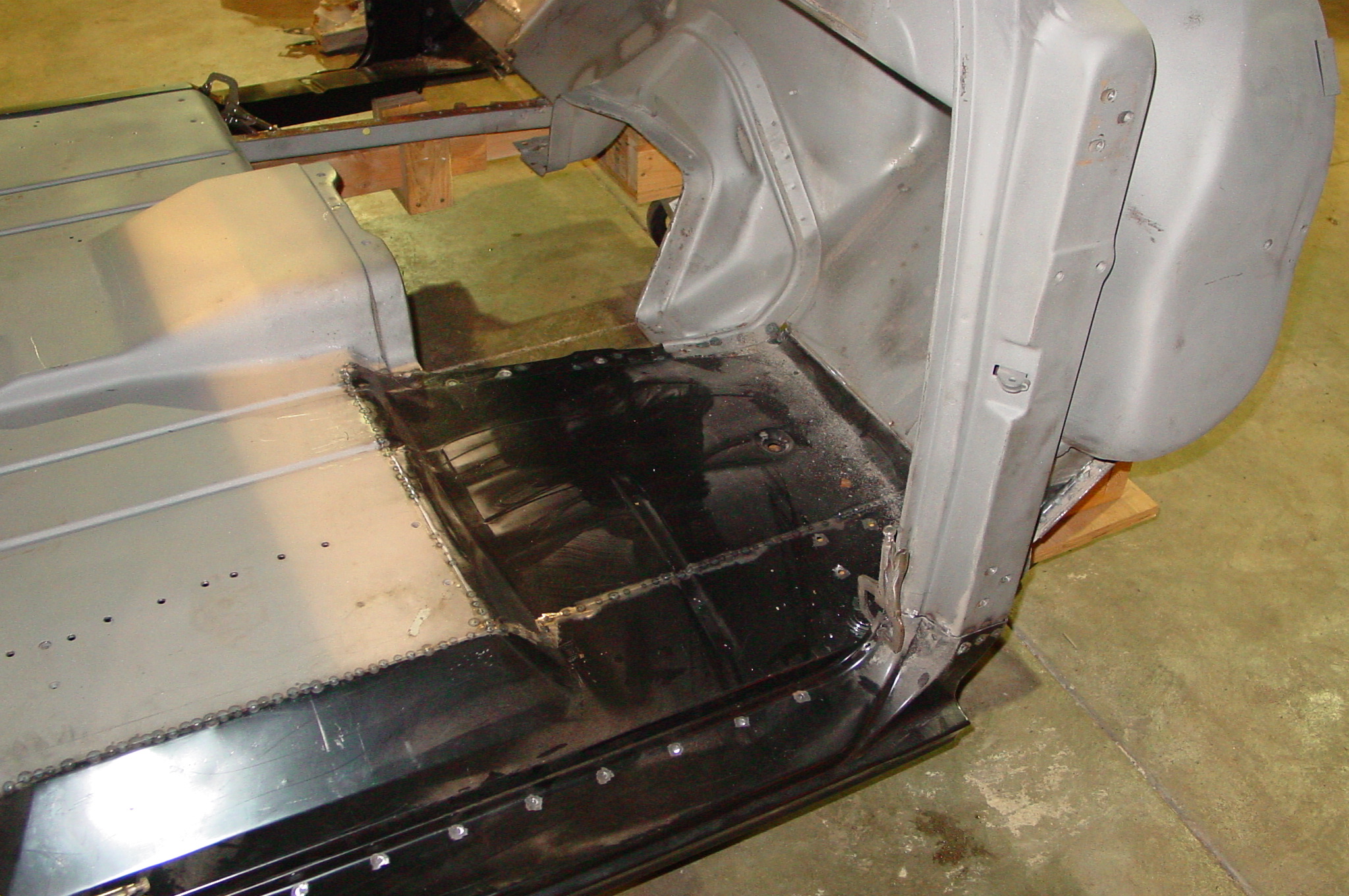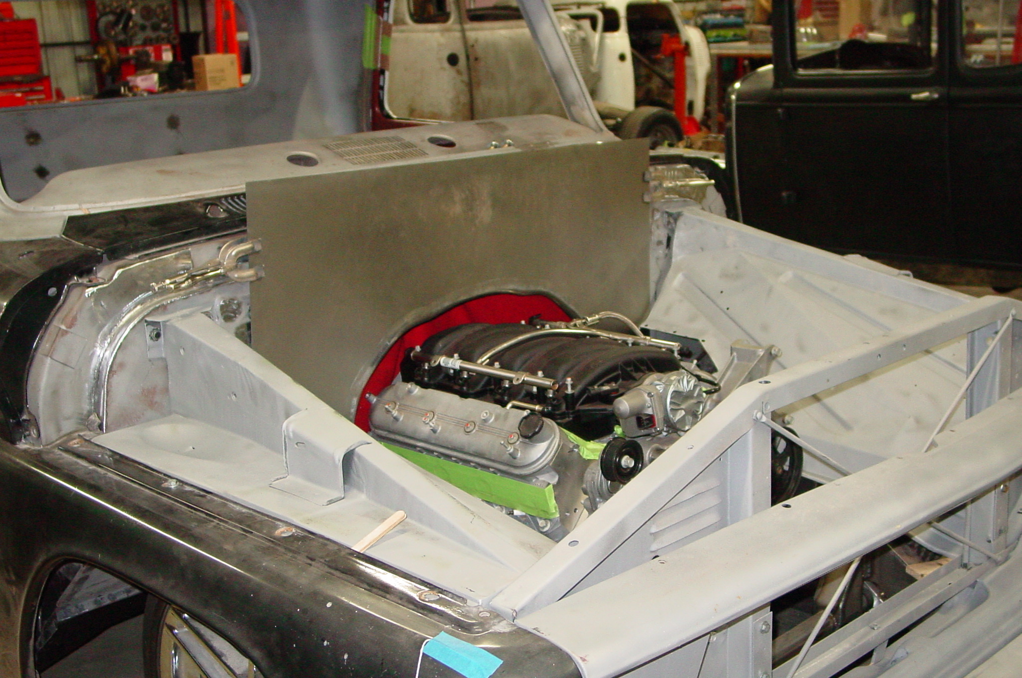 After blasting the old paint off we found a lot of filler over the rust holes. We removed the old rusted metal and replaced them with new steel. Now that the body is solid, the modifications have begun. -- Firewall, inner fenders, front fenders, front bumper, rear bumper, tailgate, and rear wheel opening.