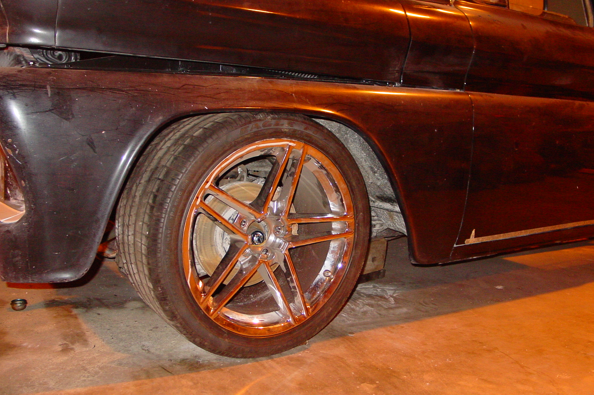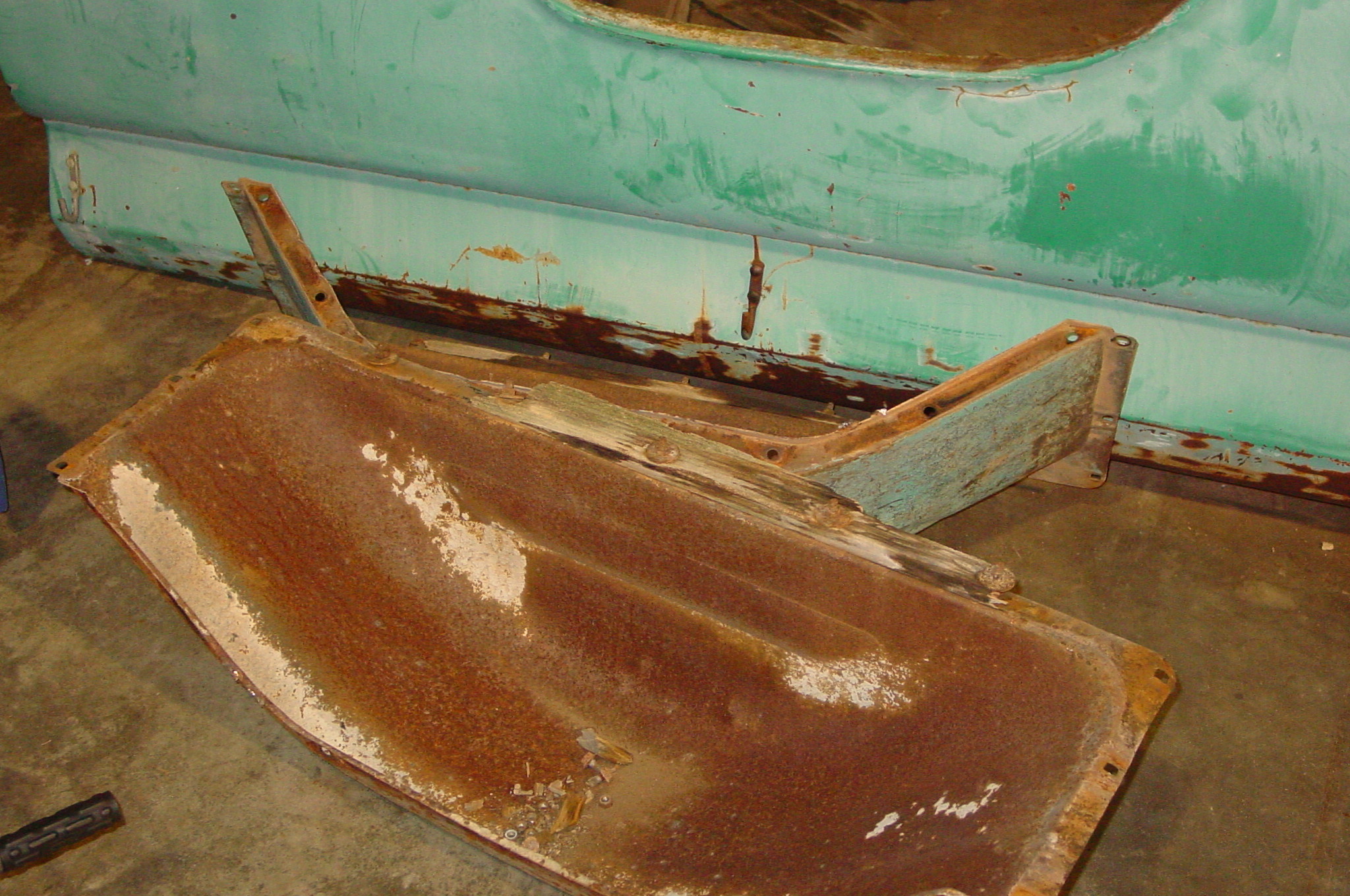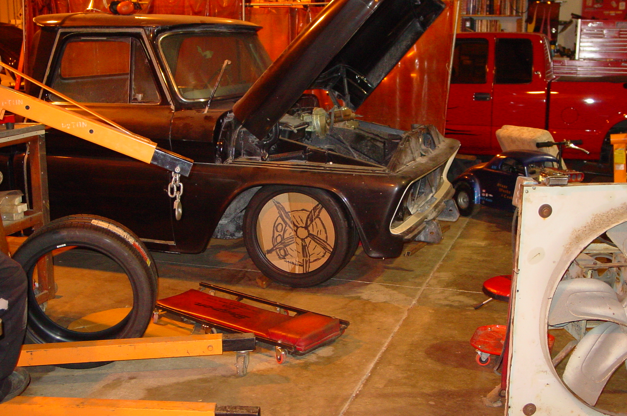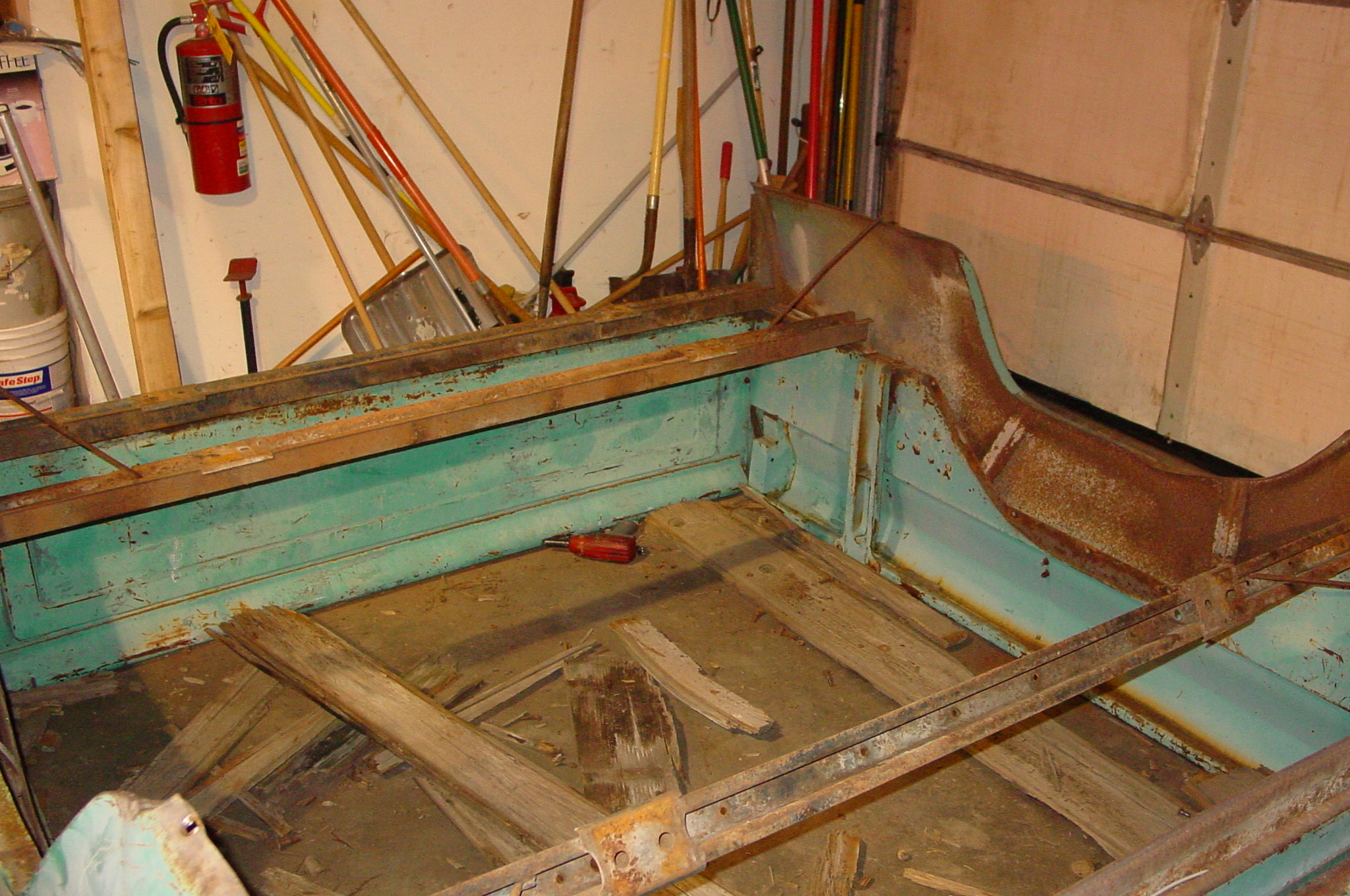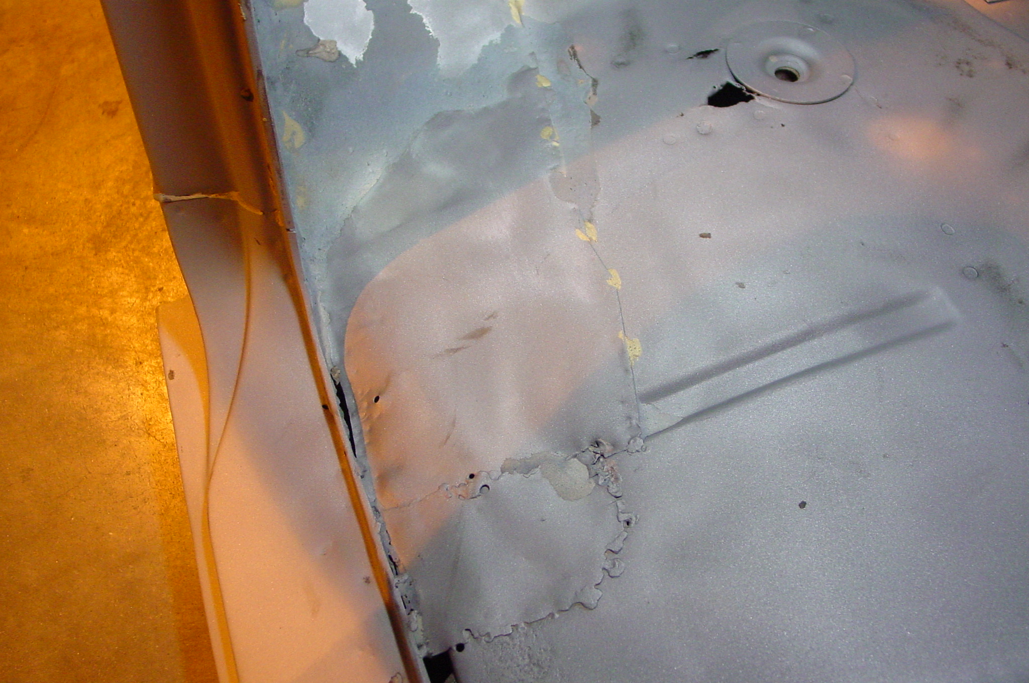 After blasting the old paint off we found a lot of filler over the rust holes. We removed the old rusted metal and replaced them with new steel. Now that the body is solid, the modifications have begun. -- Firewall, inner fenders, front fenders, front bumper, rear bumper, tailgate, and rear wheel opening.