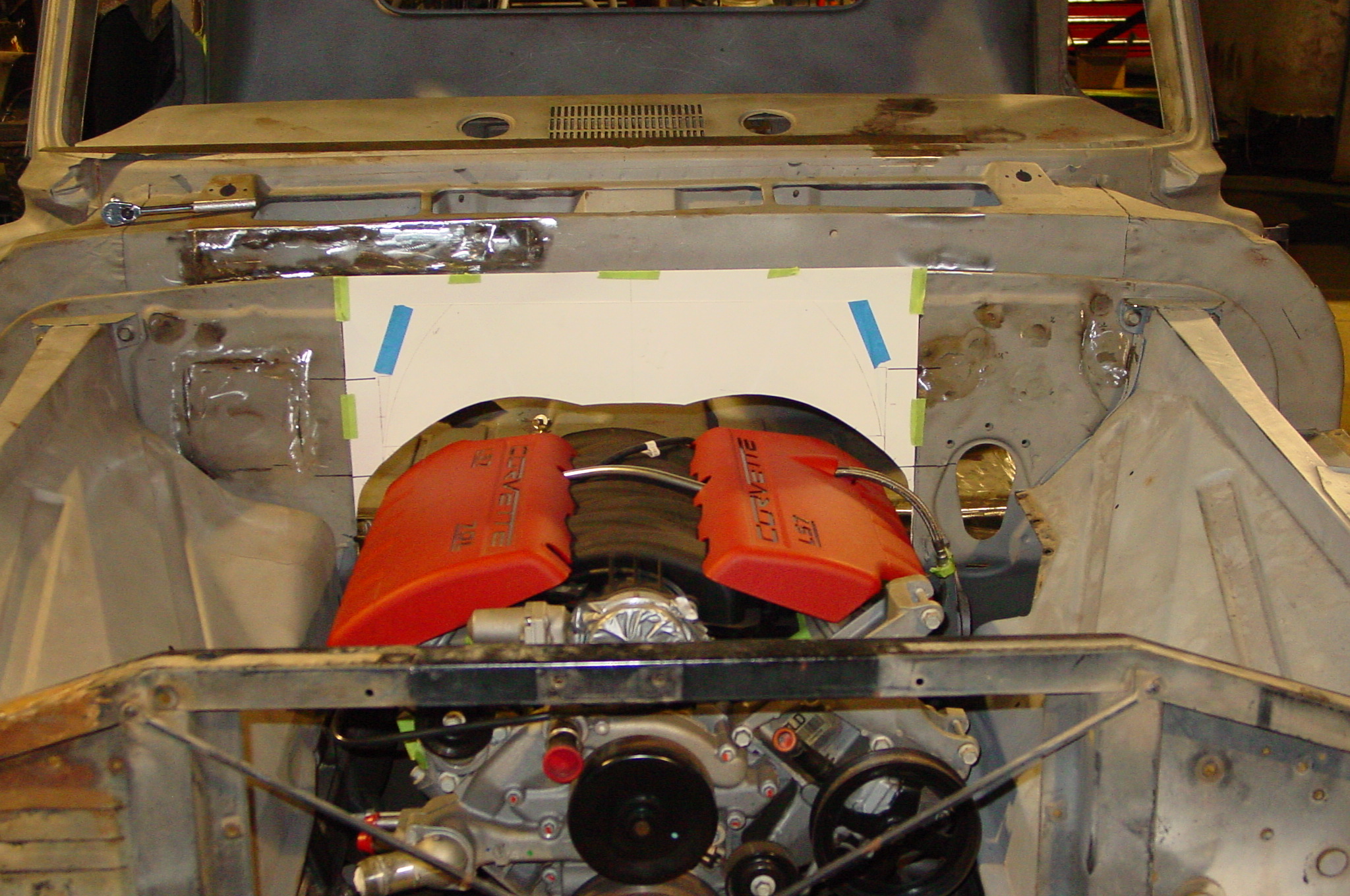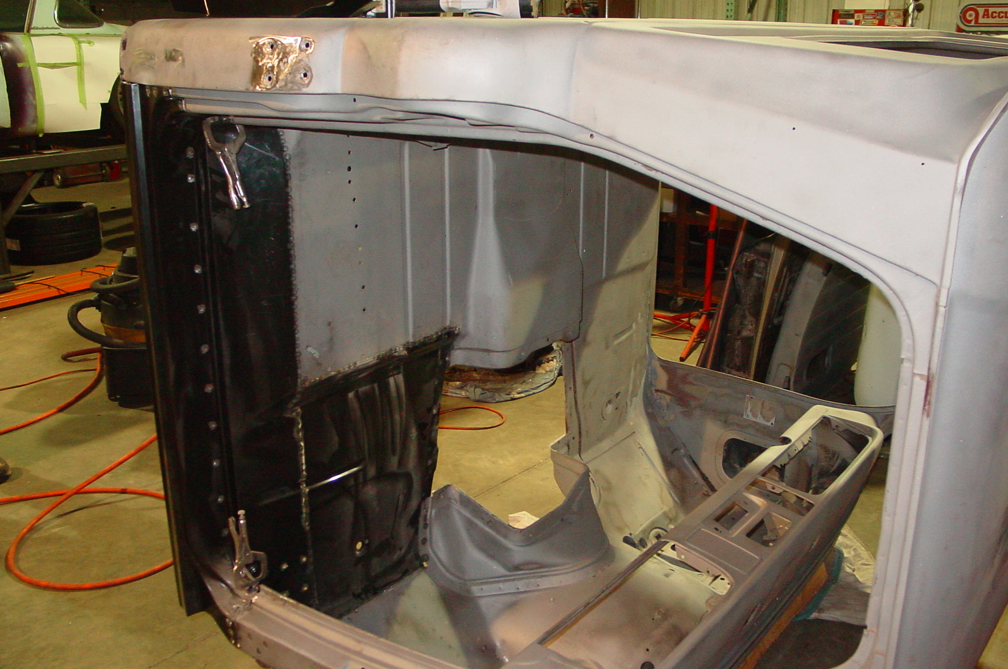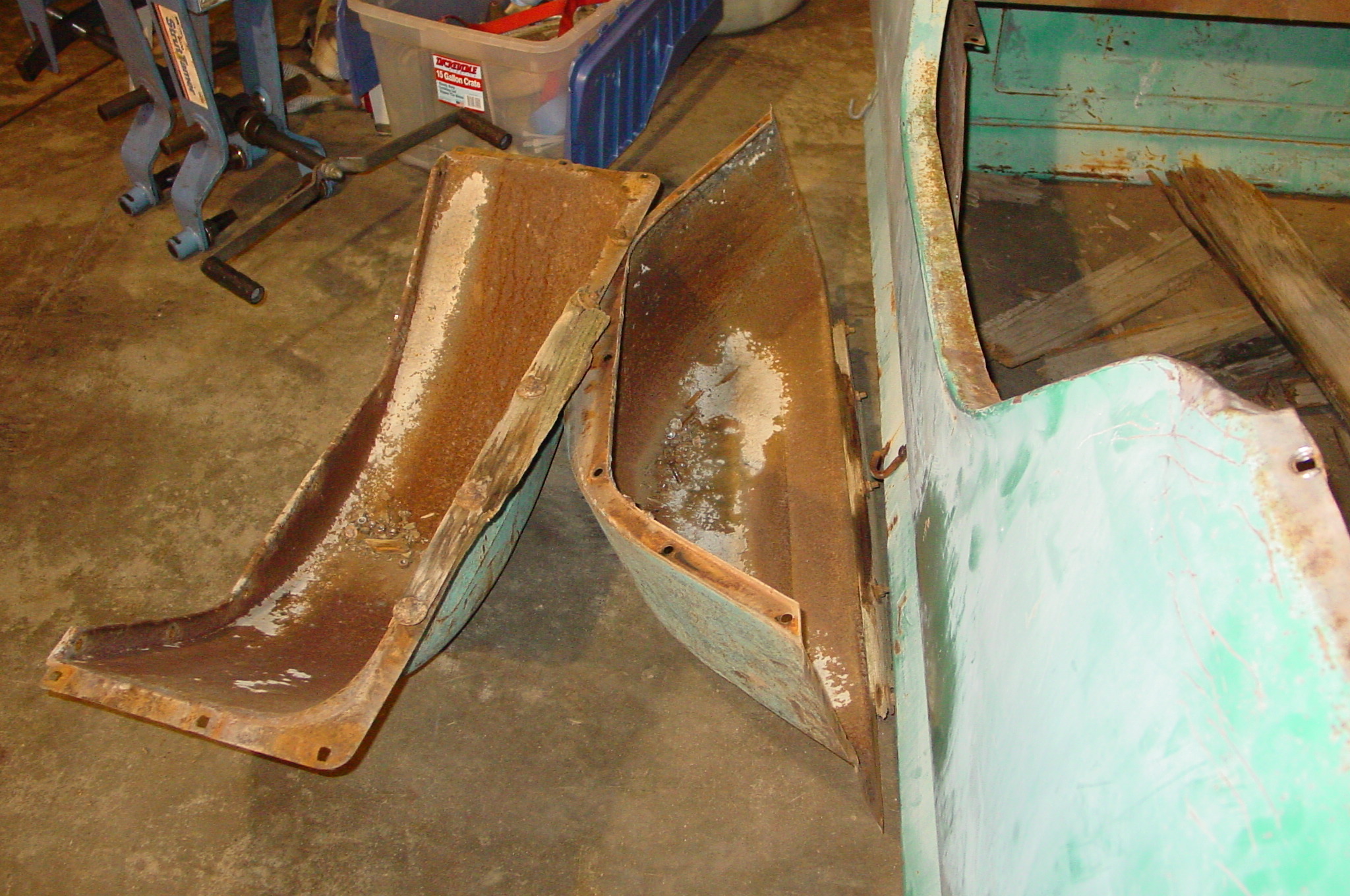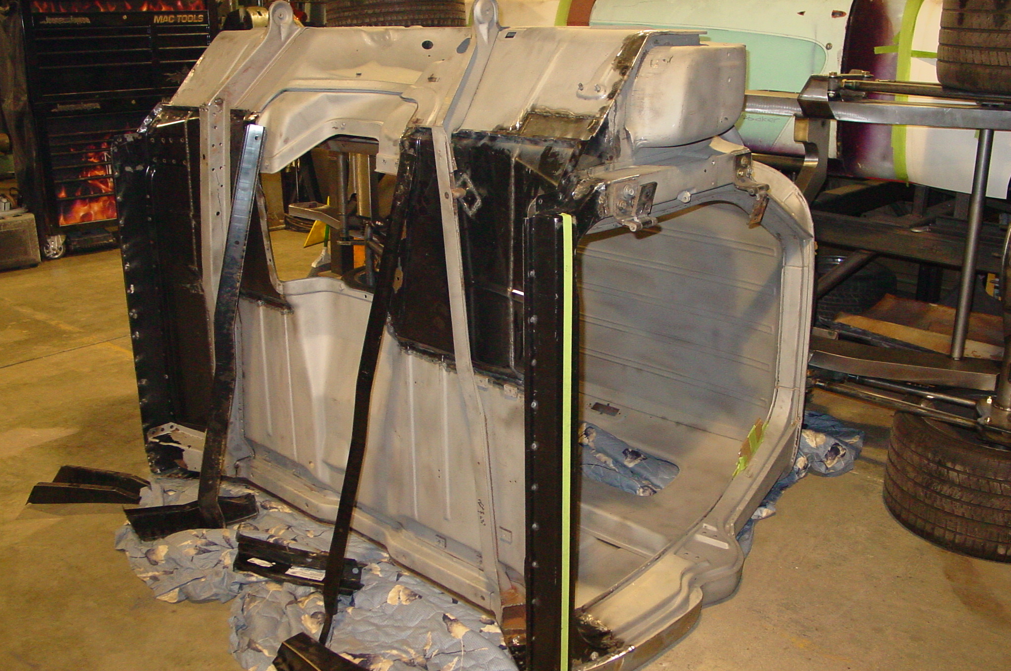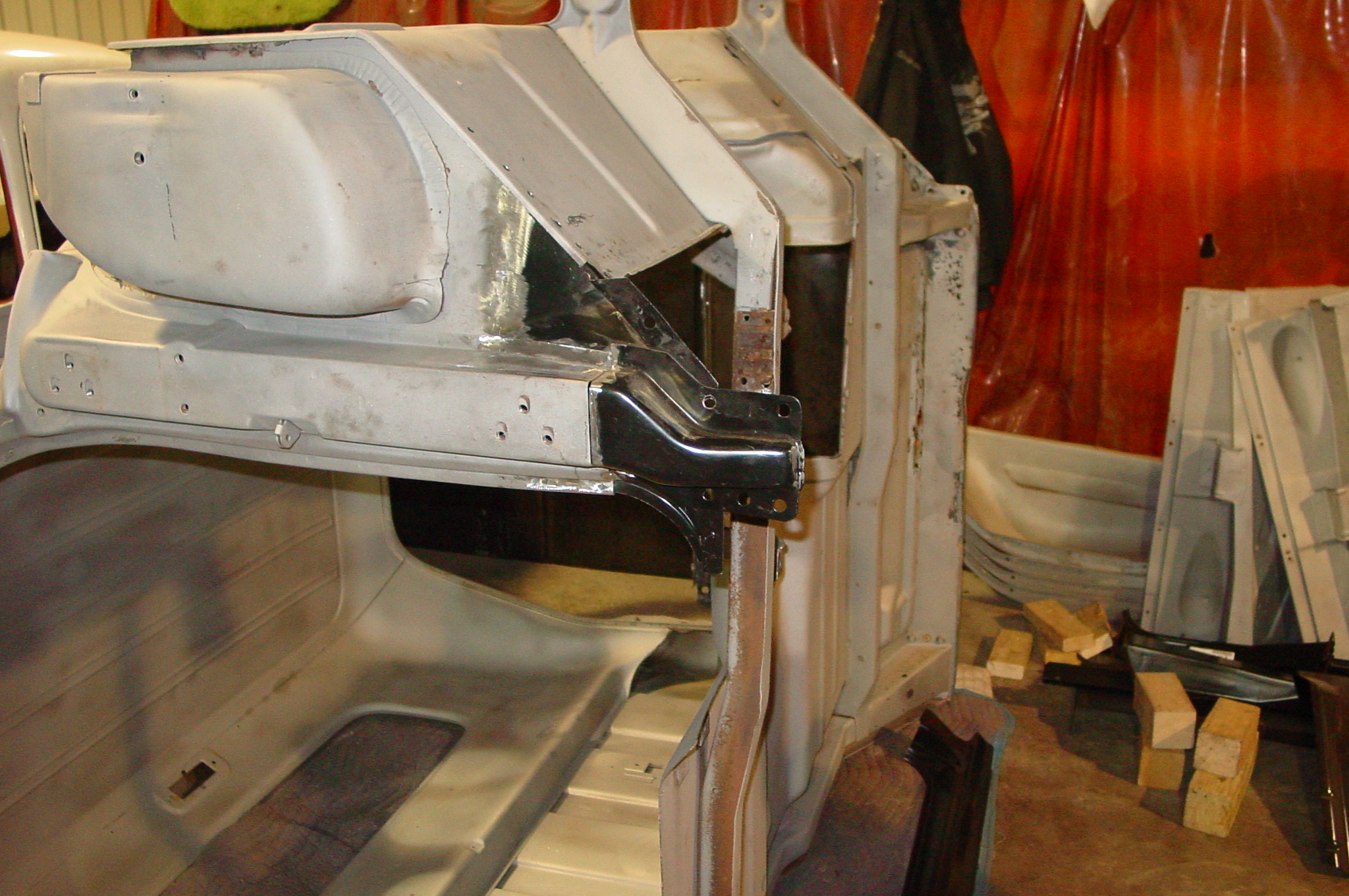 After blasting the old paint off we found a lot of filler over the rust holes. We removed the old rusted metal and replaced them with new steel. Now that the body is solid, the modifications have begun. -- Firewall, inner fenders, front fenders, front bumper, rear bumper, tailgate, and rear wheel opening.