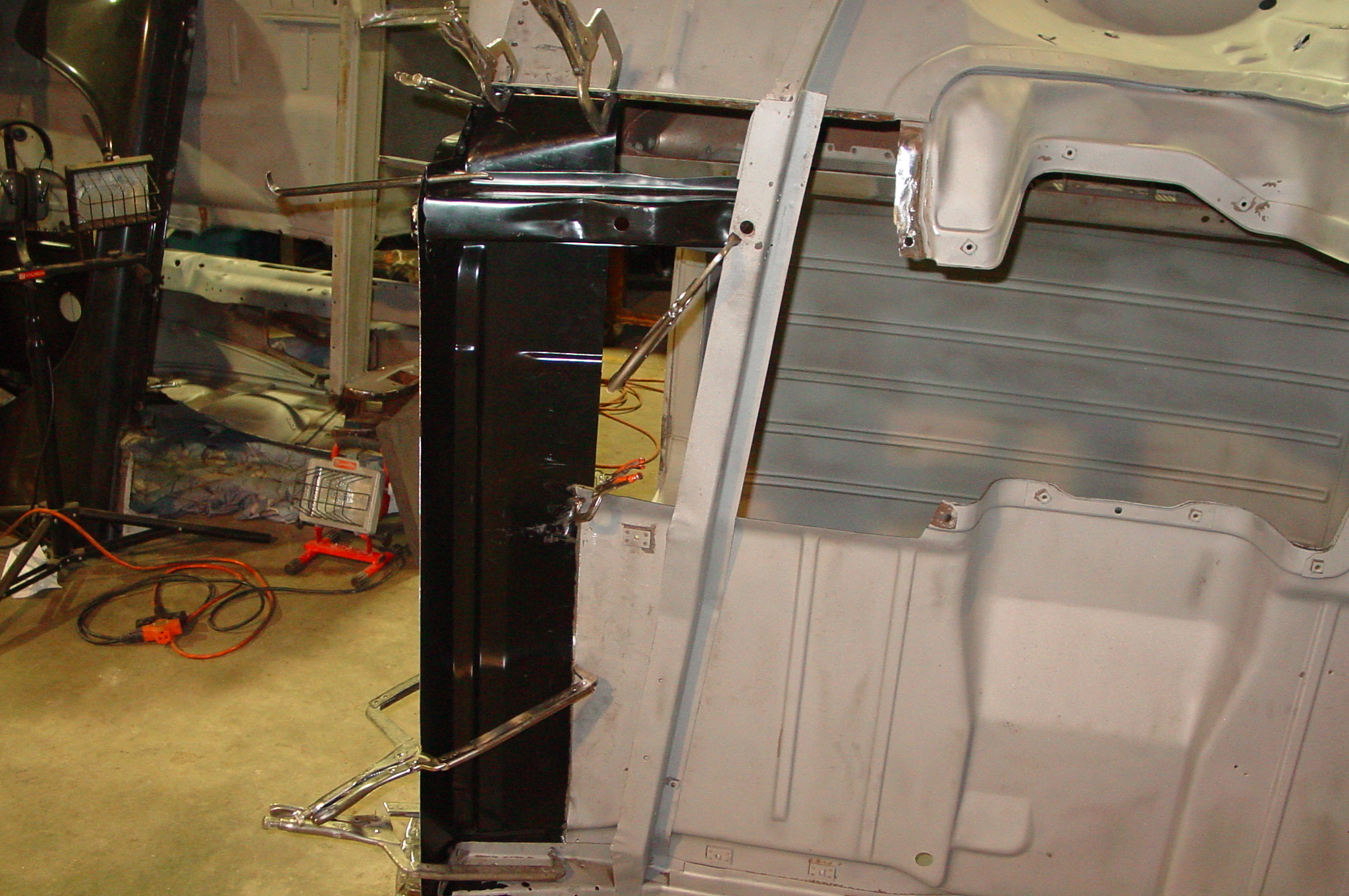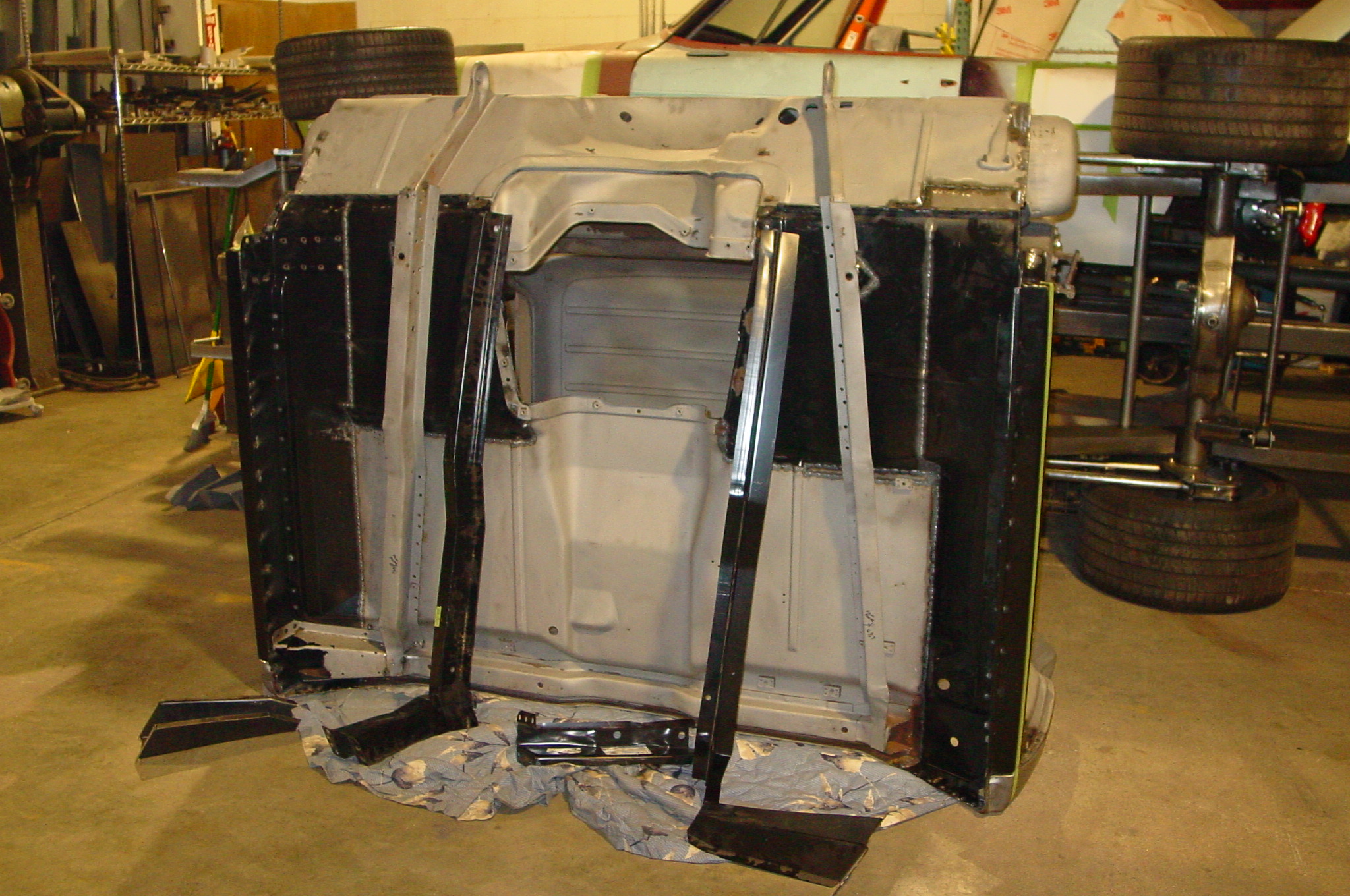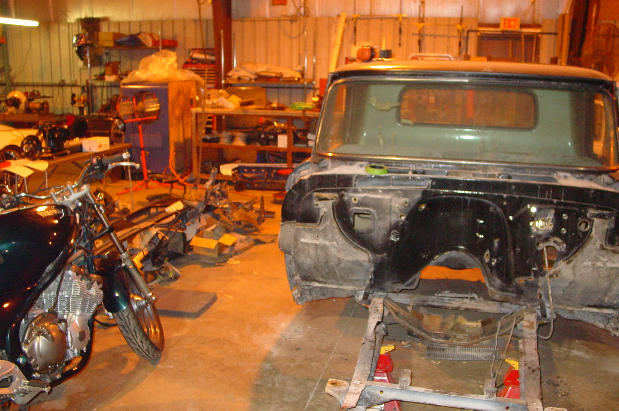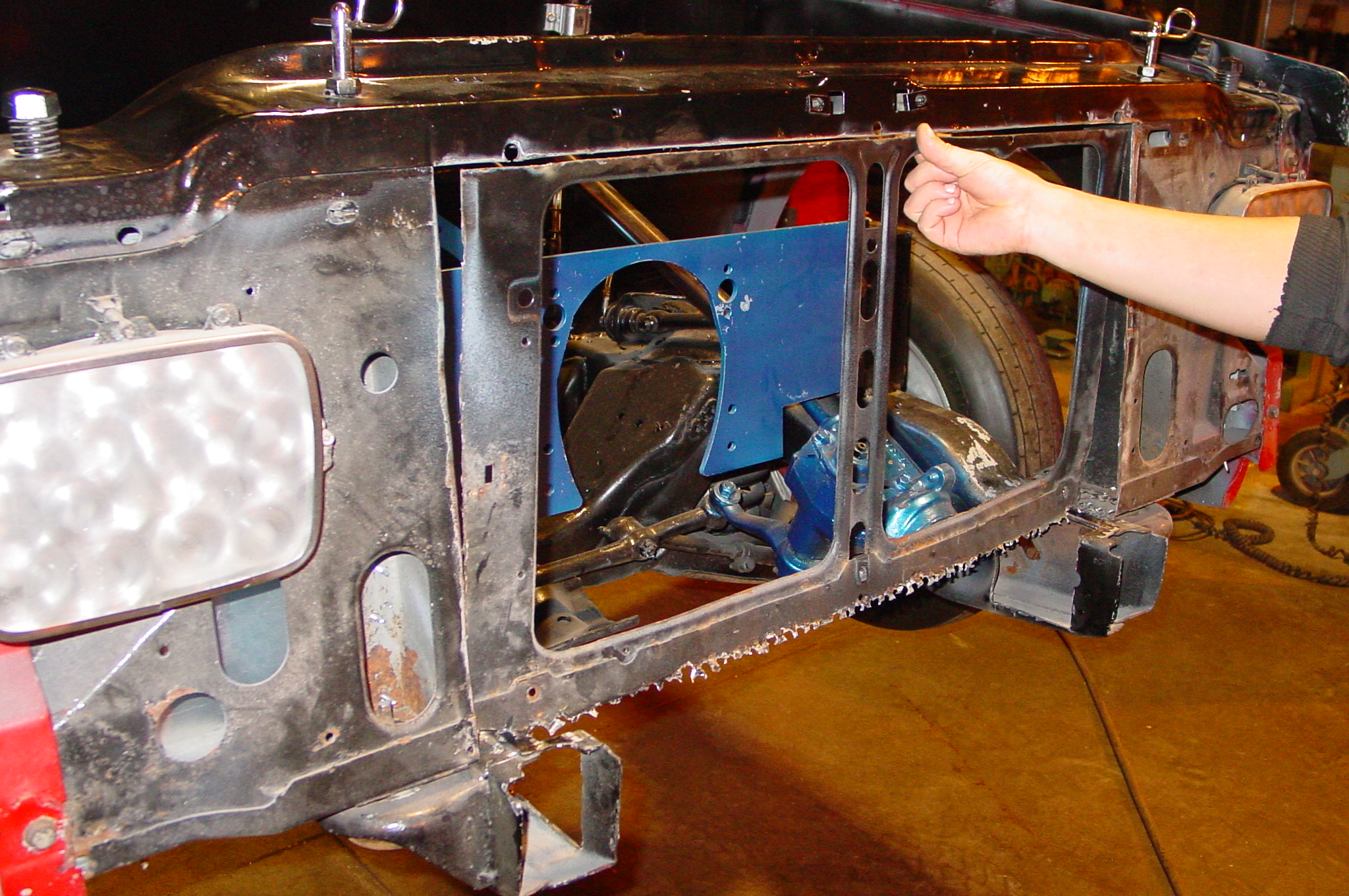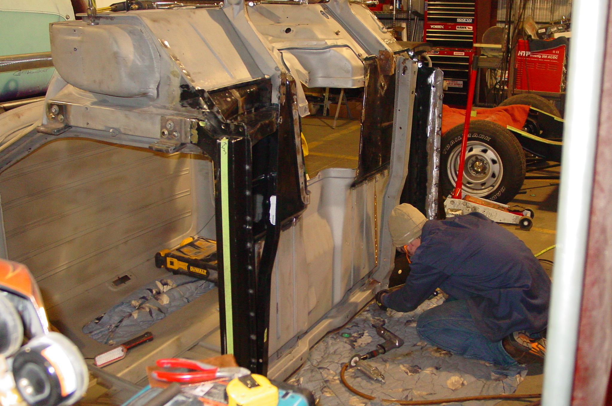 After blasting the old paint off we found a lot of filler over the rust holes. We removed the old rusted metal and replaced them with new steel. Now that the body is solid, the modifications have begun. -- Firewall, inner fenders, front fenders, front bumper, rear bumper, tailgate, and rear wheel opening.