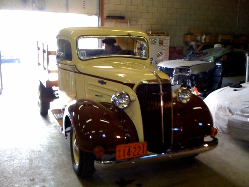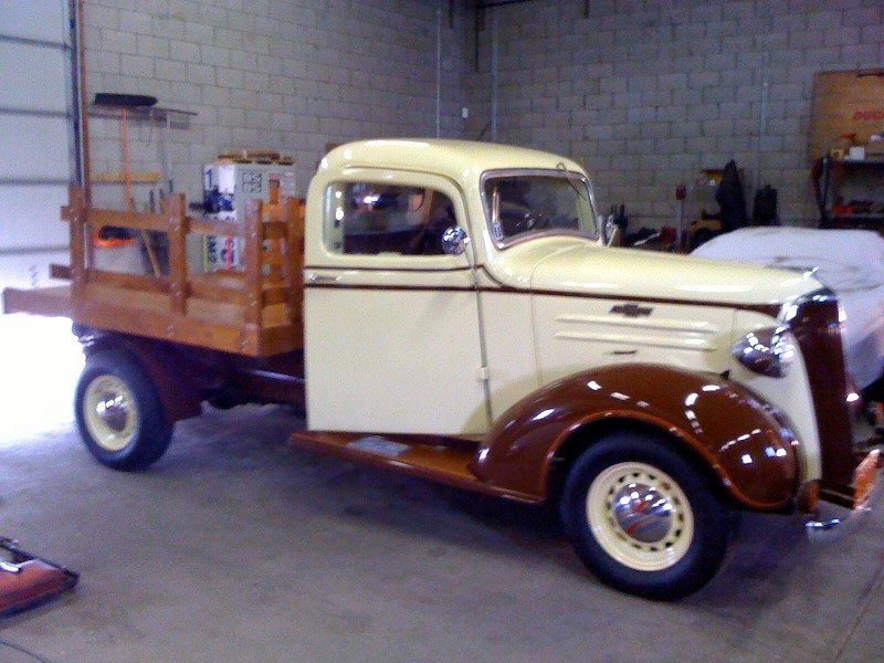 Installed dual master cylinder under the floor, stainless brake lines front to back with proportioning valve. Installed a 5-spd transmission behind the original 6cyl, using the original shifter.  Removed rear leaf springs. Removed the dumpbox hydraulic unit. Installed tube-style shocks on all four corners. Relocated the battery.  Converted the truck from 6 volt to 12 volt.  Neutral safety switch and backup lights were installed. Installed 3 point seat belts. Relocated the fuel tank from under the passenger compartment to under the bed.  All brackets, plumbing and fabrication were done to maintain an OEM feel.
